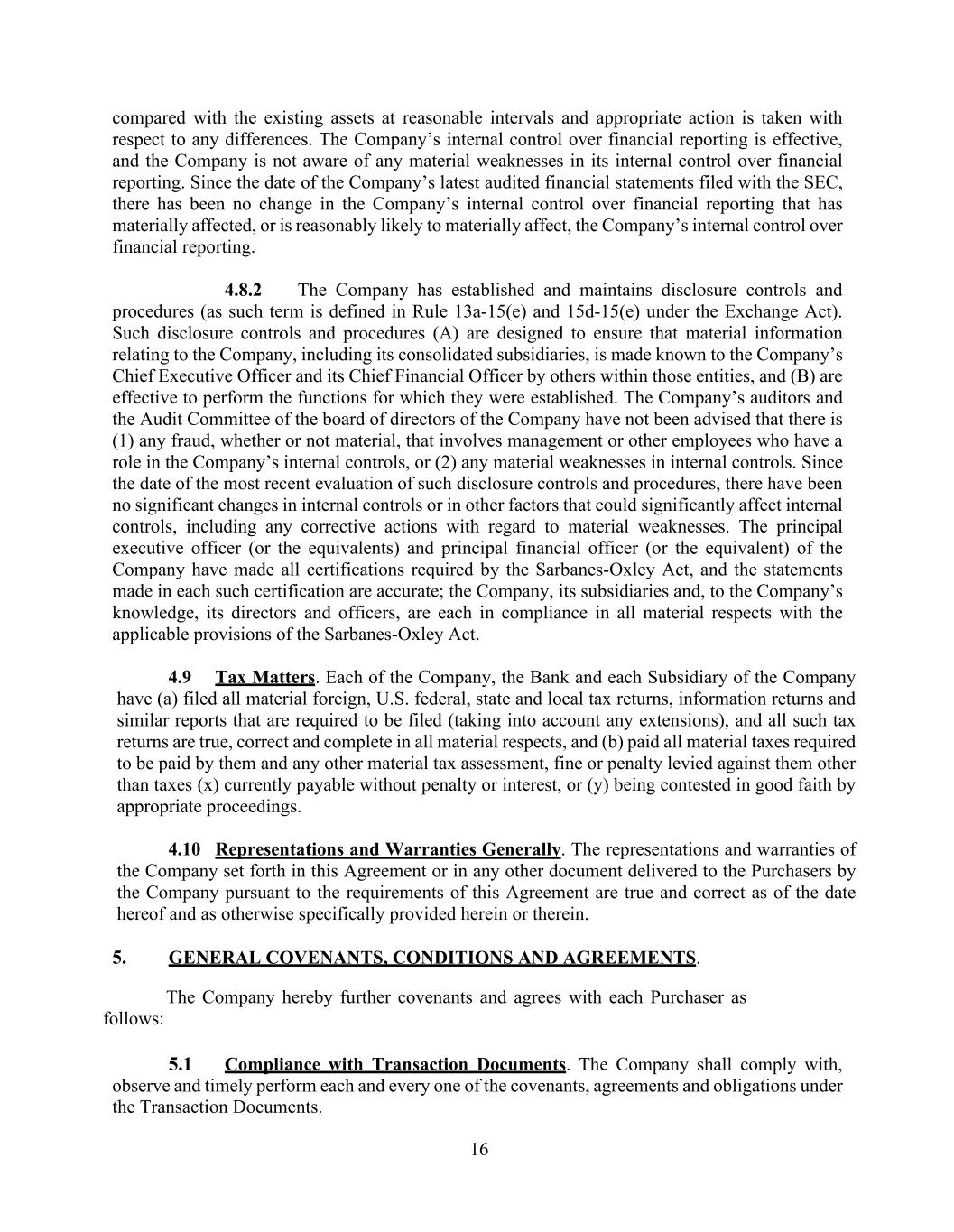16 compared with the existing assets at reasonable intervals and appropriate action is taken with respect to any differences. The Company’s internal control over financial reporting is effective, and the Company is not aware of any material weaknesses in its internal control over financial reporting. Since the date of the Company’s latest audited financial statements filed with the SEC, there has been no change in the Company’s internal control over financial reporting that has materially affected, or is reasonably likely to materially affect, the Company’s internal control over financial reporting. 4.8.2 The Company has established and maintains disclosure controls and procedures (as such term is defined in Rule 13a-15(e) and 15d-15(e) under the Exchange Act). Such disclosure controls and procedures (A) are designed to ensure that material information relating to the Company, including its consolidated subsidiaries, is made known to the Company’s Chief Executive Officer and its Chief Financial Officer by others within those entities, and (B) are effective to perform the functions for which they were established. The Company’s auditors and the Audit Committee of the board of directors of the Company have not been advised that there is (1) any fraud, whether or not material, that involves management or other employees who have a role in the Company’s internal controls, or (2) any material weaknesses in internal controls. Since the date of the most recent evaluation of such disclosure controls and procedures, there have been no significant changes in internal controls or in other factors that could significantly affect internal controls, including any corrective actions with regard to material weaknesses. The principal executive officer (or the equivalents) and principal financial officer (or the equivalent) of the Company have made all certifications required by the Sarbanes-Oxley Act, and the statements made in each such certification are accurate; the Company, its subsidiaries and, to the Company’s knowledge, its directors and officers, are each in compliance in all material respects with the applicable provisions of the Sarbanes-Oxley Act. 4.9 Tax Matters. Each of the Company, the Bank and each Subsidiary of the Company have (a) filed all material foreign, U.S. federal, state and local tax returns, information returns and similar reports that are required to be filed (taking into account any extensions), and all such tax returns are true, correct and complete in all material respects, and (b) paid all material taxes required to be paid by them and any other material tax assessment, fine or penalty levied against them other than taxes (x) currently payable without penalty or interest, or (y) being contested in good faith by appropriate proceedings. 4.10 Representations and Warranties Generally. The representations and warranties of the Company set forth in this Agreement or in any other document delivered to the Purchasers by the Company pursuant to the requirements of this Agreement are true and correct as of the date hereof and as otherwise specifically provided herein or therein. 5. GENERAL COVENANTS, CONDITIONS AND AGREEMENTS. The Company hereby further covenants and agrees with each Purchaser as follows: 5.1 Compliance with Transaction Documents. The Company shall comply with, observe and timely perform each and every one of the covenants, agreements and obligations under the Transaction Documents.