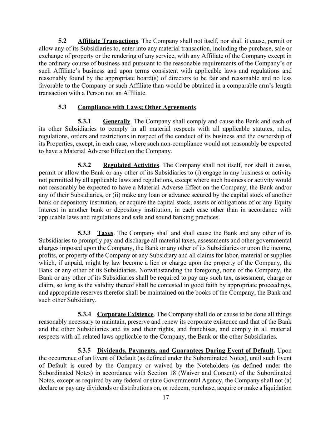 17 5.2 Affiliate Transactions. The Company shall not itself, nor shall it cause, permit or allow any of its Subsidiaries to, enter into any material transaction, including the purchase, sale or exchange of property or the rendering of any service, with any Affiliate of the Company except in the ordinary course of business and pursuant to the reasonable requirements of the Company’s or such Affiliate’s business and upon terms consistent with applicable laws and regulations and reasonably found by the appropriate board(s) of directors to be fair and reasonable and no less favorable to the Company or such Affiliate than would be obtained in a comparable arm’s length transaction with a Person not an Affiliate. 5.3 Compliance with Laws; Other Agreements. 5.3.1 Generally. The Company shall comply and cause the Bank and each of its other Subsidiaries to comply in all material respects with all applicable statutes, rules, regulations, orders and restrictions in respect of the conduct of its business and the ownership of its Properties, except, in each case, where such non-compliance would not reasonably be expected to have a Material Adverse Effect on the Company. 5.3.2 Regulated Activities. The Company shall not itself, nor shall it cause, permit or allow the Bank or any other of its Subsidiaries to (i) engage in any business or activity not permitted by all applicable laws and regulations, except where such business or activity would not reasonably be expected to have a Material Adverse Effect on the Company, the Bank and/or any of their Subsidiaries, or (ii) make any loan or advance secured by the capital stock of another bank or depository institution, or acquire the capital stock, assets or obligations of or any Equity Interest in another bank or depository institution, in each case other than in accordance with applicable laws and regulations and safe and sound banking practices. 5.3.3 Taxes. The Company shall and shall cause the Bank and any other of its Subsidiaries to promptly pay and discharge all material taxes, assessments and other governmental charges imposed upon the Company, the Bank or any other of its Subsidiaries or upon the income, profits, or property of the Company or any Subsidiary and all claims for labor, material or supplies which, if unpaid, might by law become a lien or charge upon the property of the Company, the Bank or any other of its Subsidiaries. Notwithstanding the foregoing, none of the Company, the Bank or any other of its Subsidiaries shall be required to pay any such tax, assessment, charge or claim, so long as the validity thereof shall be contested in good faith by appropriate proceedings, and appropriate reserves therefor shall be maintained on the books of the Company, the Bank and such other Subsidiary. 5.3.4 Corporate Existence. The Company shall do or cause to be done all things reasonably necessary to maintain, preserve and renew its corporate existence and that of the Bank and the other Subsidiaries and its and their rights, and franchises, and comply in all material respects with all related laws applicable to the Company, the Bank or the other Subsidiaries. 5.3.5 Dividends, Payments, and Guarantees During Event of Default. Upon the occurrence of an Event of Default (as defined under the Subordinated Notes), until such Event of Default is cured by the Company or waived by the Noteholders (as defined under the Subordinated Notes) in accordance with Section 18 (Waiver and Consent) of the Subordinated Notes, except as required by any federal or state Governmental Agency, the Company shall not (a) declare or pay any dividends or distributions on, or redeem, purchase, acquire or make a liquidation