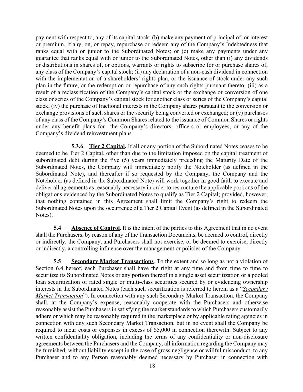 18 payment with respect to, any of its capital stock; (b) make any payment of principal of, or interest or premium, if any, on, or repay, repurchase or redeem any of the Company’s Indebtedness that ranks equal with or junior to the Subordinated Notes; or (c) make any payments under any guarantee that ranks equal with or junior to the Subordinated Notes, other than (i) any dividends or distributions in shares of, or options, warrants or rights to subscribe for or purchase shares of, any class of the Company’s capital stock; (ii) any declaration of a non-cash dividend in connection with the implementation of a shareholders’ rights plan, or the issuance of stock under any such plan in the future, or the redemption or repurchase of any such rights pursuant thereto; (iii) as a result of a reclassification of the Company’s capital stock or the exchange or conversion of one class or series of the Company’s capital stock for another class or series of the Company’s capital stock; (iv) the purchase of fractional interests in the Company shares pursuant to the conversion or exchange provisions of such shares or the security being converted or exchanged; or (v) purchases of any class of the Company’s Common Shares related to the issuance of Common Shares or rights under any benefit plans for the Company’s directors, officers or employees, or any of the Company’s dividend reinvestment plans. 5.3.6 Tier 2 Capital. If all or any portion of the Subordinated Notes ceases to be deemed to be Tier 2 Capital, other than due to the limitation imposed on the capital treatment of subordinated debt during the five (5) years immediately preceding the Maturity Date of the Subordinated Notes, the Company will immediately notify the Noteholder (as defined in the Subordinated Note), and thereafter if so requested by the Company, the Company and the Noteholder (as defined in the Subordinated Note) will work together in good faith to execute and deliver all agreements as reasonably necessary in order to restructure the applicable portions of the obligations evidenced by the Subordinated Notes to qualify as Tier 2 Capital; provided, however, that nothing contained in this Agreement shall limit the Company’s right to redeem the Subordinated Notes upon the occurrence of a Tier 2 Capital Event (as defined in the Subordinated Notes). 5.4 Absence of Control. It is the intent of the parties to this Agreement that in no event shall the Purchasers, by reason of any of the Transaction Documents, be deemed to control, directly or indirectly, the Company, and Purchasers shall not exercise, or be deemed to exercise, directly or indirectly, a controlling influence over the management or policies of the Company. 5.5 Secondary Market Transactions. To the extent and so long as not a violation of Section 6.4 hereof, each Purchaser shall have the right at any time and from time to time to securitize its Subordinated Notes or any portion thereof in a single asset securitization or a pooled loan securitization of rated single or multi-class securities secured by or evidencing ownership interests in the Subordinated Notes (each such securitization is referred to herein as a “Secondary Market Transaction”). In connection with any such Secondary Market Transaction, the Company shall, at the Company’s expense, reasonably cooperate with the Purchasers and otherwise reasonably assist the Purchasers in satisfying the market standards to which Purchasers customarily adhere or which may be reasonably required in the marketplace or by applicable rating agencies in connection with any such Secondary Market Transaction, but in no event shall the Company be required to incur costs or expenses in excess of $5,000 in connection therewith. Subject to any written confidentiality obligation, including the terms of any confidentiality or non-disclosure agreements between the Purchasers and the Company, all information regarding the Company may be furnished, without liability except in the case of gross negligence or willful misconduct, to any Purchaser and to any Person reasonably deemed necessary by Purchaser in connection with