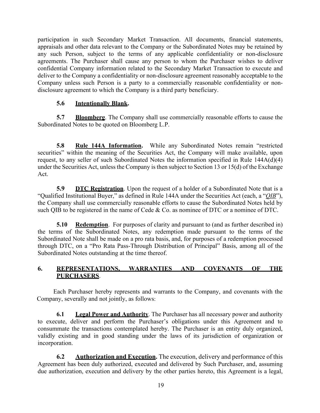 19 participation in such Secondary Market Transaction. All documents, financial statements, appraisals and other data relevant to the Company or the Subordinated Notes may be retained by any such Person, subject to the terms of any applicable confidentiality or non-disclosure agreements. The Purchaser shall cause any person to whom the Purchaser wishes to deliver confidential Company information related to the Secondary Market Transaction to execute and deliver to the Company a confidentiality or non-disclosure agreement reasonably acceptable to the Company unless such Person is a party to a commercially reasonable confidentiality or non- disclosure agreement to which the Company is a third party beneficiary. 5.6 Intentionally Blank. 5.7 Bloomberg. The Company shall use commercially reasonable efforts to cause the Subordinated Notes to be quoted on Bloomberg L.P. 5.8 Rule 144A Information. While any Subordinated Notes remain “restricted securities” within the meaning of the Securities Act, the Company will make available, upon request, to any seller of such Subordinated Notes the information specified in Rule 144A(d)(4) under the Securities Act, unless the Company is then subject to Section 13 or 15(d) of the Exchange Act. 5.9 DTC Registration. Upon the request of a holder of a Subordinated Note that is a “Qualified Institutional Buyer,” as defined in Rule 144A under the Securities Act (each, a “QIB”), the Company shall use commercially reasonable efforts to cause the Subordinated Notes held by such QIB to be registered in the name of Cede & Co. as nominee of DTC or a nominee of DTC. 5.10 Redemption. For purposes of clarity and pursuant to (and as further described in) the terms of the Subordinated Notes, any redemption made pursuant to the terms of the Subordinated Note shall be made on a pro rata basis, and, for purposes of a redemption processed through DTC, on a “Pro Rata Pass-Through Distribution of Principal” Basis, among all of the Subordinated Notes outstanding at the time thereof. 6. REPRESENTATIONS, WARRANTIES AND COVENANTS OF THE PURCHASERS. Each Purchaser hereby represents and warrants to the Company, and covenants with the Company, severally and not jointly, as follows: 6.1 Legal Power and Authority. The Purchaser has all necessary power and authority to execute, deliver and perform the Purchaser’s obligations under this Agreement and to consummate the transactions contemplated hereby. The Purchaser is an entity duly organized, validly existing and in good standing under the laws of its jurisdiction of organization or incorporation. 6.2 Authorization and Execution. The execution, delivery and performance of this Agreement has been duly authorized, executed and delivered by Such Purchaser, and, assuming due authorization, execution and delivery by the other parties hereto, this Agreement is a legal,