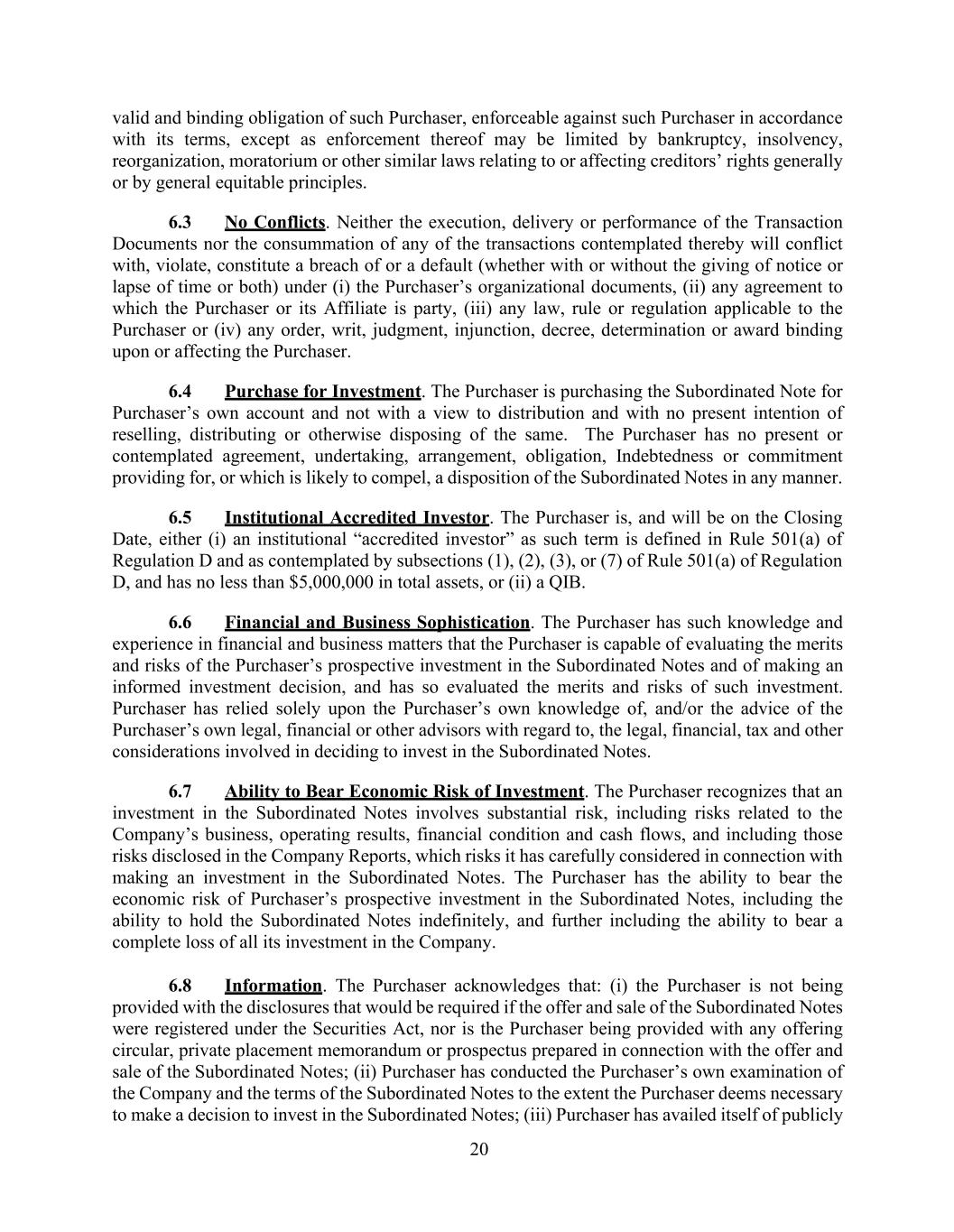 20 valid and binding obligation of such Purchaser, enforceable against such Purchaser in accordance with its terms, except as enforcement thereof may be limited by bankruptcy, insolvency, reorganization, moratorium or other similar laws relating to or affecting creditors’ rights generally or by general equitable principles. 6.3 No Conflicts. Neither the execution, delivery or performance of the Transaction Documents nor the consummation of any of the transactions contemplated thereby will conflict with, violate, constitute a breach of or a default (whether with or without the giving of notice or lapse of time or both) under (i) the Purchaser’s organizational documents, (ii) any agreement to which the Purchaser or its Affiliate is party, (iii) any law, rule or regulation applicable to the Purchaser or (iv) any order, writ, judgment, injunction, decree, determination or award binding upon or affecting the Purchaser. 6.4 Purchase for Investment. The Purchaser is purchasing the Subordinated Note for Purchaser’s own account and not with a view to distribution and with no present intention of reselling, distributing or otherwise disposing of the same. The Purchaser has no present or contemplated agreement, undertaking, arrangement, obligation, Indebtedness or commitment providing for, or which is likely to compel, a disposition of the Subordinated Notes in any manner. 6.5 Institutional Accredited Investor. The Purchaser is, and will be on the Closing Date, either (i) an institutional “accredited investor” as such term is defined in Rule 501(a) of Regulation D and as contemplated by subsections (1), (2), (3), or (7) of Rule 501(a) of Regulation D, and has no less than $5,000,000 in total assets, or (ii) a QIB. 6.6 Financial and Business Sophistication. The Purchaser has such knowledge and experience in financial and business matters that the Purchaser is capable of evaluating the merits and risks of the Purchaser’s prospective investment in the Subordinated Notes and of making an informed investment decision, and has so evaluated the merits and risks of such investment. Purchaser has relied solely upon the Purchaser’s own knowledge of, and/or the advice of the Purchaser’s own legal, financial or other advisors with regard to, the legal, financial, tax and other considerations involved in deciding to invest in the Subordinated Notes. 6.7 Ability to Bear Economic Risk of Investment. The Purchaser recognizes that an investment in the Subordinated Notes involves substantial risk, including risks related to the Company’s business, operating results, financial condition and cash flows, and including those risks disclosed in the Company Reports, which risks it has carefully considered in connection with making an investment in the Subordinated Notes. The Purchaser has the ability to bear the economic risk of Purchaser’s prospective investment in the Subordinated Notes, including the ability to hold the Subordinated Notes indefinitely, and further including the ability to bear a complete loss of all its investment in the Company. 6.8 Information. The Purchaser acknowledges that: (i) the Purchaser is not being provided with the disclosures that would be required if the offer and sale of the Subordinated Notes were registered under the Securities Act, nor is the Purchaser being provided with any offering circular, private placement memorandum or prospectus prepared in connection with the offer and sale of the Subordinated Notes; (ii) Purchaser has conducted the Purchaser’s own examination of the Company and the terms of the Subordinated Notes to the extent the Purchaser deems necessary to make a decision to invest in the Subordinated Notes; (iii) Purchaser has availed itself of publicly