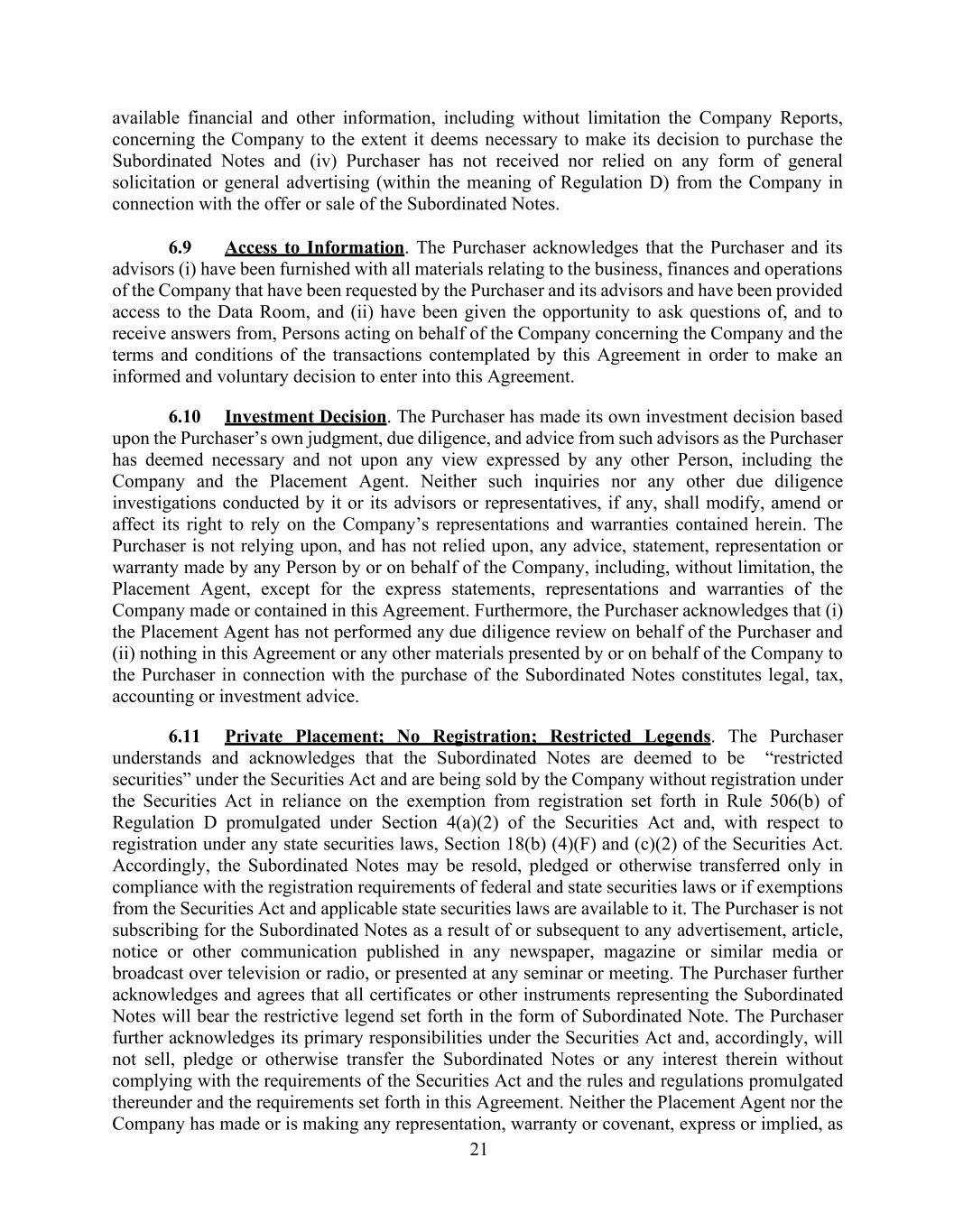 21 available financial and other information, including without limitation the Company Reports, concerning the Company to the extent it deems necessary to make its decision to purchase the Subordinated Notes and (iv) Purchaser has not received nor relied on any form of general solicitation or general advertising (within the meaning of Regulation D) from the Company in connection with the offer or sale of the Subordinated Notes. 6.9 Access to Information. The Purchaser acknowledges that the Purchaser and its advisors (i) have been furnished with all materials relating to the business, finances and operations of the Company that have been requested by the Purchaser and its advisors and have been provided access to the Data Room, and (ii) have been given the opportunity to ask questions of, and to receive answers from, Persons acting on behalf of the Company concerning the Company and the terms and conditions of the transactions contemplated by this Agreement in order to make an informed and voluntary decision to enter into this Agreement. 6.10 Investment Decision. The Purchaser has made its own investment decision based upon the Purchaser’s own judgment, due diligence, and advice from such advisors as the Purchaser has deemed necessary and not upon any view expressed by any other Person, including the Company and the Placement Agent. Neither such inquiries nor any other due diligence investigations conducted by it or its advisors or representatives, if any, shall modify, amend or affect its right to rely on the Company’s representations and warranties contained herein. The Purchaser is not relying upon, and has not relied upon, any advice, statement, representation or warranty made by any Person by or on behalf of the Company, including, without limitation, the Placement Agent, except for the express statements, representations and warranties of the Company made or contained in this Agreement. Furthermore, the Purchaser acknowledges that (i) the Placement Agent has not performed any due diligence review on behalf of the Purchaser and (ii) nothing in this Agreement or any other materials presented by or on behalf of the Company to the Purchaser in connection with the purchase of the Subordinated Notes constitutes legal, tax, accounting or investment advice. 6.11 Private Placement; No Registration; Restricted Legends. The Purchaser understands and acknowledges that the Subordinated Notes are deemed to be “restricted securities” under the Securities Act and are being sold by the Company without registration under the Securities Act in reliance on the exemption from registration set forth in Rule 506(b) of Regulation D promulgated under Section 4(a)(2) of the Securities Act and, with respect to registration under any state securities laws, Section 18(b) (4)(F) and (c)(2) of the Securities Act. Accordingly, the Subordinated Notes may be resold, pledged or otherwise transferred only in compliance with the registration requirements of federal and state securities laws or if exemptions from the Securities Act and applicable state securities laws are available to it. The Purchaser is not subscribing for the Subordinated Notes as a result of or subsequent to any advertisement, article, notice or other communication published in any newspaper, magazine or similar media or broadcast over television or radio, or presented at any seminar or meeting. The Purchaser further acknowledges and agrees that all certificates or other instruments representing the Subordinated Notes will bear the restrictive legend set forth in the form of Subordinated Note. The Purchaser further acknowledges its primary responsibilities under the Securities Act and, accordingly, will not sell, pledge or otherwise transfer the Subordinated Notes or any interest therein without complying with the requirements of the Securities Act and the rules and regulations promulgated thereunder and the requirements set forth in this Agreement. Neither the Placement Agent nor the Company has made or is making any representation, warranty or covenant, express or implied, as