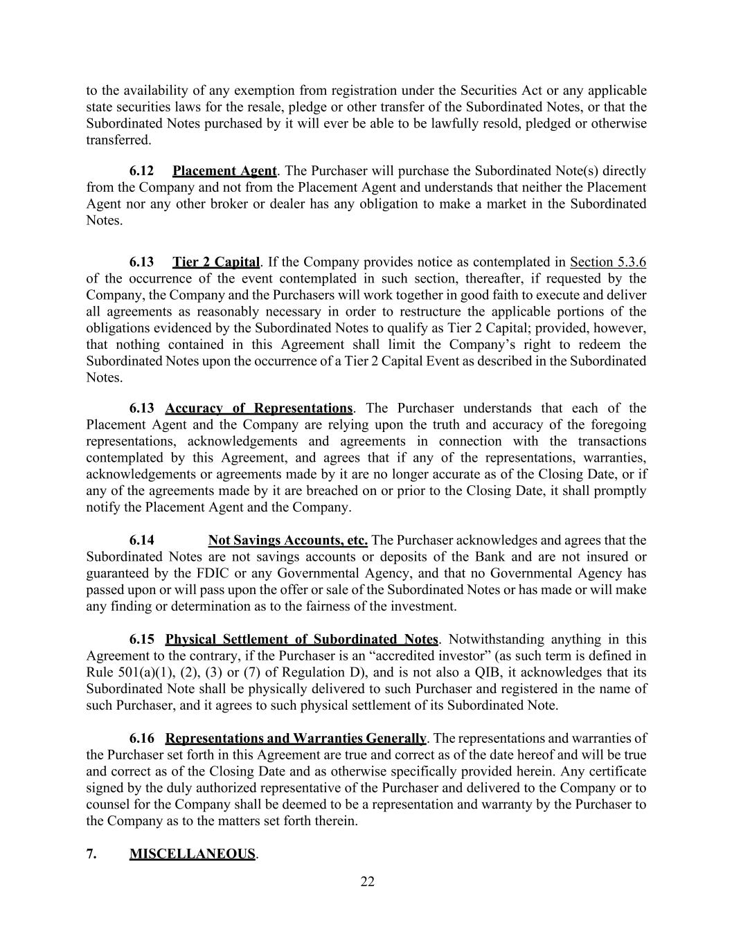 22 to the availability of any exemption from registration under the Securities Act or any applicable state securities laws for the resale, pledge or other transfer of the Subordinated Notes, or that the Subordinated Notes purchased by it will ever be able to be lawfully resold, pledged or otherwise transferred. 6.12 Placement Agent. The Purchaser will purchase the Subordinated Note(s) directly from the Company and not from the Placement Agent and understands that neither the Placement Agent nor any other broker or dealer has any obligation to make a market in the Subordinated Notes. 6.13 Tier 2 Capital. If the Company provides notice as contemplated in Section 5.3.6 of the occurrence of the event contemplated in such section, thereafter, if requested by the Company, the Company and the Purchasers will work together in good faith to execute and deliver all agreements as reasonably necessary in order to restructure the applicable portions of the obligations evidenced by the Subordinated Notes to qualify as Tier 2 Capital; provided, however, that nothing contained in this Agreement shall limit the Company’s right to redeem the Subordinated Notes upon the occurrence of a Tier 2 Capital Event as described in the Subordinated Notes. 6.13 Accuracy of Representations. The Purchaser understands that each of the Placement Agent and the Company are relying upon the truth and accuracy of the foregoing representations, acknowledgements and agreements in connection with the transactions contemplated by this Agreement, and agrees that if any of the representations, warranties, acknowledgements or agreements made by it are no longer accurate as of the Closing Date, or if any of the agreements made by it are breached on or prior to the Closing Date, it shall promptly notify the Placement Agent and the Company. 6.14 Not Savings Accounts, etc. The Purchaser acknowledges and agrees that the Subordinated Notes are not savings accounts or deposits of the Bank and are not insured or guaranteed by the FDIC or any Governmental Agency, and that no Governmental Agency has passed upon or will pass upon the offer or sale of the Subordinated Notes or has made or will make any finding or determination as to the fairness of the investment. 6.15 Physical Settlement of Subordinated Notes. Notwithstanding anything in this Agreement to the contrary, if the Purchaser is an “accredited investor” (as such term is defined in Rule 501(a)(1), (2), (3) or (7) of Regulation D), and is not also a QIB, it acknowledges that its Subordinated Note shall be physically delivered to such Purchaser and registered in the name of such Purchaser, and it agrees to such physical settlement of its Subordinated Note. 6.16 Representations and Warranties Generally. The representations and warranties of the Purchaser set forth in this Agreement are true and correct as of the date hereof and will be true and correct as of the Closing Date and as otherwise specifically provided herein. Any certificate signed by the duly authorized representative of the Purchaser and delivered to the Company or to counsel for the Company shall be deemed to be a representation and warranty by the Purchaser to the Company as to the matters set forth therein. 7. MISCELLANEOUS.