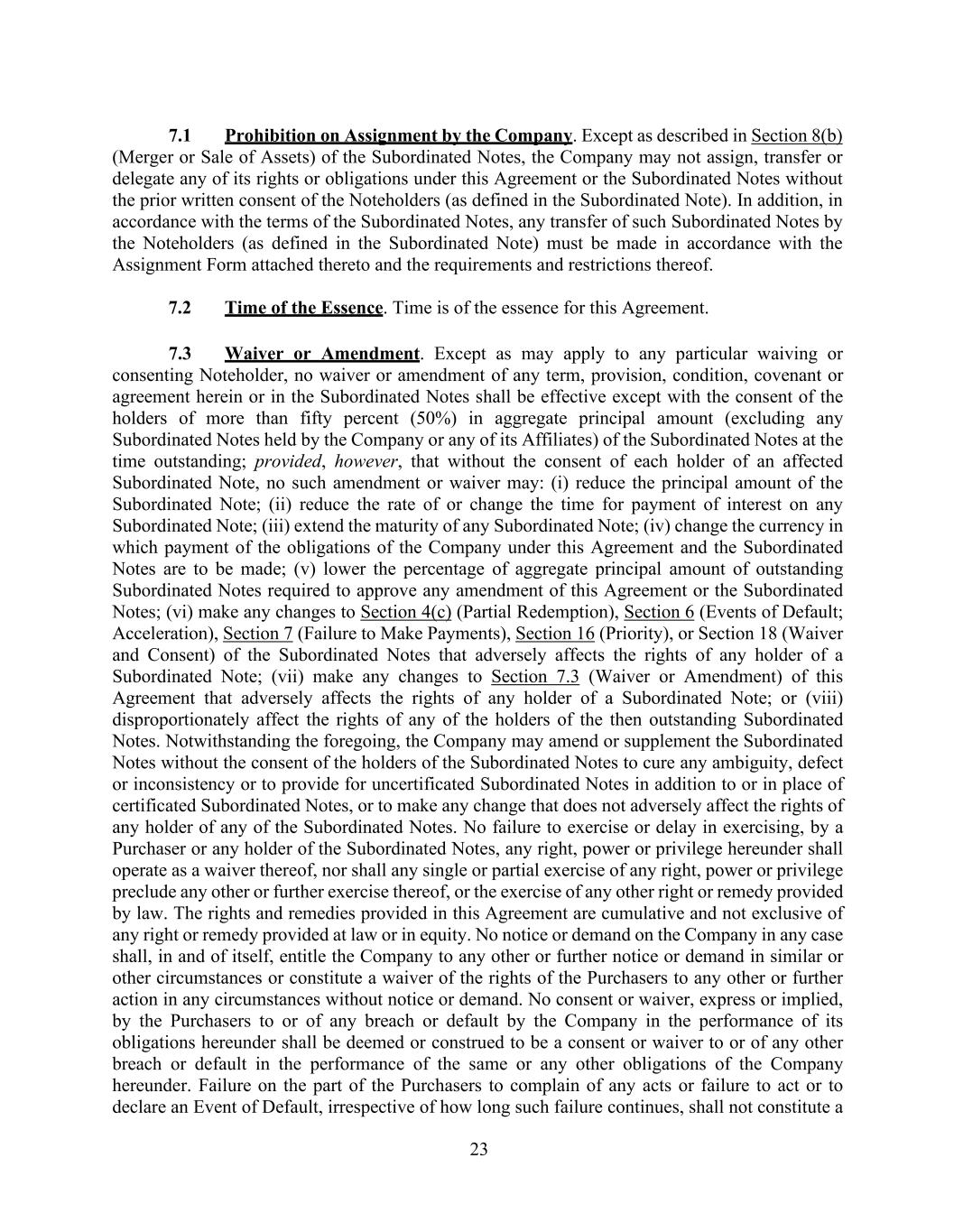 23 7.1 Prohibition on Assignment by the Company. Except as described in Section 8(b) (Merger or Sale of Assets) of the Subordinated Notes, the Company may not assign, transfer or delegate any of its rights or obligations under this Agreement or the Subordinated Notes without the prior written consent of the Noteholders (as defined in the Subordinated Note). In addition, in accordance with the terms of the Subordinated Notes, any transfer of such Subordinated Notes by the Noteholders (as defined in the Subordinated Note) must be made in accordance with the Assignment Form attached thereto and the requirements and restrictions thereof. 7.2 Time of the Essence. Time is of the essence for this Agreement. 7.3 Waiver or Amendment. Except as may apply to any particular waiving or consenting Noteholder, no waiver or amendment of any term, provision, condition, covenant or agreement herein or in the Subordinated Notes shall be effective except with the consent of the holders of more than fifty percent (50%) in aggregate principal amount (excluding any Subordinated Notes held by the Company or any of its Affiliates) of the Subordinated Notes at the time outstanding; provided, however, that without the consent of each holder of an affected Subordinated Note, no such amendment or waiver may: (i) reduce the principal amount of the Subordinated Note; (ii) reduce the rate of or change the time for payment of interest on any Subordinated Note; (iii) extend the maturity of any Subordinated Note; (iv) change the currency in which payment of the obligations of the Company under this Agreement and the Subordinated Notes are to be made; (v) lower the percentage of aggregate principal amount of outstanding Subordinated Notes required to approve any amendment of this Agreement or the Subordinated Notes; (vi) make any changes to Section 4(c) (Partial Redemption), Section 6 (Events of Default; Acceleration), Section 7 (Failure to Make Payments), Section 16 (Priority), or Section 18 (Waiver and Consent) of the Subordinated Notes that adversely affects the rights of any holder of a Subordinated Note; (vii) make any changes to Section 7.3 (Waiver or Amendment) of this Agreement that adversely affects the rights of any holder of a Subordinated Note; or (viii) disproportionately affect the rights of any of the holders of the then outstanding Subordinated Notes. Notwithstanding the foregoing, the Company may amend or supplement the Subordinated Notes without the consent of the holders of the Subordinated Notes to cure any ambiguity, defect or inconsistency or to provide for uncertificated Subordinated Notes in addition to or in place of certificated Subordinated Notes, or to make any change that does not adversely affect the rights of any holder of any of the Subordinated Notes. No failure to exercise or delay in exercising, by a Purchaser or any holder of the Subordinated Notes, any right, power or privilege hereunder shall operate as a waiver thereof, nor shall any single or partial exercise of any right, power or privilege preclude any other or further exercise thereof, or the exercise of any other right or remedy provided by law. The rights and remedies provided in this Agreement are cumulative and not exclusive of any right or remedy provided at law or in equity. No notice or demand on the Company in any case shall, in and of itself, entitle the Company to any other or further notice or demand in similar or other circumstances or constitute a waiver of the rights of the Purchasers to any other or further action in any circumstances without notice or demand. No consent or waiver, express or implied, by the Purchasers to or of any breach or default by the Company in the performance of its obligations hereunder shall be deemed or construed to be a consent or waiver to or of any other breach or default in the performance of the same or any other obligations of the Company hereunder. Failure on the part of the Purchasers to complain of any acts or failure to act or to declare an Event of Default, irrespective of how long such failure continues, shall not constitute a