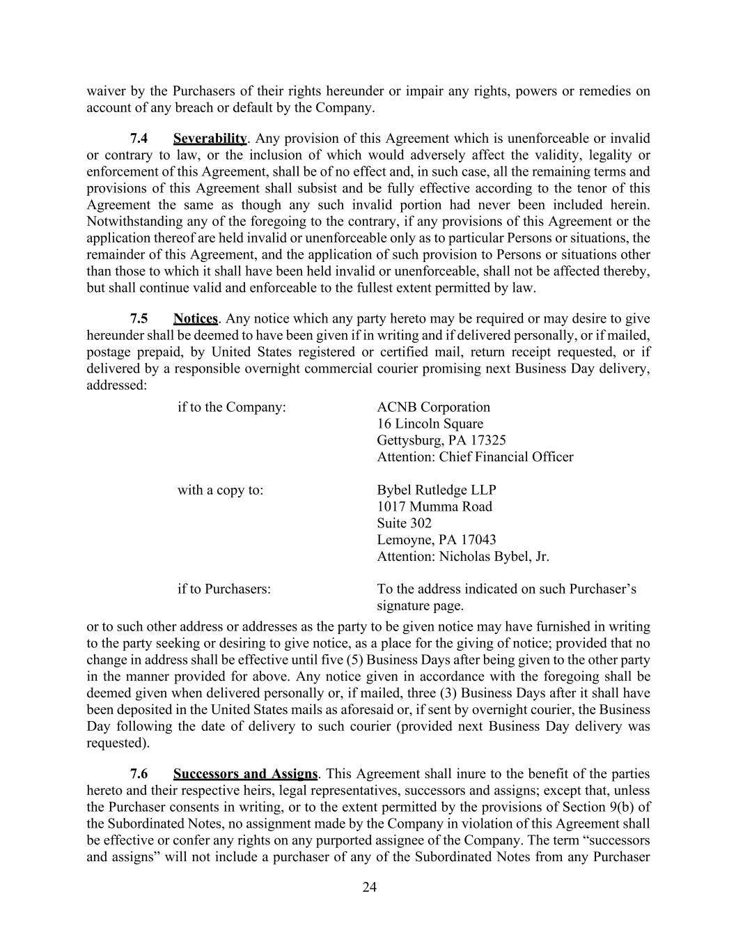 24 waiver by the Purchasers of their rights hereunder or impair any rights, powers or remedies on account of any breach or default by the Company. 7.4 Severability. Any provision of this Agreement which is unenforceable or invalid or contrary to law, or the inclusion of which would adversely affect the validity, legality or enforcement of this Agreement, shall be of no effect and, in such case, all the remaining terms and provisions of this Agreement shall subsist and be fully effective according to the tenor of this Agreement the same as though any such invalid portion had never been included herein. Notwithstanding any of the foregoing to the contrary, if any provisions of this Agreement or the application thereof are held invalid or unenforceable only as to particular Persons or situations, the remainder of this Agreement, and the application of such provision to Persons or situations other than those to which it shall have been held invalid or unenforceable, shall not be affected thereby, but shall continue valid and enforceable to the fullest extent permitted by law. 7.5 Notices. Any notice which any party hereto may be required or may desire to give hereunder shall be deemed to have been given if in writing and if delivered personally, or if mailed, postage prepaid, by United States registered or certified mail, return receipt requested, or if delivered by a responsible overnight commercial courier promising next Business Day delivery, addressed: if to the Company: ACNB Corporation 16 Lincoln Square Gettysburg, PA 17325 Attention: Chief Financial Officer with a copy to: Bybel Rutledge LLP 1017 Mumma Road Suite 302 Lemoyne, PA 17043 Attention: Nicholas Bybel, Jr. if to Purchasers: To the address indicated on such Purchaser’s signature page. or to such other address or addresses as the party to be given notice may have furnished in writing to the party seeking or desiring to give notice, as a place for the giving of notice; provided that no change in address shall be effective until five (5) Business Days after being given to the other party in the manner provided for above. Any notice given in accordance with the foregoing shall be deemed given when delivered personally or, if mailed, three (3) Business Days after it shall have been deposited in the United States mails as aforesaid or, if sent by overnight courier, the Business Day following the date of delivery to such courier (provided next Business Day delivery was requested). 7.6 Successors and Assigns. This Agreement shall inure to the benefit of the parties hereto and their respective heirs, legal representatives, successors and assigns; except that, unless the Purchaser consents in writing, or to the extent permitted by the provisions of Section 9(b) of the Subordinated Notes, no assignment made by the Company in violation of this Agreement shall be effective or confer any rights on any purported assignee of the Company. The term “successors and assigns” will not include a purchaser of any of the Subordinated Notes from any Purchaser