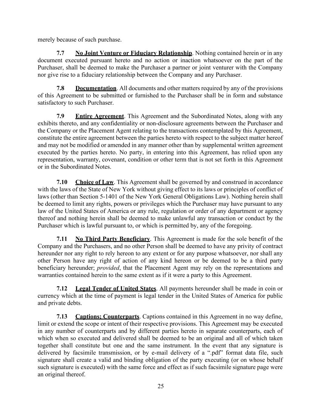 25 merely because of such purchase. 7.7 No Joint Venture or Fiduciary Relationship. Nothing contained herein or in any document executed pursuant hereto and no action or inaction whatsoever on the part of the Purchaser, shall be deemed to make the Purchaser a partner or joint venturer with the Company nor give rise to a fiduciary relationship between the Company and any Purchaser. 7.8 Documentation. All documents and other matters required by any of the provisions of this Agreement to be submitted or furnished to the Purchaser shall be in form and substance satisfactory to such Purchaser. 7.9 Entire Agreement. This Agreement and the Subordinated Notes, along with any exhibits thereto, and any confidentiality or non-disclosure agreements between the Purchaser and the Company or the Placement Agent relating to the transactions contemplated by this Agreement, constitute the entire agreement between the parties hereto with respect to the subject matter hereof and may not be modified or amended in any manner other than by supplemental written agreement executed by the parties hereto. No party, in entering into this Agreement, has relied upon any representation, warranty, covenant, condition or other term that is not set forth in this Agreement or in the Subordinated Notes. 7.10 Choice of Law. This Agreement shall be governed by and construed in accordance with the laws of the State of New York without giving effect to its laws or principles of conflict of laws (other than Section 5-1401 of the New York General Obligations Law). Nothing herein shall be deemed to limit any rights, powers or privileges which the Purchaser may have pursuant to any law of the United States of America or any rule, regulation or order of any department or agency thereof and nothing herein shall be deemed to make unlawful any transaction or conduct by the Purchaser which is lawful pursuant to, or which is permitted by, any of the foregoing. 7.11 No Third Party Beneficiary. This Agreement is made for the sole benefit of the Company and the Purchasers, and no other Person shall be deemed to have any privity of contract hereunder nor any right to rely hereon to any extent or for any purpose whatsoever, nor shall any other Person have any right of action of any kind hereon or be deemed to be a third party beneficiary hereunder; provided, that the Placement Agent may rely on the representations and warranties contained herein to the same extent as if it were a party to this Agreement. 7.12 Legal Tender of United States. All payments hereunder shall be made in coin or currency which at the time of payment is legal tender in the United States of America for public and private debts. 7.13 Captions; Counterparts. Captions contained in this Agreement in no way define, limit or extend the scope or intent of their respective provisions. This Agreement may be executed in any number of counterparts and by different parties hereto in separate counterparts, each of which when so executed and delivered shall be deemed to be an original and all of which taken together shall constitute but one and the same instrument. In the event that any signature is delivered by facsimile transmission, or by e-mail delivery of a “.pdf” format data file, such signature shall create a valid and binding obligation of the party executing (or on whose behalf such signature is executed) with the same force and effect as if such facsimile signature page were an original thereof.