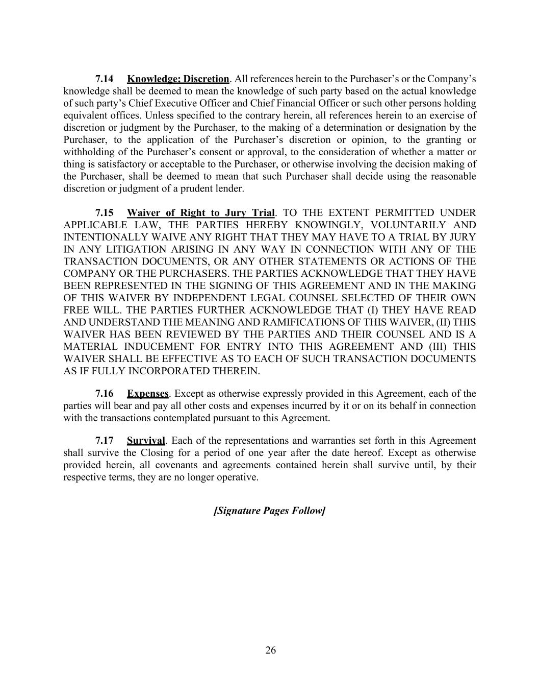 26 7.14 Knowledge; Discretion. All references herein to the Purchaser’s or the Company’s knowledge shall be deemed to mean the knowledge of such party based on the actual knowledge of such party’s Chief Executive Officer and Chief Financial Officer or such other persons holding equivalent offices. Unless specified to the contrary herein, all references herein to an exercise of discretion or judgment by the Purchaser, to the making of a determination or designation by the Purchaser, to the application of the Purchaser’s discretion or opinion, to the granting or withholding of the Purchaser’s consent or approval, to the consideration of whether a matter or thing is satisfactory or acceptable to the Purchaser, or otherwise involving the decision making of the Purchaser, shall be deemed to mean that such Purchaser shall decide using the reasonable discretion or judgment of a prudent lender. 7.15 Waiver of Right to Jury Trial. TO THE EXTENT PERMITTED UNDER APPLICABLE LAW, THE PARTIES HEREBY KNOWINGLY, VOLUNTARILY AND INTENTIONALLY WAIVE ANY RIGHT THAT THEY MAY HAVE TO A TRIAL BY JURY IN ANY LITIGATION ARISING IN ANY WAY IN CONNECTION WITH ANY OF THE TRANSACTION DOCUMENTS, OR ANY OTHER STATEMENTS OR ACTIONS OF THE COMPANY OR THE PURCHASERS. THE PARTIES ACKNOWLEDGE THAT THEY HAVE BEEN REPRESENTED IN THE SIGNING OF THIS AGREEMENT AND IN THE MAKING OF THIS WAIVER BY INDEPENDENT LEGAL COUNSEL SELECTED OF THEIR OWN FREE WILL. THE PARTIES FURTHER ACKNOWLEDGE THAT (I) THEY HAVE READ AND UNDERSTAND THE MEANING AND RAMIFICATIONS OF THIS WAIVER, (II) THIS WAIVER HAS BEEN REVIEWED BY THE PARTIES AND THEIR COUNSEL AND IS A MATERIAL INDUCEMENT FOR ENTRY INTO THIS AGREEMENT AND (III) THIS WAIVER SHALL BE EFFECTIVE AS TO EACH OF SUCH TRANSACTION DOCUMENTS AS IF FULLY INCORPORATED THEREIN. 7.16 Expenses. Except as otherwise expressly provided in this Agreement, each of the parties will bear and pay all other costs and expenses incurred by it or on its behalf in connection with the transactions contemplated pursuant to this Agreement. 7.17 Survival. Each of the representations and warranties set forth in this Agreement shall survive the Closing for a period of one year after the date hereof. Except as otherwise provided herein, all covenants and agreements contained herein shall survive until, by their respective terms, they are no longer operative. [Signature Pages Follow]