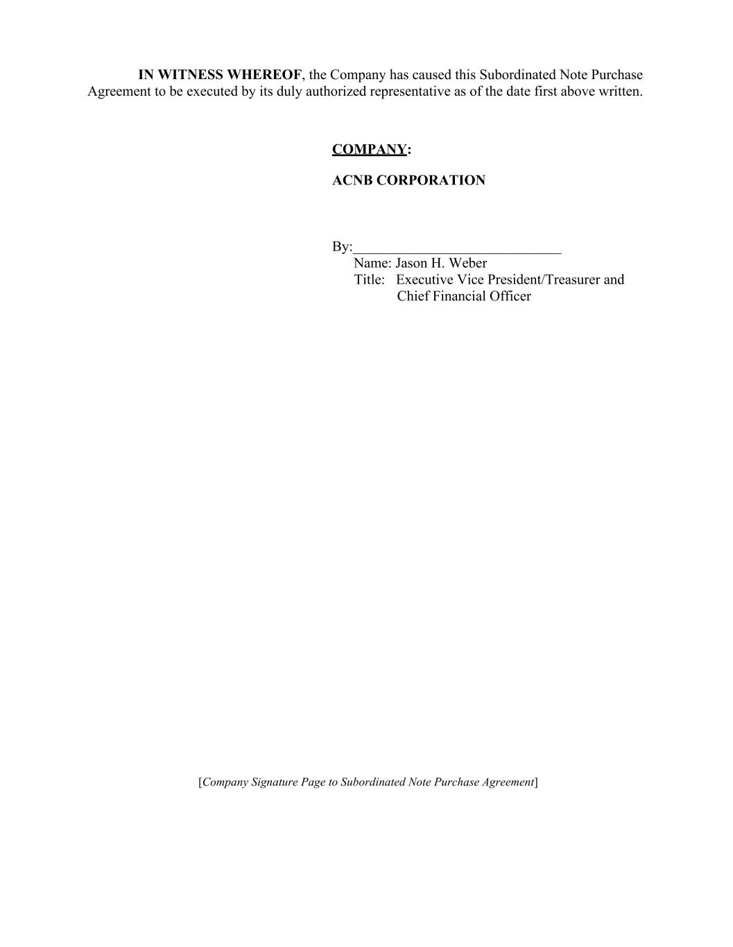 IN WITNESS WHEREOF, the Company has caused this Subordinated Note Purchase Agreement to be executed by its duly authorized representative as of the date first above written. COMPANY: ACNB CORPORATION By:_____________________________ Name: Jason H. Weber Title: Executive Vice President/Treasurer and Chief Financial Officer [Company Signature Page to Subordinated Note Purchase Agreement]