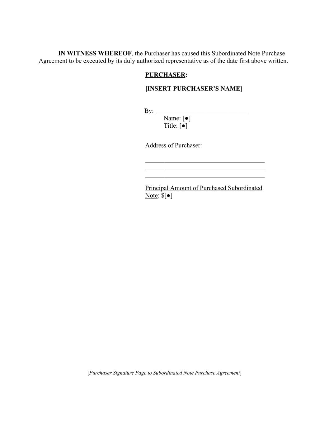 IN WITNESS WHEREOF, the Purchaser has caused this Subordinated Note Purchase Agreement to be executed by its duly authorized representative as of the date first above written. PURCHASER: [INSERT PURCHASER’S NAME] By: _____________________________ Name: [●] Title: [●] Address of Purchaser: Principal Amount of Purchased Subordinated Note: $[●] [Purchaser Signature Page to Subordinated Note Purchase Agreement]