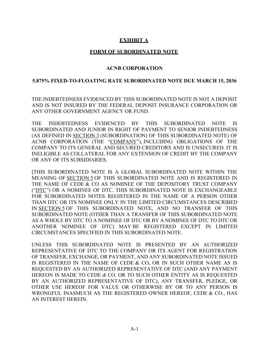 A-1 EXHIBIT A FORM OF SUBORDINATED NOTE ACNB CORPORATION 5.875% FIXED-TO-FLOATING RATE SUBORDINATED NOTE DUE MARCH 15, 2036 THE INDEBTEDNESS EVIDENCED BY THIS SUBORDINATED NOTE IS NOT A DEPOSIT AND IS NOT INSURED BY THE FEDERAL DEPOSIT INSURANCE CORPORATION OR ANY OTHER GOVERNMENT AGENCY OR FUND. THE INDEBTEDNESS EVIDENCED BY THIS SUBORDINATED NOTE IS SUBORDINATED AND JUNIOR IN RIGHT OF PAYMENT TO SENIOR INDEBTEDNESS (AS DEFINED IN SECTION 3 (SUBORDINATION) OF THIS SUBORDINATED NOTE) OF ACNB CORPORATION (THE “COMPANY”), INCLUDING OBLIGATIONS OF THE COMPANY TO ITS GENERAL AND SECURED CREDITORS AND IS UNSECURED. IT IS INELIGIBLE AS COLLATERAL FOR ANY EXTENSION OF CREDIT BY THE COMPANY OR ANY OF ITS SUBSIDIARIES. [THIS SUBORDINATED NOTE IS A GLOBAL SUBORDINATED NOTE WITHIN THE MEANING OF SECTION 5 OF THIS SUBORDINATED NOTE AND IS REGISTERED IN THE NAME OF CEDE & CO AS NOMINEE OF THE DEPOSITORY TRUST COMPANY (“DTC”) OR A NOMINEE OF DTC. THIS SUBORDINATED NOTE IS EXCHANGEABLE FOR SUBORDINATED NOTES REGISTERED IN THE NAME OF A PERSON OTHER THAN DTC OR ITS NOMINEE ONLY IN THE LIMITED CIRCUMSTANCES DESCRIBED IN SECTION 5 OF THIS SUBORDINATED NOTE, AND NO TRANSFER OF THIS SUBORDINATED NOTE (OTHER THAN A TRANSFER OF THIS SUBORDINATED NOTE AS A WHOLE BY DTC TO A NOMINEE OF DTC OR BY A NOMINEE OF DTC TO DTC OR ANOTHER NOMINEE OF DTC) MAY BE REGISTERED EXCEPT IN LIMITED CIRCUMSTANCES SPECIFIED IN THIS SUBORDINATED NOTE. UNLESS THIS SUBORDINATED NOTE IS PRESENTED BY AN AUTHORIZED REPRESENTATIVE OF DTC TO THE COMPANY OR ITS AGENT FOR REGISTRATION OF TRANSFER, EXCHANGE, OR PAYMENT, AND ANY SUBORDINATED NOTE ISSUED IS REGISTERED IN THE NAME OF CEDE & CO, OR IN SUCH OTHER NAME AS IS REQUESTED BY AN AUTHORIZED REPRESENTATIVE OF DTC (AND ANY PAYMENT HEREON IS MADE TO CEDE & CO. OR TO SUCH OTHER ENTITY AS IS REQUESTED BY AN AUTHORIZED REPRESENTATIVE OF DTC), ANY TRANSFER, PLEDGE, OR OTHER USE HEREOF FOR VALUE OR OTHERWISE BY OR TO ANY PERSON IS WRONGFUL INASMUCH AS THE REGISTERED OWNER HEREOF, CEDE & CO., HAS AN INTEREST HEREIN.