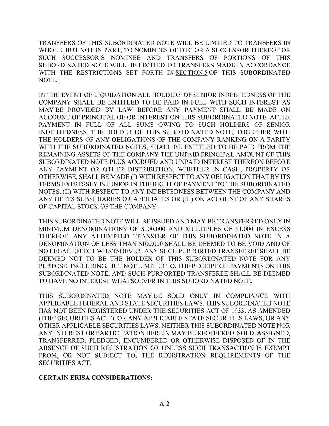 A-2 TRANSFERS OF THIS SUBORDINATED NOTE WILL BE LIMITED TO TRANSFERS IN WHOLE, BUT NOT IN PART, TO NOMINEES OF DTC OR A SUCCESSOR THEREOF OR SUCH SUCCESSOR’S NOMINEE AND TRANSFERS OF PORTIONS OF THIS SUBORDINATED NOTE WILL BE LIMITED TO TRANSFERS MADE IN ACCORDANCE WITH THE RESTRICTIONS SET FORTH IN SECTION 5 OF THIS SUBORDINATED NOTE.] IN THE EVENT OF LIQUIDATION ALL HOLDERS OF SENIOR INDEBTEDNESS OF THE COMPANY SHALL BE ENTITLED TO BE PAID IN FULL WITH SUCH INTEREST AS MAY BE PROVIDED BY LAW BEFORE ANY PAYMENT SHALL BE MADE ON ACCOUNT OF PRINCIPAL OF OR INTEREST ON THIS SUBORDINATED NOTE. AFTER PAYMENT IN FULL OF ALL SUMS OWING TO SUCH HOLDERS OF SENIOR INDEBTEDNESS, THE HOLDER OF THIS SUBORDINATED NOTE, TOGETHER WITH THE HOLDERS OF ANY OBLIGATIONS OF THE COMPANY RANKING ON A PARITY WITH THE SUBORDINATED NOTES, SHALL BE ENTITLED TO BE PAID FROM THE REMAINING ASSETS OF THE COMPANY THE UNPAID PRINCIPAL AMOUNT OF THIS SUBORDINATED NOTE PLUS ACCRUED AND UNPAID INTEREST THEREON BEFORE ANY PAYMENT OR OTHER DISTRIBUTION, WHETHER IN CASH, PROPERTY OR OTHERWISE, SHALL BE MADE (I) WITH RESPECT TO ANY OBLIGATION THAT BY ITS TERMS EXPRESSLY IS JUNIOR IN THE RIGHT OF PAYMENT TO THE SUBORDINATED NOTES, (II) WITH RESPECT TO ANY INDEBTEDNESS BETWEEN THE COMPANY AND ANY OF ITS SUBSIDIARIES OR AFFILIATES OR (III) ON ACCOUNT OF ANY SHARES OF CAPITAL STOCK OF THE COMPANY. THIS SUBORDINATED NOTE WILL BE ISSUED AND MAY BE TRANSFERRED ONLY IN MINIMUM DENOMINATIONS OF $100,000 AND MULTIPLES OF $1,000 IN EXCESS THEREOF. ANY ATTEMPTED TRANSFER OF THIS SUBORDINATED NOTE IN A DENOMINATION OF LESS THAN $100,000 SHALL BE DEEMED TO BE VOID AND OF NO LEGAL EFFECT WHATSOEVER. ANY SUCH PURPORTED TRANSFEREE SHALL BE DEEMED NOT TO BE THE HOLDER OF THIS SUBORDINATED NOTE FOR ANY PURPOSE, INCLUDING, BUT NOT LIMITED TO, THE RECEIPT OF PAYMENTS ON THIS SUBORDINATED NOTE, AND SUCH PURPORTED TRANSFEREE SHALL BE DEEMED TO HAVE NO INTEREST WHATSOEVER IN THIS SUBORDINATED NOTE. THIS SUBORDINATED NOTE MAY BE SOLD ONLY IN COMPLIANCE WITH APPLICABLE FEDERAL AND STATE SECURITIES LAWS. THIS SUBORDINATED NOTE HAS NOT BEEN REGISTERED UNDER THE SECURITIES ACT OF 1933, AS AMENDED (THE “SECURITIES ACT”), OR ANY APPLICABLE STATE SECURITIES LAWS, OR ANY OTHER APPLICABLE SECURITIES LAWS. NEITHER THIS SUBORDINATED NOTE NOR ANY INTEREST OR PARTICIPATION HEREIN MAY BE REOFFERED, SOLD, ASSIGNED, TRANSFERRED, PLEDGED, ENCUMBERED OR OTHERWISE DISPOSED OF IN THE ABSENCE OF SUCH REGISTRATION OR UNLESS SUCH TRANSACTION IS EXEMPT FROM, OR NOT SUBJECT TO, THE REGISTRATION REQUIREMENTS OF THE SECURITIES ACT. CERTAIN ERISA CONSIDERATIONS: