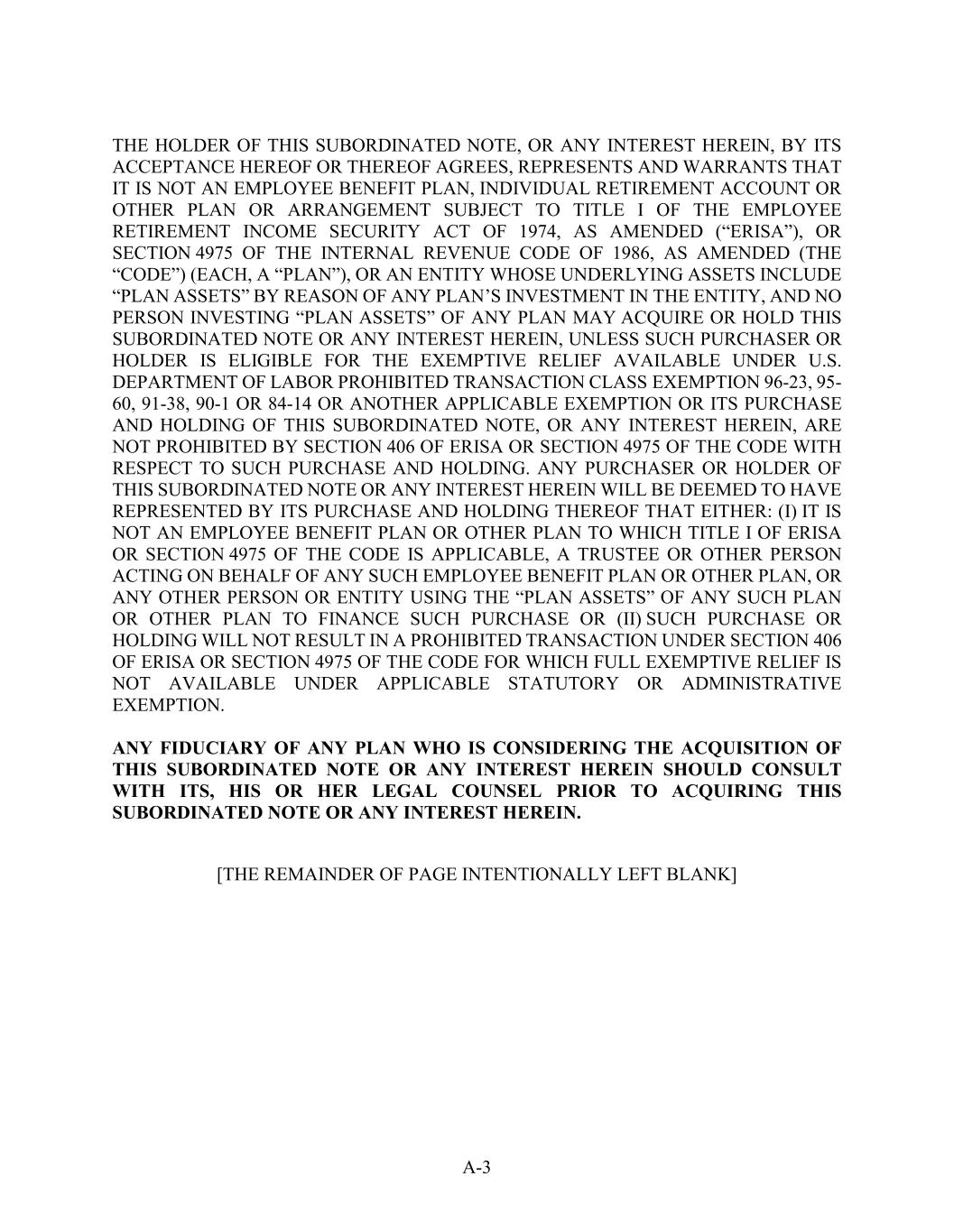 A-3 THE HOLDER OF THIS SUBORDINATED NOTE, OR ANY INTEREST HEREIN, BY ITS ACCEPTANCE HEREOF OR THEREOF AGREES, REPRESENTS AND WARRANTS THAT IT IS NOT AN EMPLOYEE BENEFIT PLAN, INDIVIDUAL RETIREMENT ACCOUNT OR OTHER PLAN OR ARRANGEMENT SUBJECT TO TITLE I OF THE EMPLOYEE RETIREMENT INCOME SECURITY ACT OF 1974, AS AMENDED (“ERISA”), OR SECTION 4975 OF THE INTERNAL REVENUE CODE OF 1986, AS AMENDED (THE “CODE”) (EACH, A “PLAN”), OR AN ENTITY WHOSE UNDERLYING ASSETS INCLUDE “PLAN ASSETS” BY REASON OF ANY PLAN’S INVESTMENT IN THE ENTITY, AND NO PERSON INVESTING “PLAN ASSETS” OF ANY PLAN MAY ACQUIRE OR HOLD THIS SUBORDINATED NOTE OR ANY INTEREST HEREIN, UNLESS SUCH PURCHASER OR HOLDER IS ELIGIBLE FOR THE EXEMPTIVE RELIEF AVAILABLE UNDER U.S. DEPARTMENT OF LABOR PROHIBITED TRANSACTION CLASS EXEMPTION 96-23, 95- 60, 91-38, 90-1 OR 84-14 OR ANOTHER APPLICABLE EXEMPTION OR ITS PURCHASE AND HOLDING OF THIS SUBORDINATED NOTE, OR ANY INTEREST HEREIN, ARE NOT PROHIBITED BY SECTION 406 OF ERISA OR SECTION 4975 OF THE CODE WITH RESPECT TO SUCH PURCHASE AND HOLDING. ANY PURCHASER OR HOLDER OF THIS SUBORDINATED NOTE OR ANY INTEREST HEREIN WILL BE DEEMED TO HAVE REPRESENTED BY ITS PURCHASE AND HOLDING THEREOF THAT EITHER: (I) IT IS NOT AN EMPLOYEE BENEFIT PLAN OR OTHER PLAN TO WHICH TITLE I OF ERISA OR SECTION 4975 OF THE CODE IS APPLICABLE, A TRUSTEE OR OTHER PERSON ACTING ON BEHALF OF ANY SUCH EMPLOYEE BENEFIT PLAN OR OTHER PLAN, OR ANY OTHER PERSON OR ENTITY USING THE “PLAN ASSETS” OF ANY SUCH PLAN OR OTHER PLAN TO FINANCE SUCH PURCHASE OR (II) SUCH PURCHASE OR HOLDING WILL NOT RESULT IN A PROHIBITED TRANSACTION UNDER SECTION 406 OF ERISA OR SECTION 4975 OF THE CODE FOR WHICH FULL EXEMPTIVE RELIEF IS NOT AVAILABLE UNDER APPLICABLE STATUTORY OR ADMINISTRATIVE EXEMPTION. ANY FIDUCIARY OF ANY PLAN WHO IS CONSIDERING THE ACQUISITION OF THIS SUBORDINATED NOTE OR ANY INTEREST HEREIN SHOULD CONSULT WITH ITS, HIS OR HER LEGAL COUNSEL PRIOR TO ACQUIRING THIS SUBORDINATED NOTE OR ANY INTEREST HEREIN. [THE REMAINDER OF PAGE INTENTIONALLY LEFT BLANK]