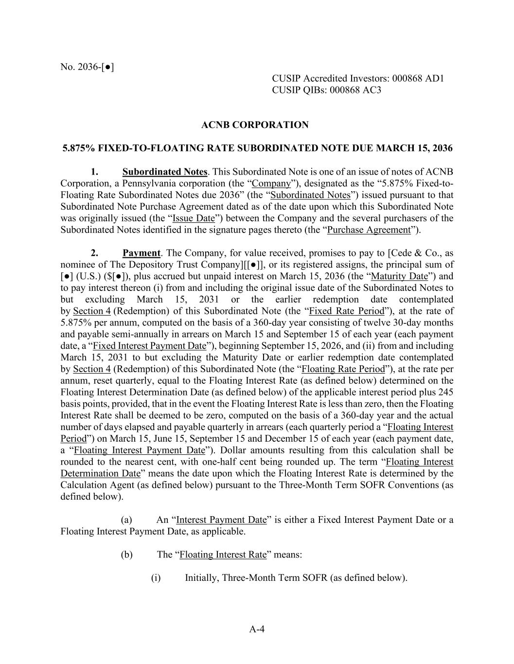 A-4 No. 2036-[●] CUSIP Accredited Investors: 000868 AD1 CUSIP QIBs: 000868 AC3 ACNB CORPORATION 5.875% FIXED-TO-FLOATING RATE SUBORDINATED NOTE DUE MARCH 15, 2036 1.            Subordinated Notes. This Subordinated Note is one of an issue of notes of ACNB Corporation, a Pennsylvania corporation (the “Company”), designated as the “5.875% Fixed-to- Floating Rate Subordinated Notes due 2036” (the “Subordinated Notes”) issued pursuant to that Subordinated Note Purchase Agreement dated as of the date upon which this Subordinated Note was originally issued (the “Issue Date”) between the Company and the several purchasers of the Subordinated Notes identified in the signature pages thereto (the “Purchase Agreement”). 2.            Payment. The Company, for value received, promises to pay to [Cede & Co., as nominee of The Depository Trust Company][[●]], or its registered assigns, the principal sum of [●] (U.S.) ($[●]), plus accrued but unpaid interest on March 15, 2036 (the “Maturity Date”) and to pay interest thereon (i) from and including the original issue date of the Subordinated Notes to but excluding March 15, 2031 or the earlier redemption date contemplated by Section 4 (Redemption) of this Subordinated Note (the “Fixed Rate Period”), at the rate of 5.875% per annum, computed on the basis of a 360-day year consisting of twelve 30-day months and payable semi-annually in arrears on March 15 and September 15 of each year (each payment date, a “Fixed Interest Payment Date”), beginning September 15, 2026, and (ii) from and including March 15, 2031 to but excluding the Maturity Date or earlier redemption date contemplated by Section 4 (Redemption) of this Subordinated Note (the “Floating Rate Period”), at the rate per annum, reset quarterly, equal to the Floating Interest Rate (as defined below) determined on the Floating Interest Determination Date (as defined below) of the applicable interest period plus 245 basis points, provided, that in the event the Floating Interest Rate is less than zero, then the Floating Interest Rate shall be deemed to be zero, computed on the basis of a 360-day year and the actual number of days elapsed and payable quarterly in arrears (each quarterly period a “Floating Interest Period”) on March 15, June 15, September 15 and December 15 of each year (each payment date, a “Floating Interest Payment Date”). Dollar amounts resulting from this calculation shall be rounded to the nearest cent, with one-half cent being rounded up. The term “Floating Interest Determination Date” means the date upon which the Floating Interest Rate is determined by the Calculation Agent (as defined below) pursuant to the Three-Month Term SOFR Conventions (as defined below). (a)            An “Interest Payment Date” is either a Fixed Interest Payment Date or a Floating Interest Payment Date, as applicable. (b)            The “Floating Interest Rate” means: (i)            Initially, Three-Month Term SOFR (as defined below).