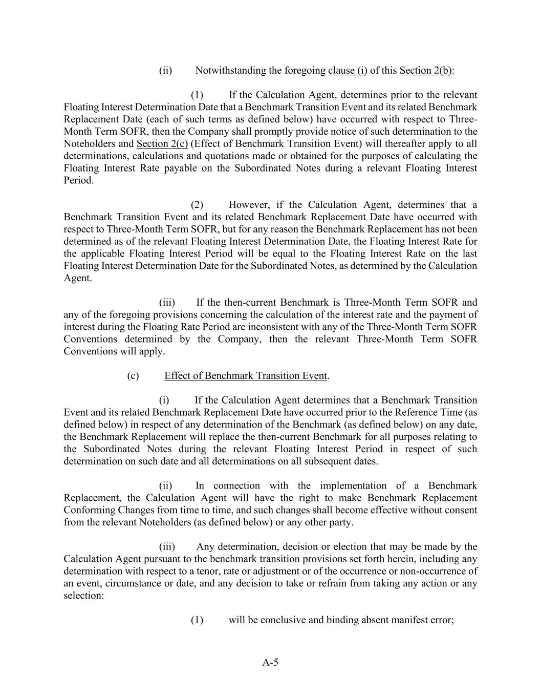 A-5 (ii)           Notwithstanding the foregoing clause (i) of this Section 2(b): (1)            If the Calculation Agent, determines prior to the relevant Floating Interest Determination Date that a Benchmark Transition Event and its related Benchmark Replacement Date (each of such terms as defined below) have occurred with respect to Three- Month Term SOFR, then the Company shall promptly provide notice of such determination to the Noteholders and Section 2(c) (Effect of Benchmark Transition Event) will thereafter apply to all determinations, calculations and quotations made or obtained for the purposes of calculating the Floating Interest Rate payable on the Subordinated Notes during a relevant Floating Interest Period. (2)            However, if the Calculation Agent, determines that a Benchmark Transition Event and its related Benchmark Replacement Date have occurred with respect to Three-Month Term SOFR, but for any reason the Benchmark Replacement has not been determined as of the relevant Floating Interest Determination Date, the Floating Interest Rate for the applicable Floating Interest Period will be equal to the Floating Interest Rate on the last Floating Interest Determination Date for the Subordinated Notes, as determined by the Calculation Agent. (iii)          If the then-current Benchmark is Three-Month Term SOFR and any of the foregoing provisions concerning the calculation of the interest rate and the payment of interest during the Floating Rate Period are inconsistent with any of the Three-Month Term SOFR Conventions determined by the Company, then the relevant Three-Month Term SOFR Conventions will apply. (c)            Effect of Benchmark Transition Event. (i)            If the Calculation Agent determines that a Benchmark Transition Event and its related Benchmark Replacement Date have occurred prior to the Reference Time (as defined below) in respect of any determination of the Benchmark (as defined below) on any date, the Benchmark Replacement will replace the then-current Benchmark for all purposes relating to the Subordinated Notes during the relevant Floating Interest Period in respect of such determination on such date and all determinations on all subsequent dates. (ii)           In connection with the implementation of a Benchmark Replacement, the Calculation Agent will have the right to make Benchmark Replacement Conforming Changes from time to time, and such changes shall become effective without consent from the relevant Noteholders (as defined below) or any other party. (iii)          Any determination, decision or election that may be made by the Calculation Agent pursuant to the benchmark transition provisions set forth herein, including any determination with respect to a tenor, rate or adjustment or of the occurrence or non-occurrence of an event, circumstance or date, and any decision to take or refrain from taking any action or any selection: (1)            will be conclusive and binding absent manifest error;