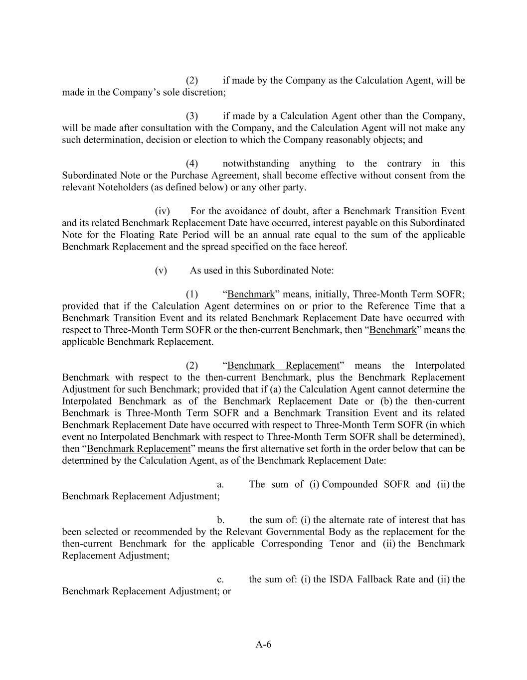 A-6 (2)            if made by the Company as the Calculation Agent, will be made in the Company’s sole discretion; (3)            if made by a Calculation Agent other than the Company, will be made after consultation with the Company, and the Calculation Agent will not make any such determination, decision or election to which the Company reasonably objects; and (4)            notwithstanding anything to the contrary in this Subordinated Note or the Purchase Agreement, shall become effective without consent from the relevant Noteholders (as defined below) or any other party. (iv)          For the avoidance of doubt, after a Benchmark Transition Event and its related Benchmark Replacement Date have occurred, interest payable on this Subordinated Note for the Floating Rate Period will be an annual rate equal to the sum of the applicable Benchmark Replacement and the spread specified on the face hereof. (v)           As used in this Subordinated Note: (1)            “Benchmark” means, initially, Three-Month Term SOFR; provided that if the Calculation Agent determines on or prior to the Reference Time that a Benchmark Transition Event and its related Benchmark Replacement Date have occurred with respect to Three-Month Term SOFR or the then-current Benchmark, then “Benchmark” means the applicable Benchmark Replacement. (2)            “Benchmark Replacement” means the Interpolated Benchmark with respect to the then-current Benchmark, plus the Benchmark Replacement Adjustment for such Benchmark; provided that if (a) the Calculation Agent cannot determine the Interpolated Benchmark as of the Benchmark Replacement Date or (b) the then-current Benchmark is Three-Month Term SOFR and a Benchmark Transition Event and its related Benchmark Replacement Date have occurred with respect to Three-Month Term SOFR (in which event no Interpolated Benchmark with respect to Three-Month Term SOFR shall be determined), then “Benchmark Replacement” means the first alternative set forth in the order below that can be determined by the Calculation Agent, as of the Benchmark Replacement Date: a.            The sum of (i) Compounded SOFR and (ii) the Benchmark Replacement Adjustment; b.            the sum of: (i) the alternate rate of interest that has been selected or recommended by the Relevant Governmental Body as the replacement for the then-current Benchmark for the applicable Corresponding Tenor and (ii) the Benchmark Replacement Adjustment; c.            the sum of: (i) the ISDA Fallback Rate and (ii) the Benchmark Replacement Adjustment; or