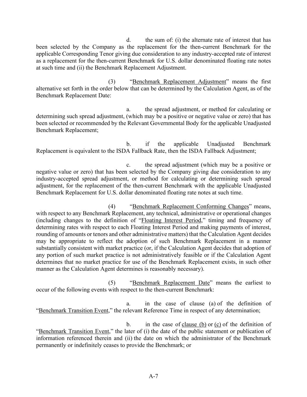 A-7 d.            the sum of: (i) the alternate rate of interest that has been selected by the Company as the replacement for the then-current Benchmark for the applicable Corresponding Tenor giving due consideration to any industry-accepted rate of interest as a replacement for the then-current Benchmark for U.S. dollar denominated floating rate notes at such time and (ii) the Benchmark Replacement Adjustment. (3)            “Benchmark Replacement Adjustment” means the first alternative set forth in the order below that can be determined by the Calculation Agent, as of the Benchmark Replacement Date: a.            the spread adjustment, or method for calculating or determining such spread adjustment, (which may be a positive or negative value or zero) that has been selected or recommended by the Relevant Governmental Body for the applicable Unadjusted Benchmark Replacement; b.            if the applicable Unadjusted Benchmark Replacement is equivalent to the ISDA Fallback Rate, then the ISDA Fallback Adjustment; c.            the spread adjustment (which may be a positive or negative value or zero) that has been selected by the Company giving due consideration to any industry-accepted spread adjustment, or method for calculating or determining such spread adjustment, for the replacement of the then-current Benchmark with the applicable Unadjusted Benchmark Replacement for U.S. dollar denominated floating rate notes at such time. (4)            “Benchmark Replacement Conforming Changes” means, with respect to any Benchmark Replacement, any technical, administrative or operational changes (including changes to the definition of “Floating Interest Period,” timing and frequency of determining rates with respect to each Floating Interest Period and making payments of interest, rounding of amounts or tenors and other administrative matters) that the Calculation Agent decides may be appropriate to reflect the adoption of such Benchmark Replacement in a manner substantially consistent with market practice (or, if the Calculation Agent decides that adoption of any portion of such market practice is not administratively feasible or if the Calculation Agent determines that no market practice for use of the Benchmark Replacement exists, in such other manner as the Calculation Agent determines is reasonably necessary). (5)            “Benchmark Replacement Date” means the earliest to occur of the following events with respect to the then-current Benchmark: a.            in the case of clause (a) of the definition of “Benchmark Transition Event,” the relevant Reference Time in respect of any determination; b.            in the case of clause (b) or (c) of the definition of “Benchmark Transition Event,” the later of (i) the date of the public statement or publication of information referenced therein and (ii) the date on which the administrator of the Benchmark permanently or indefinitely ceases to provide the Benchmark; or