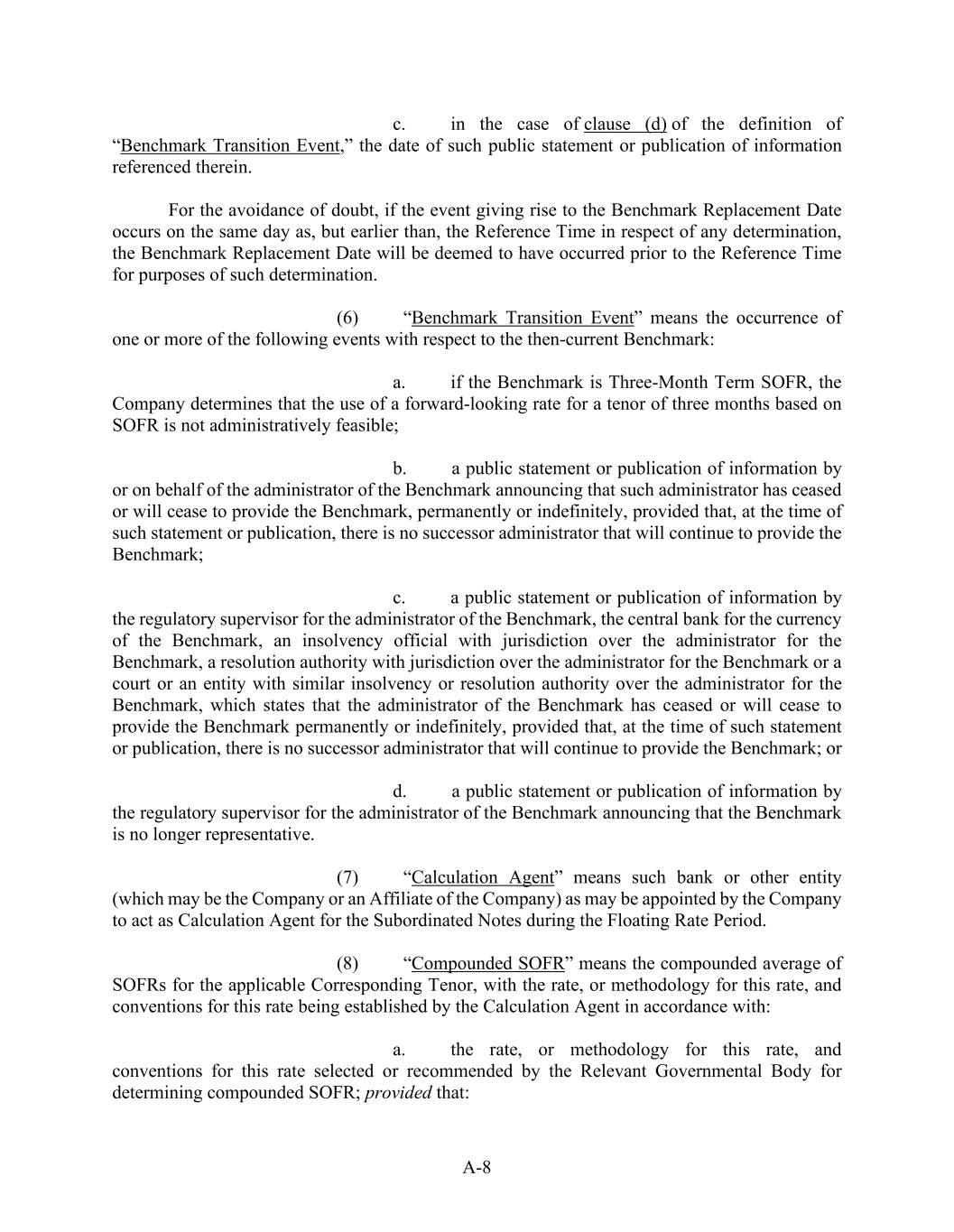 A-8 c.            in the case of clause (d) of the definition of “Benchmark Transition Event,” the date of such public statement or publication of information referenced therein. For the avoidance of doubt, if the event giving rise to the Benchmark Replacement Date occurs on the same day as, but earlier than, the Reference Time in respect of any determination, the Benchmark Replacement Date will be deemed to have occurred prior to the Reference Time for purposes of such determination. (6)            “Benchmark Transition Event” means the occurrence of one or more of the following events with respect to the then-current Benchmark: a.            if the Benchmark is Three-Month Term SOFR, the Company determines that the use of a forward-looking rate for a tenor of three months based on SOFR is not administratively feasible; b.            a public statement or publication of information by or on behalf of the administrator of the Benchmark announcing that such administrator has ceased or will cease to provide the Benchmark, permanently or indefinitely, provided that, at the time of such statement or publication, there is no successor administrator that will continue to provide the Benchmark; c.            a public statement or publication of information by the regulatory supervisor for the administrator of the Benchmark, the central bank for the currency of the Benchmark, an insolvency official with jurisdiction over the administrator for the Benchmark, a resolution authority with jurisdiction over the administrator for the Benchmark or a court or an entity with similar insolvency or resolution authority over the administrator for the Benchmark, which states that the administrator of the Benchmark has ceased or will cease to provide the Benchmark permanently or indefinitely, provided that, at the time of such statement or publication, there is no successor administrator that will continue to provide the Benchmark; or d.            a public statement or publication of information by the regulatory supervisor for the administrator of the Benchmark announcing that the Benchmark is no longer representative. (7)            “Calculation Agent” means such bank or other entity (which may be the Company or an Affiliate of the Company) as may be appointed by the Company to act as Calculation Agent for the Subordinated Notes during the Floating Rate Period. (8)            “Compounded SOFR” means the compounded average of SOFRs for the applicable Corresponding Tenor, with the rate, or methodology for this rate, and conventions for this rate being established by the Calculation Agent in accordance with: a.            the rate, or methodology for this rate, and conventions for this rate selected or recommended by the Relevant Governmental Body for determining compounded SOFR; provided that: