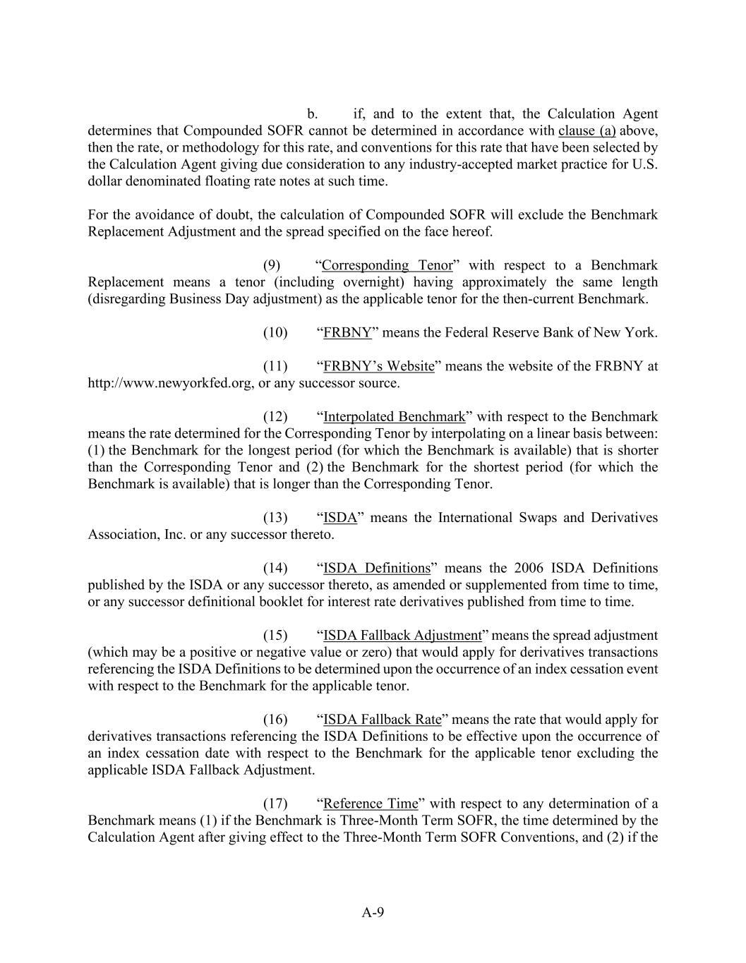 A-9 b.            if, and to the extent that, the Calculation Agent determines that Compounded SOFR cannot be determined in accordance with clause (a) above, then the rate, or methodology for this rate, and conventions for this rate that have been selected by the Calculation Agent giving due consideration to any industry-accepted market practice for U.S. dollar denominated floating rate notes at such time. For the avoidance of doubt, the calculation of Compounded SOFR will exclude the Benchmark Replacement Adjustment and the spread specified on the face hereof. (9)            “Corresponding Tenor” with respect to a Benchmark Replacement means a tenor (including overnight) having approximately the same length (disregarding Business Day adjustment) as the applicable tenor for the then-current Benchmark. (10)          “FRBNY” means the Federal Reserve Bank of New York. (11)          “FRBNY’s Website” means the website of the FRBNY at http://www.newyorkfed.org, or any successor source. (12)          “Interpolated Benchmark” with respect to the Benchmark means the rate determined for the Corresponding Tenor by interpolating on a linear basis between: (1) the Benchmark for the longest period (for which the Benchmark is available) that is shorter than the Corresponding Tenor and (2) the Benchmark for the shortest period (for which the Benchmark is available) that is longer than the Corresponding Tenor. (13)          “ISDA” means the International Swaps and Derivatives Association, Inc. or any successor thereto. (14)          “ISDA Definitions” means the 2006 ISDA Definitions published by the ISDA or any successor thereto, as amended or supplemented from time to time, or any successor definitional booklet for interest rate derivatives published from time to time. (15)          “ISDA Fallback Adjustment” means the spread adjustment (which may be a positive or negative value or zero) that would apply for derivatives transactions referencing the ISDA Definitions to be determined upon the occurrence of an index cessation event with respect to the Benchmark for the applicable tenor. (16)          “ISDA Fallback Rate” means the rate that would apply for derivatives transactions referencing the ISDA Definitions to be effective upon the occurrence of an index cessation date with respect to the Benchmark for the applicable tenor excluding the applicable ISDA Fallback Adjustment. (17)          “Reference Time” with respect to any determination of a Benchmark means (1) if the Benchmark is Three-Month Term SOFR, the time determined by the Calculation Agent after giving effect to the Three-Month Term SOFR Conventions, and (2) if the
