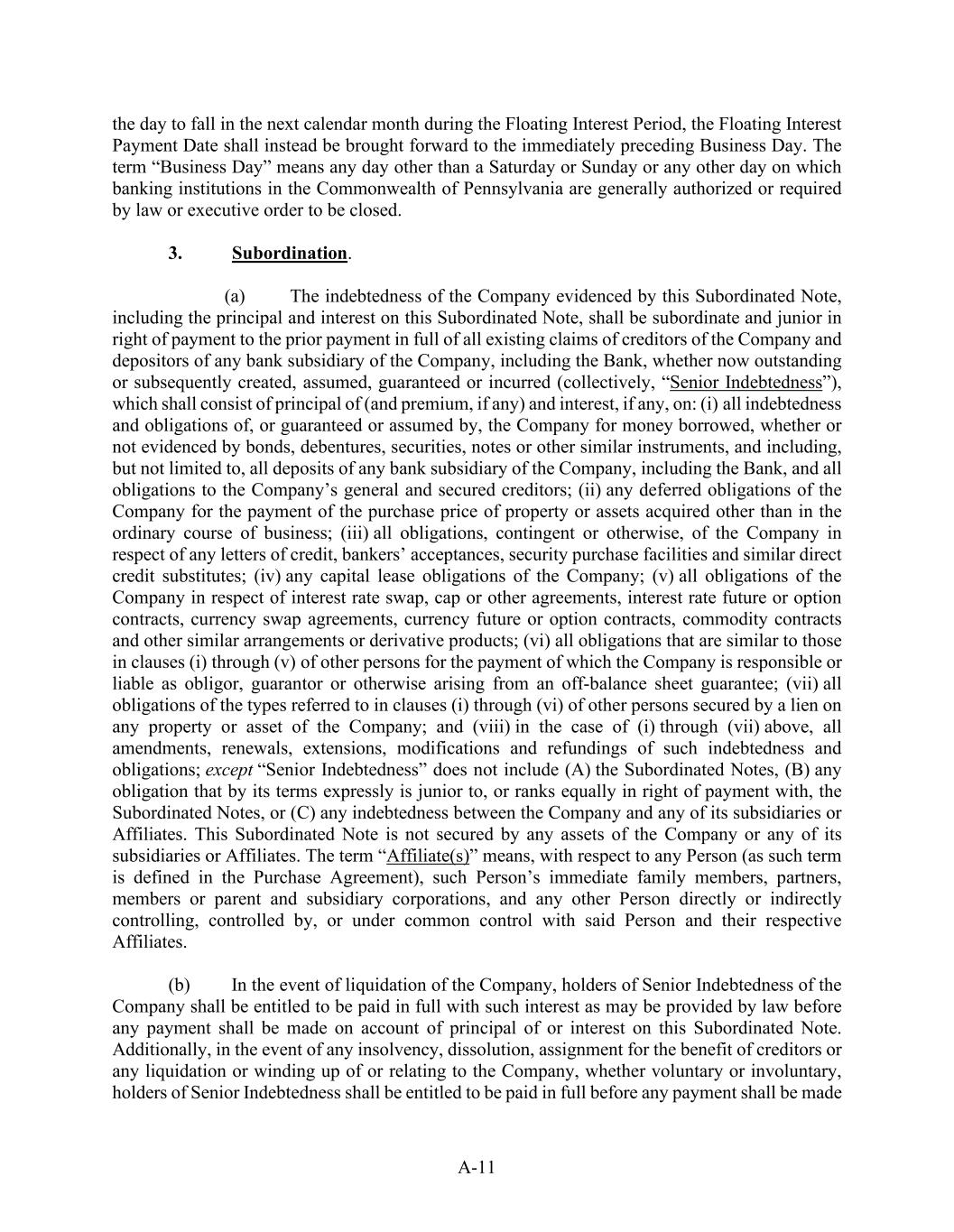 A-11 the day to fall in the next calendar month during the Floating Interest Period, the Floating Interest Payment Date shall instead be brought forward to the immediately preceding Business Day. The term “Business Day” means any day other than a Saturday or Sunday or any other day on which banking institutions in the Commonwealth of Pennsylvania are generally authorized or required by law or executive order to be closed. 3.             Subordination. (a)            The indebtedness of the Company evidenced by this Subordinated Note, including the principal and interest on this Subordinated Note, shall be subordinate and junior in right of payment to the prior payment in full of all existing claims of creditors of the Company and depositors of any bank subsidiary of the Company, including the Bank, whether now outstanding or subsequently created, assumed, guaranteed or incurred (collectively, “Senior Indebtedness”), which shall consist of principal of (and premium, if any) and interest, if any, on: (i) all indebtedness and obligations of, or guaranteed or assumed by, the Company for money borrowed, whether or not evidenced by bonds, debentures, securities, notes or other similar instruments, and including, but not limited to, all deposits of any bank subsidiary of the Company, including the Bank, and all obligations to the Company’s general and secured creditors; (ii) any deferred obligations of the Company for the payment of the purchase price of property or assets acquired other than in the ordinary course of business; (iii) all obligations, contingent or otherwise, of the Company in respect of any letters of credit, bankers’ acceptances, security purchase facilities and similar direct credit substitutes; (iv) any capital lease obligations of the Company; (v) all obligations of the Company in respect of interest rate swap, cap or other agreements, interest rate future or option contracts, currency swap agreements, currency future or option contracts, commodity contracts and other similar arrangements or derivative products; (vi) all obligations that are similar to those in clauses (i) through (v) of other persons for the payment of which the Company is responsible or liable as obligor, guarantor or otherwise arising from an off-balance sheet guarantee; (vii) all obligations of the types referred to in clauses (i) through (vi) of other persons secured by a lien on any property or asset of the Company; and (viii) in the case of (i) through (vii) above, all amendments, renewals, extensions, modifications and refundings of such indebtedness and obligations; except “Senior Indebtedness” does not include (A) the Subordinated Notes, (B) any obligation that by its terms expressly is junior to, or ranks equally in right of payment with, the Subordinated Notes, or (C) any indebtedness between the Company and any of its subsidiaries or Affiliates. This Subordinated Note is not secured by any assets of the Company or any of its subsidiaries or Affiliates. The term “Affiliate(s)” means, with respect to any Person (as such term is defined in the Purchase Agreement), such Person’s immediate family members, partners, members or parent and subsidiary corporations, and any other Person directly or indirectly controlling, controlled by, or under common control with said Person and their respective Affiliates. (b)           In the event of liquidation of the Company, holders of Senior Indebtedness of the Company shall be entitled to be paid in full with such interest as may be provided by law before any payment shall be made on account of principal of or interest on this Subordinated Note. Additionally, in the event of any insolvency, dissolution, assignment for the benefit of creditors or any liquidation or winding up of or relating to the Company, whether voluntary or involuntary, holders of Senior Indebtedness shall be entitled to be paid in full before any payment shall be made