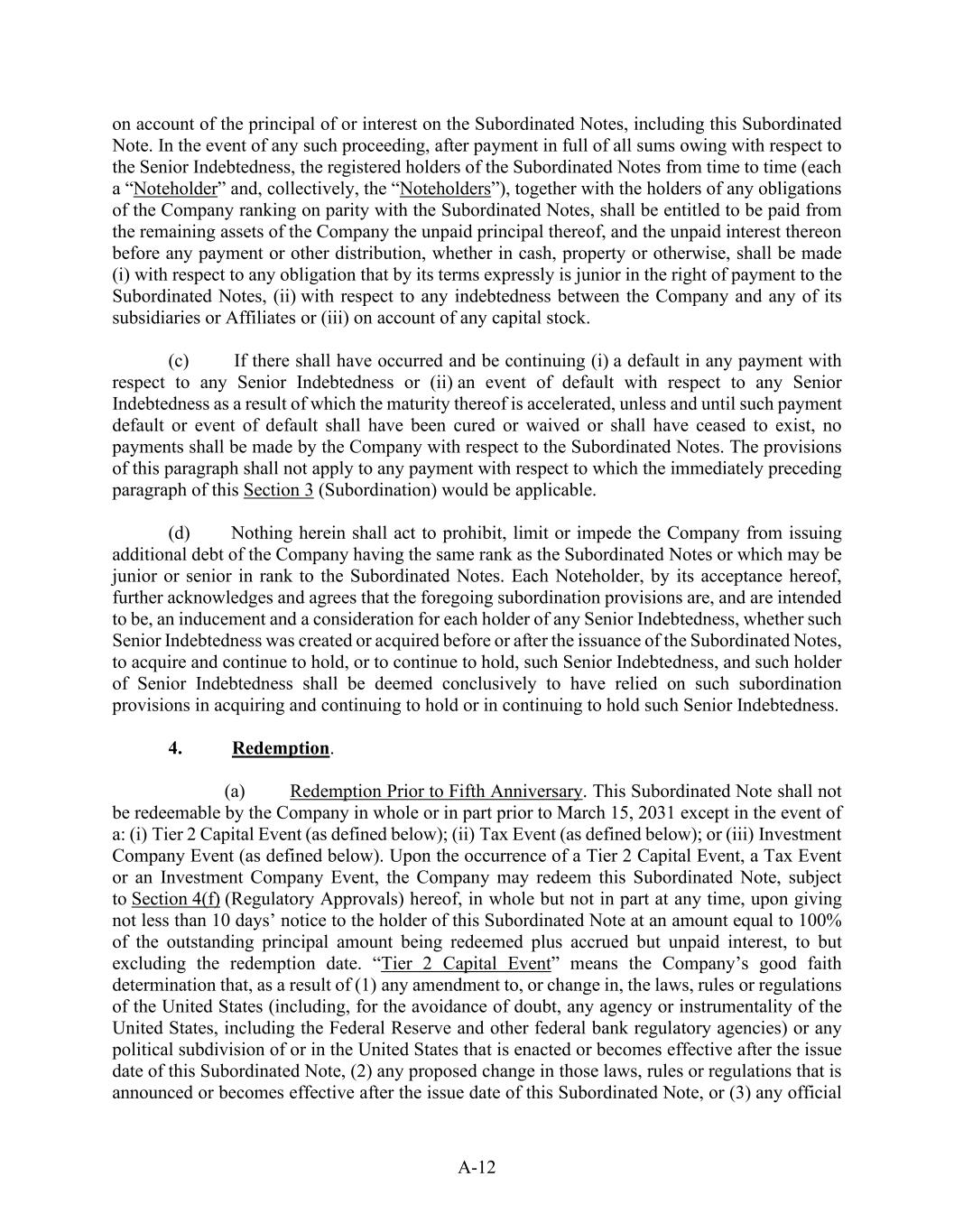 A-12 on account of the principal of or interest on the Subordinated Notes, including this Subordinated Note. In the event of any such proceeding, after payment in full of all sums owing with respect to the Senior Indebtedness, the registered holders of the Subordinated Notes from time to time (each a “Noteholder” and, collectively, the “Noteholders”), together with the holders of any obligations of the Company ranking on parity with the Subordinated Notes, shall be entitled to be paid from the remaining assets of the Company the unpaid principal thereof, and the unpaid interest thereon before any payment or other distribution, whether in cash, property or otherwise, shall be made (i) with respect to any obligation that by its terms expressly is junior in the right of payment to the Subordinated Notes, (ii) with respect to any indebtedness between the Company and any of its subsidiaries or Affiliates or (iii) on account of any capital stock. (c)            If there shall have occurred and be continuing (i) a default in any payment with respect to any Senior Indebtedness or (ii) an event of default with respect to any Senior Indebtedness as a result of which the maturity thereof is accelerated, unless and until such payment default or event of default shall have been cured or waived or shall have ceased to exist, no payments shall be made by the Company with respect to the Subordinated Notes. The provisions of this paragraph shall not apply to any payment with respect to which the immediately preceding paragraph of this Section 3 (Subordination) would be applicable. (d)           Nothing herein shall act to prohibit, limit or impede the Company from issuing additional debt of the Company having the same rank as the Subordinated Notes or which may be junior or senior in rank to the Subordinated Notes. Each Noteholder, by its acceptance hereof, further acknowledges and agrees that the foregoing subordination provisions are, and are intended to be, an inducement and a consideration for each holder of any Senior Indebtedness, whether such Senior Indebtedness was created or acquired before or after the issuance of the Subordinated Notes, to acquire and continue to hold, or to continue to hold, such Senior Indebtedness, and such holder of Senior Indebtedness shall be deemed conclusively to have relied on such subordination provisions in acquiring and continuing to hold or in continuing to hold such Senior Indebtedness. 4.             Redemption. (a)            Redemption Prior to Fifth Anniversary. This Subordinated Note shall not be redeemable by the Company in whole or in part prior to March 15, 2031 except in the event of a: (i) Tier 2 Capital Event (as defined below); (ii) Tax Event (as defined below); or (iii) Investment Company Event (as defined below). Upon the occurrence of a Tier 2 Capital Event, a Tax Event or an Investment Company Event, the Company may redeem this Subordinated Note, subject to Section 4(f) (Regulatory Approvals) hereof, in whole but not in part at any time, upon giving not less than 10 days’ notice to the holder of this Subordinated Note at an amount equal to 100% of the outstanding principal amount being redeemed plus accrued but unpaid interest, to but excluding the redemption date. “Tier 2 Capital Event” means the Company’s good faith determination that, as a result of (1) any amendment to, or change in, the laws, rules or regulations of the United States (including, for the avoidance of doubt, any agency or instrumentality of the United States, including the Federal Reserve and other federal bank regulatory agencies) or any political subdivision of or in the United States that is enacted or becomes effective after the issue date of this Subordinated Note, (2) any proposed change in those laws, rules or regulations that is announced or becomes effective after the issue date of this Subordinated Note, or (3) any official