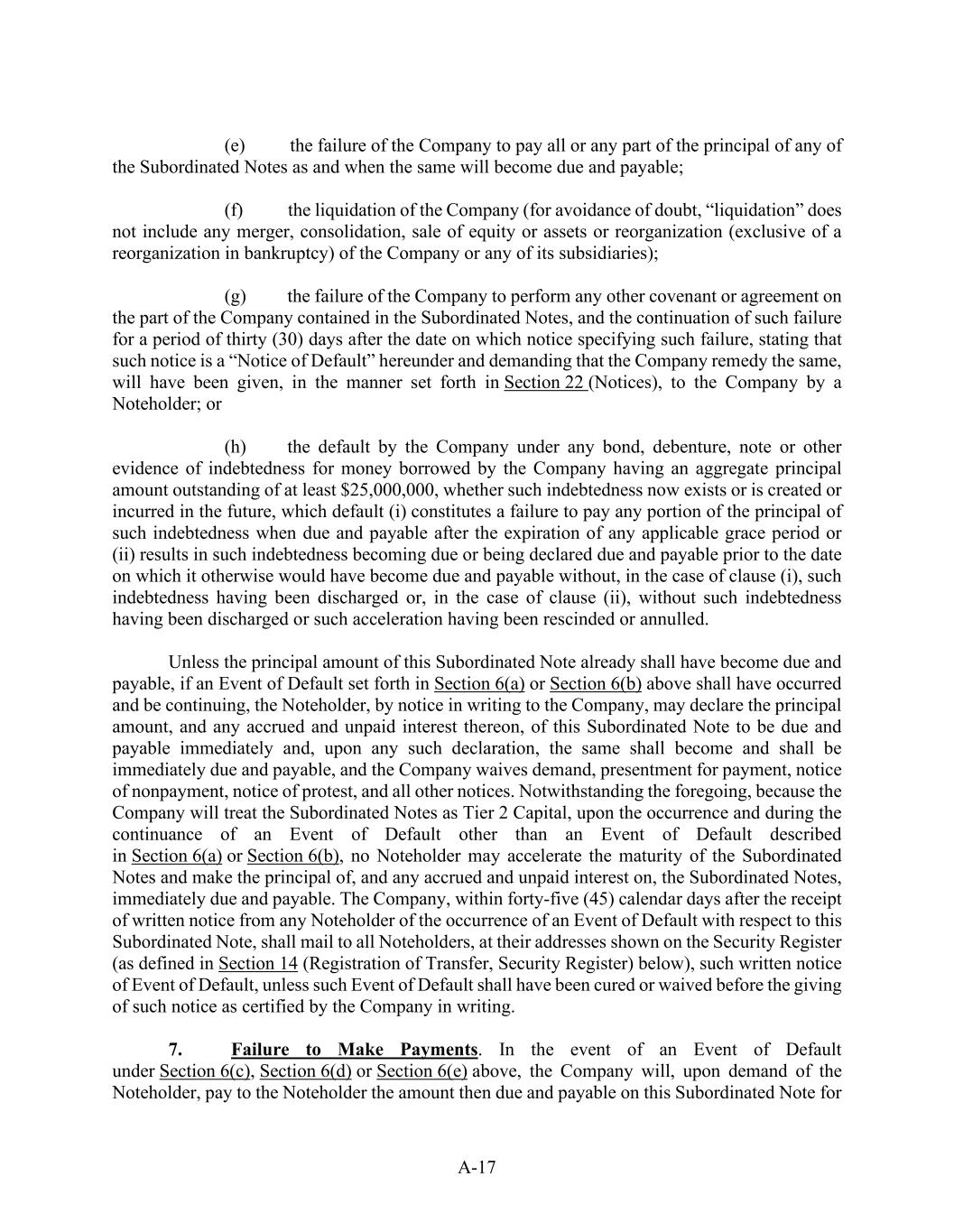 A-17 (e)            the failure of the Company to pay all or any part of the principal of any of the Subordinated Notes as and when the same will become due and payable; (f)            the liquidation of the Company (for avoidance of doubt, “liquidation” does not include any merger, consolidation, sale of equity or assets or reorganization (exclusive of a reorganization in bankruptcy) of the Company or any of its subsidiaries); (g)           the failure of the Company to perform any other covenant or agreement on the part of the Company contained in the Subordinated Notes, and the continuation of such failure for a period of thirty (30) days after the date on which notice specifying such failure, stating that such notice is a “Notice of Default” hereunder and demanding that the Company remedy the same, will have been given, in the manner set forth in Section 22 (Notices), to the Company by a Noteholder; or (h)           the default by the Company under any bond, debenture, note or other evidence of indebtedness for money borrowed by the Company having an aggregate principal amount outstanding of at least $25,000,000, whether such indebtedness now exists or is created or incurred in the future, which default (i) constitutes a failure to pay any portion of the principal of such indebtedness when due and payable after the expiration of any applicable grace period or (ii) results in such indebtedness becoming due or being declared due and payable prior to the date on which it otherwise would have become due and payable without, in the case of clause (i), such indebtedness having been discharged or, in the case of clause (ii), without such indebtedness having been discharged or such acceleration having been rescinded or annulled. Unless the principal amount of this Subordinated Note already shall have become due and payable, if an Event of Default set forth in Section 6(a) or Section 6(b) above shall have occurred and be continuing, the Noteholder, by notice in writing to the Company, may declare the principal amount, and any accrued and unpaid interest thereon, of this Subordinated Note to be due and payable immediately and, upon any such declaration, the same shall become and shall be immediately due and payable, and the Company waives demand, presentment for payment, notice of nonpayment, notice of protest, and all other notices. Notwithstanding the foregoing, because the Company will treat the Subordinated Notes as Tier 2 Capital, upon the occurrence and during the continuance of an Event of Default other than an Event of Default described in Section 6(a) or Section 6(b), no Noteholder may accelerate the maturity of the Subordinated Notes and make the principal of, and any accrued and unpaid interest on, the Subordinated Notes, immediately due and payable. The Company, within forty-five (45) calendar days after the receipt of written notice from any Noteholder of the occurrence of an Event of Default with respect to this Subordinated Note, shall mail to all Noteholders, at their addresses shown on the Security Register (as defined in Section 14 (Registration of Transfer, Security Register) below), such written notice of Event of Default, unless such Event of Default shall have been cured or waived before the giving of such notice as certified by the Company in writing. 7.             Failure to Make Payments. In the event of an Event of Default under Section 6(c), Section 6(d) or Section 6(e) above, the Company will, upon demand of the Noteholder, pay to the Noteholder the amount then due and payable on this Subordinated Note for