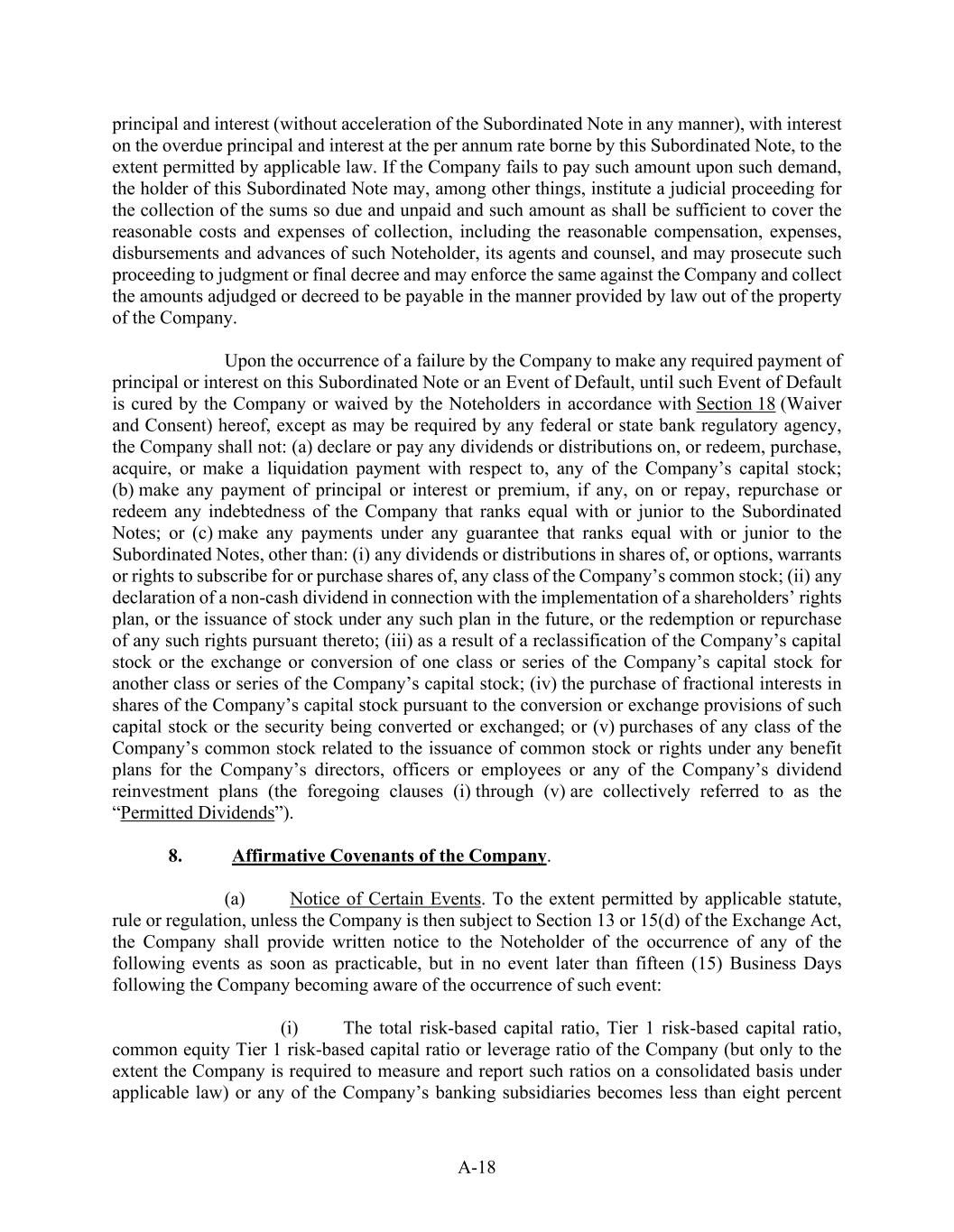 A-18 principal and interest (without acceleration of the Subordinated Note in any manner), with interest on the overdue principal and interest at the per annum rate borne by this Subordinated Note, to the extent permitted by applicable law. If the Company fails to pay such amount upon such demand, the holder of this Subordinated Note may, among other things, institute a judicial proceeding for the collection of the sums so due and unpaid and such amount as shall be sufficient to cover the reasonable costs and expenses of collection, including the reasonable compensation, expenses, disbursements and advances of such Noteholder, its agents and counsel, and may prosecute such proceeding to judgment or final decree and may enforce the same against the Company and collect the amounts adjudged or decreed to be payable in the manner provided by law out of the property of the Company. Upon the occurrence of a failure by the Company to make any required payment of principal or interest on this Subordinated Note or an Event of Default, until such Event of Default is cured by the Company or waived by the Noteholders in accordance with Section 18 (Waiver and Consent) hereof, except as may be required by any federal or state bank regulatory agency, the Company shall not: (a) declare or pay any dividends or distributions on, or redeem, purchase, acquire, or make a liquidation payment with respect to, any of the Company’s capital stock; (b) make any payment of principal or interest or premium, if any, on or repay, repurchase or redeem any indebtedness of the Company that ranks equal with or junior to the Subordinated Notes; or (c) make any payments under any guarantee that ranks equal with or junior to the Subordinated Notes, other than: (i) any dividends or distributions in shares of, or options, warrants or rights to subscribe for or purchase shares of, any class of the Company’s common stock; (ii) any declaration of a non-cash dividend in connection with the implementation of a shareholders’ rights plan, or the issuance of stock under any such plan in the future, or the redemption or repurchase of any such rights pursuant thereto; (iii) as a result of a reclassification of the Company’s capital stock or the exchange or conversion of one class or series of the Company’s capital stock for another class or series of the Company’s capital stock; (iv) the purchase of fractional interests in shares of the Company’s capital stock pursuant to the conversion or exchange provisions of such capital stock or the security being converted or exchanged; or (v) purchases of any class of the Company’s common stock related to the issuance of common stock or rights under any benefit plans for the Company’s directors, officers or employees or any of the Company’s dividend reinvestment plans (the foregoing clauses (i) through (v) are collectively referred to as the “Permitted Dividends”). 8.             Affirmative Covenants of the Company. (a)            Notice of Certain Events. To the extent permitted by applicable statute, rule or regulation, unless the Company is then subject to Section 13 or 15(d) of the Exchange Act, the Company shall provide written notice to the Noteholder of the occurrence of any of the following events as soon as practicable, but in no event later than fifteen (15) Business Days following the Company becoming aware of the occurrence of such event: (i)            The total risk-based capital ratio, Tier 1 risk-based capital ratio, common equity Tier 1 risk-based capital ratio or leverage ratio of the Company (but only to the extent the Company is required to measure and report such ratios on a consolidated basis under applicable law) or any of the Company’s banking subsidiaries becomes less than eight percent