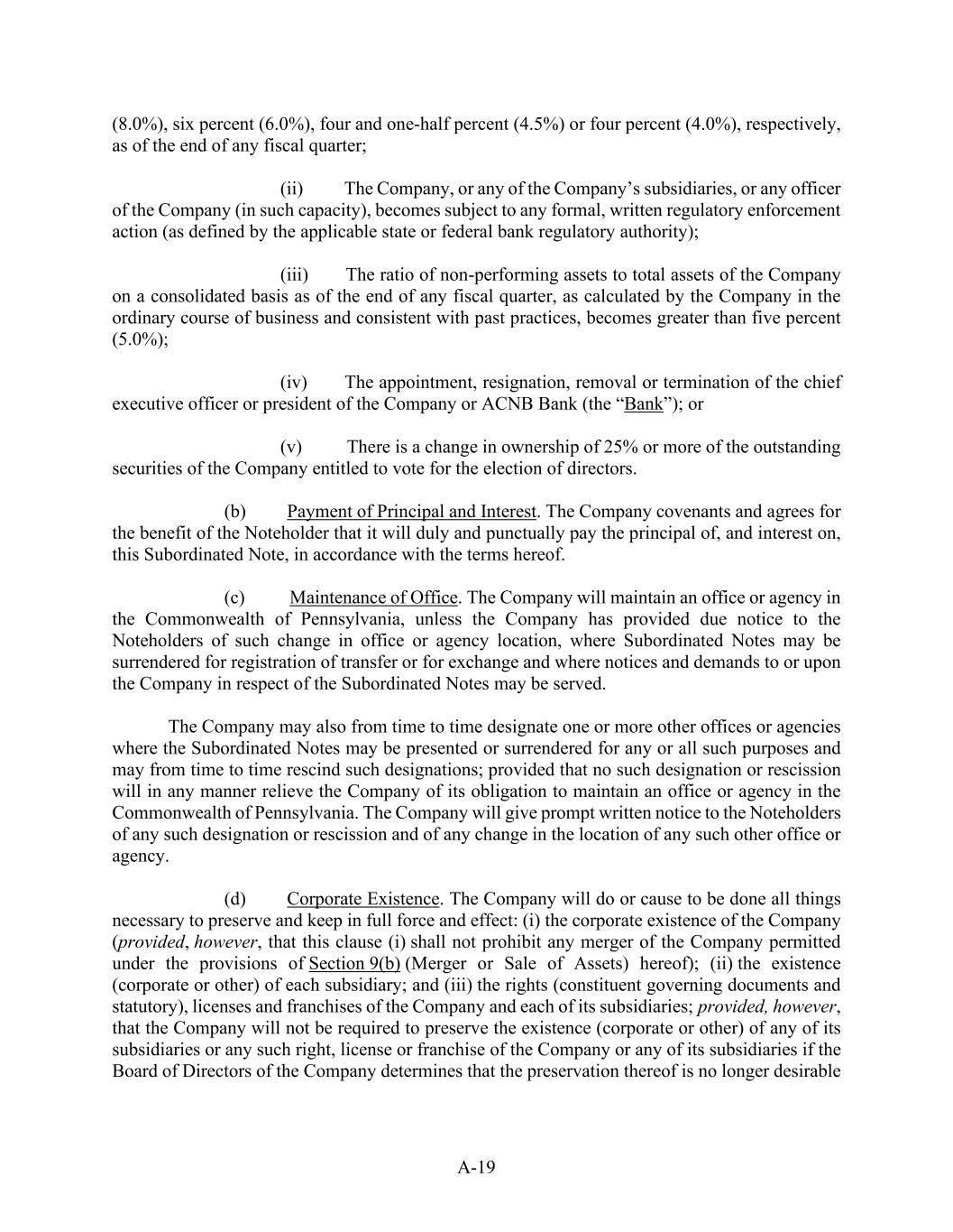 A-19 (8.0%), six percent (6.0%), four and one-half percent (4.5%) or four percent (4.0%), respectively, as of the end of any fiscal quarter; (ii)           The Company, or any of the Company’s subsidiaries, or any officer of the Company (in such capacity), becomes subject to any formal, written regulatory enforcement action (as defined by the applicable state or federal bank regulatory authority); (iii)          The ratio of non-performing assets to total assets of the Company on a consolidated basis as of the end of any fiscal quarter, as calculated by the Company in the ordinary course of business and consistent with past practices, becomes greater than five percent (5.0%); (iv)          The appointment, resignation, removal or termination of the chief executive officer or president of the Company or ACNB Bank (the “Bank”); or (v)            There is a change in ownership of 25% or more of the outstanding securities of the Company entitled to vote for the election of directors. (b)           Payment of Principal and Interest. The Company covenants and agrees for the benefit of the Noteholder that it will duly and punctually pay the principal of, and interest on, this Subordinated Note, in accordance with the terms hereof. (c)            Maintenance of Office. The Company will maintain an office or agency in the Commonwealth of Pennsylvania, unless the Company has provided due notice to the Noteholders of such change in office or agency location, where Subordinated Notes may be surrendered for registration of transfer or for exchange and where notices and demands to or upon the Company in respect of the Subordinated Notes may be served. The Company may also from time to time designate one or more other offices or agencies where the Subordinated Notes may be presented or surrendered for any or all such purposes and may from time to time rescind such designations; provided that no such designation or rescission will in any manner relieve the Company of its obligation to maintain an office or agency in the Commonwealth of Pennsylvania. The Company will give prompt written notice to the Noteholders of any such designation or rescission and of any change in the location of any such other office or agency. (d)           Corporate Existence. The Company will do or cause to be done all things necessary to preserve and keep in full force and effect: (i) the corporate existence of the Company (provided, however, that this clause (i) shall not prohibit any merger of the Company permitted under the provisions of Section 9(b) (Merger or Sale of Assets) hereof); (ii) the existence (corporate or other) of each subsidiary; and (iii) the rights (constituent governing documents and statutory), licenses and franchises of the Company and each of its subsidiaries; provided, however, that the Company will not be required to preserve the existence (corporate or other) of any of its subsidiaries or any such right, license or franchise of the Company or any of its subsidiaries if the Board of Directors of the Company determines that the preservation thereof is no longer desirable