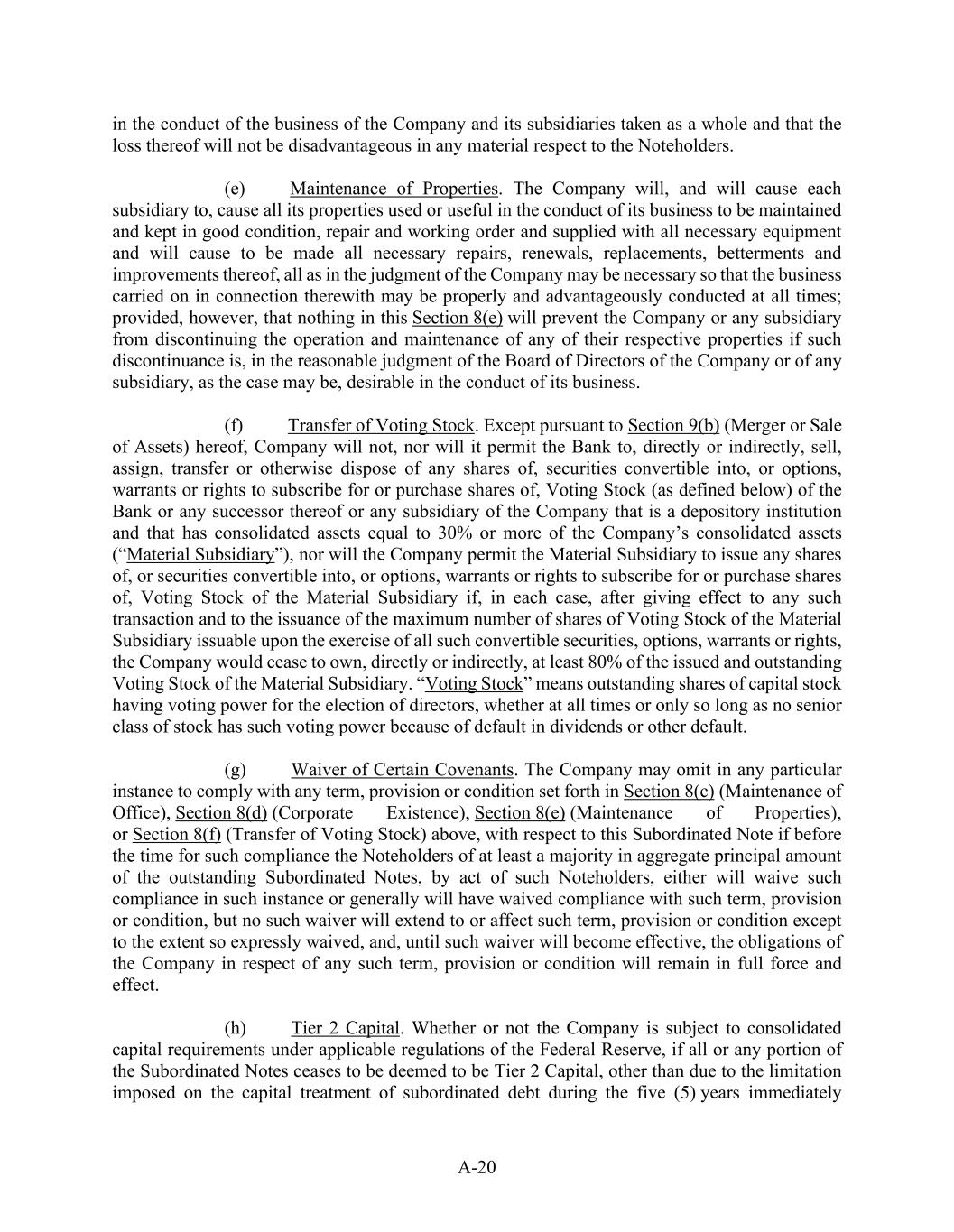 A-20 in the conduct of the business of the Company and its subsidiaries taken as a whole and that the loss thereof will not be disadvantageous in any material respect to the Noteholders. (e)            Maintenance of Properties. The Company will, and will cause each subsidiary to, cause all its properties used or useful in the conduct of its business to be maintained and kept in good condition, repair and working order and supplied with all necessary equipment and will cause to be made all necessary repairs, renewals, replacements, betterments and improvements thereof, all as in the judgment of the Company may be necessary so that the business carried on in connection therewith may be properly and advantageously conducted at all times; provided, however, that nothing in this Section 8(e) will prevent the Company or any subsidiary from discontinuing the operation and maintenance of any of their respective properties if such discontinuance is, in the reasonable judgment of the Board of Directors of the Company or of any subsidiary, as the case may be, desirable in the conduct of its business. (f)            Transfer of Voting Stock. Except pursuant to Section 9(b) (Merger or Sale of Assets) hereof, Company will not, nor will it permit the Bank to, directly or indirectly, sell, assign, transfer or otherwise dispose of any shares of, securities convertible into, or options, warrants or rights to subscribe for or purchase shares of, Voting Stock (as defined below) of the Bank or any successor thereof or any subsidiary of the Company that is a depository institution and that has consolidated assets equal to 30% or more of the Company’s consolidated assets (“Material Subsidiary”), nor will the Company permit the Material Subsidiary to issue any shares of, or securities convertible into, or options, warrants or rights to subscribe for or purchase shares of, Voting Stock of the Material Subsidiary if, in each case, after giving effect to any such transaction and to the issuance of the maximum number of shares of Voting Stock of the Material Subsidiary issuable upon the exercise of all such convertible securities, options, warrants or rights, the Company would cease to own, directly or indirectly, at least 80% of the issued and outstanding Voting Stock of the Material Subsidiary. “Voting Stock” means outstanding shares of capital stock having voting power for the election of directors, whether at all times or only so long as no senior class of stock has such voting power because of default in dividends or other default. (g)            Waiver of Certain Covenants. The Company may omit in any particular instance to comply with any term, provision or condition set forth in Section 8(c) (Maintenance of Office), Section 8(d) (Corporate Existence), Section 8(e) (Maintenance of Properties), or Section 8(f) (Transfer of Voting Stock) above, with respect to this Subordinated Note if before the time for such compliance the Noteholders of at least a majority in aggregate principal amount of the outstanding Subordinated Notes, by act of such Noteholders, either will waive such compliance in such instance or generally will have waived compliance with such term, provision or condition, but no such waiver will extend to or affect such term, provision or condition except to the extent so expressly waived, and, until such waiver will become effective, the obligations of the Company in respect of any such term, provision or condition will remain in full force and effect. (h)            Tier 2 Capital. Whether or not the Company is subject to consolidated capital requirements under applicable regulations of the Federal Reserve, if all or any portion of the Subordinated Notes ceases to be deemed to be Tier 2 Capital, other than due to the limitation imposed on the capital treatment of subordinated debt during the five (5) years immediately
