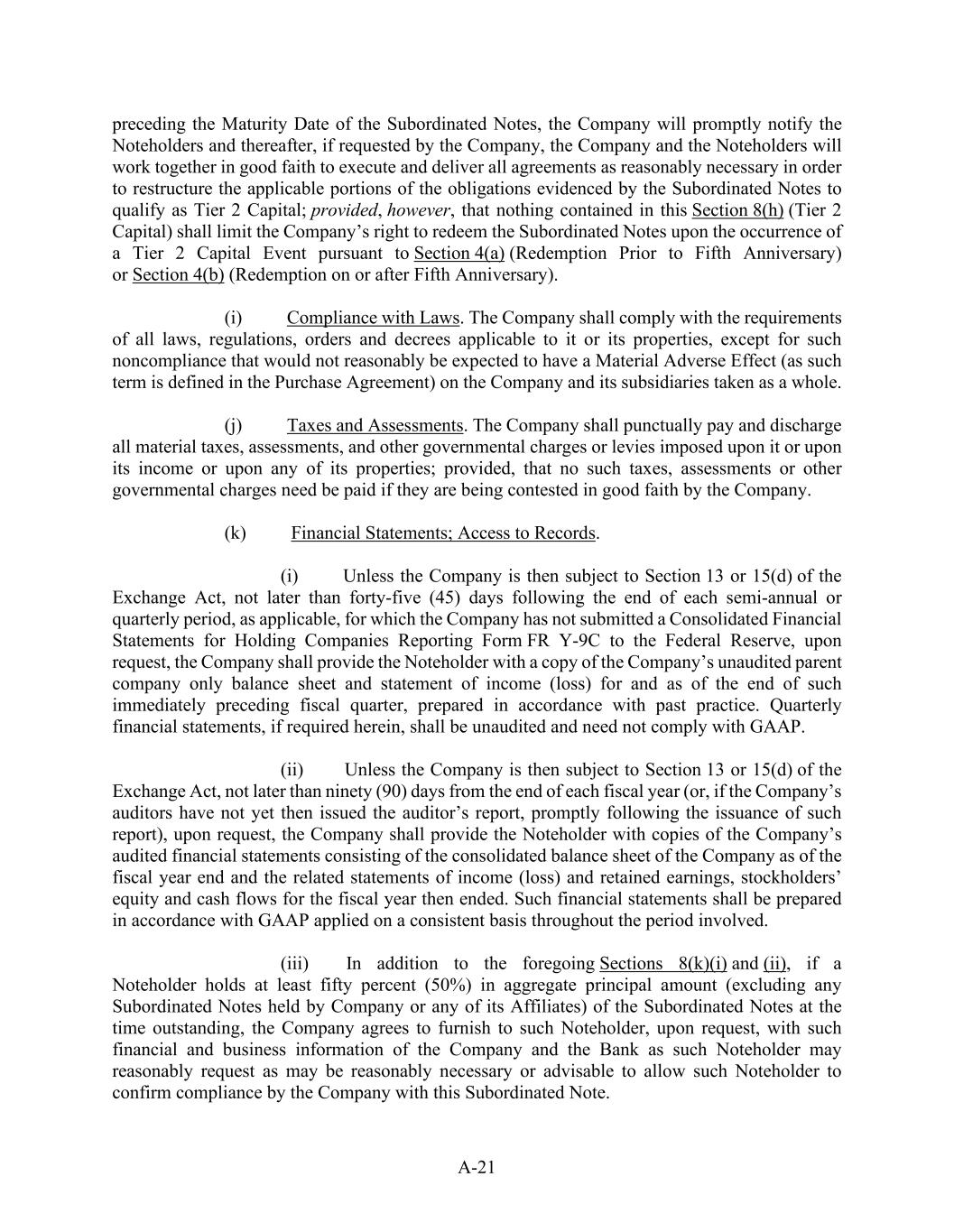 A-21 preceding the Maturity Date of the Subordinated Notes, the Company will promptly notify the Noteholders and thereafter, if requested by the Company, the Company and the Noteholders will work together in good faith to execute and deliver all agreements as reasonably necessary in order to restructure the applicable portions of the obligations evidenced by the Subordinated Notes to qualify as Tier 2 Capital; provided, however, that nothing contained in this Section 8(h) (Tier 2 Capital) shall limit the Company’s right to redeem the Subordinated Notes upon the occurrence of a Tier 2 Capital Event pursuant to Section 4(a) (Redemption Prior to Fifth Anniversary) or Section 4(b) (Redemption on or after Fifth Anniversary). (i)            Compliance with Laws. The Company shall comply with the requirements of all laws, regulations, orders and decrees applicable to it or its properties, except for such noncompliance that would not reasonably be expected to have a Material Adverse Effect (as such term is defined in the Purchase Agreement) on the Company and its subsidiaries taken as a whole. (j)            Taxes and Assessments. The Company shall punctually pay and discharge all material taxes, assessments, and other governmental charges or levies imposed upon it or upon its income or upon any of its properties; provided, that no such taxes, assessments or other governmental charges need be paid if they are being contested in good faith by the Company. (k)            Financial Statements; Access to Records. (i)            Unless the Company is then subject to Section 13 or 15(d) of the Exchange Act, not later than forty-five (45) days following the end of each semi-annual or quarterly period, as applicable, for which the Company has not submitted a Consolidated Financial Statements for Holding Companies Reporting Form FR Y-9C to the Federal Reserve, upon request, the Company shall provide the Noteholder with a copy of the Company’s unaudited parent company only balance sheet and statement of income (loss) for and as of the end of such immediately preceding fiscal quarter, prepared in accordance with past practice. Quarterly financial statements, if required herein, shall be unaudited and need not comply with GAAP. (ii)           Unless the Company is then subject to Section 13 or 15(d) of the Exchange Act, not later than ninety (90) days from the end of each fiscal year (or, if the Company’s auditors have not yet then issued the auditor’s report, promptly following the issuance of such report), upon request, the Company shall provide the Noteholder with copies of the Company’s audited financial statements consisting of the consolidated balance sheet of the Company as of the fiscal year end and the related statements of income (loss) and retained earnings, stockholders’ equity and cash flows for the fiscal year then ended. Such financial statements shall be prepared in accordance with GAAP applied on a consistent basis throughout the period involved. (iii)          In addition to the foregoing Sections 8(k)(i) and (ii), if a Noteholder holds at least fifty percent (50%) in aggregate principal amount (excluding any Subordinated Notes held by Company or any of its Affiliates) of the Subordinated Notes at the time outstanding, the Company agrees to furnish to such Noteholder, upon request, with such financial and business information of the Company and the Bank as such Noteholder may reasonably request as may be reasonably necessary or advisable to allow such Noteholder to confirm compliance by the Company with this Subordinated Note.