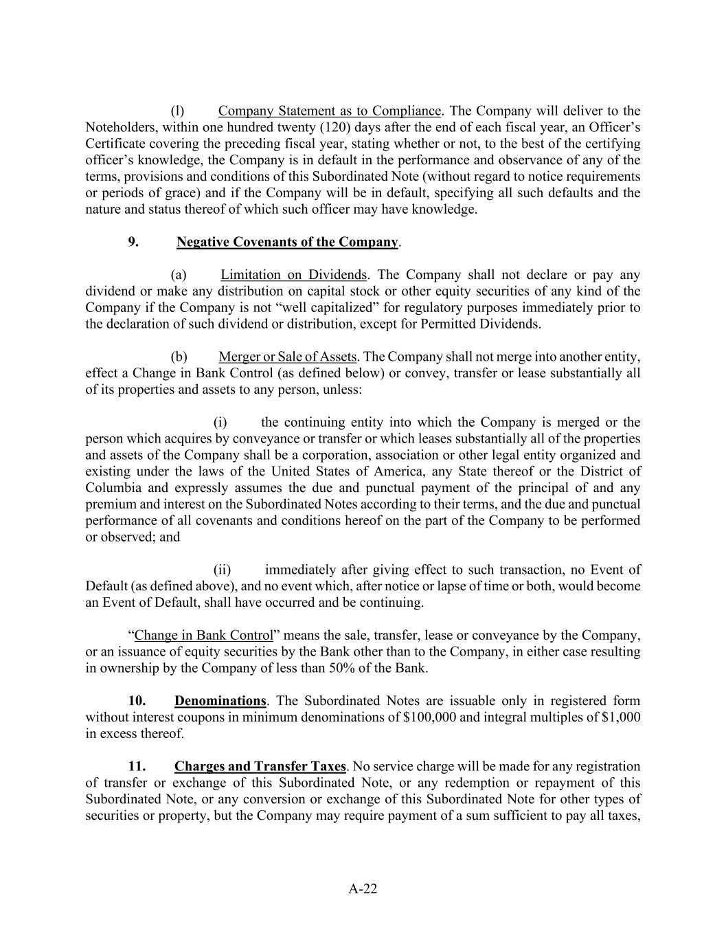 A-22 (l)            Company Statement as to Compliance. The Company will deliver to the Noteholders, within one hundred twenty (120) days after the end of each fiscal year, an Officer’s Certificate covering the preceding fiscal year, stating whether or not, to the best of the certifying officer’s knowledge, the Company is in default in the performance and observance of any of the terms, provisions and conditions of this Subordinated Note (without regard to notice requirements or periods of grace) and if the Company will be in default, specifying all such defaults and the nature and status thereof of which such officer may have knowledge. 9.             Negative Covenants of the Company. (a)            Limitation on Dividends. The Company shall not declare or pay any dividend or make any distribution on capital stock or other equity securities of any kind of the Company if the Company is not “well capitalized” for regulatory purposes immediately prior to the declaration of such dividend or distribution, except for Permitted Dividends. (b)           Merger or Sale of Assets. The Company shall not merge into another entity, effect a Change in Bank Control (as defined below) or convey, transfer or lease substantially all of its properties and assets to any person, unless: (i)            the continuing entity into which the Company is merged or the person which acquires by conveyance or transfer or which leases substantially all of the properties and assets of the Company shall be a corporation, association or other legal entity organized and existing under the laws of the United States of America, any State thereof or the District of Columbia and expressly assumes the due and punctual payment of the principal of and any premium and interest on the Subordinated Notes according to their terms, and the due and punctual performance of all covenants and conditions hereof on the part of the Company to be performed or observed; and (ii)            immediately after giving effect to such transaction, no Event of Default (as defined above), and no event which, after notice or lapse of time or both, would become an Event of Default, shall have occurred and be continuing. “Change in Bank Control” means the sale, transfer, lease or conveyance by the Company, or an issuance of equity securities by the Bank other than to the Company, in either case resulting in ownership by the Company of less than 50% of the Bank. 10.          Denominations. The Subordinated Notes are issuable only in registered form without interest coupons in minimum denominations of $100,000 and integral multiples of $1,000 in excess thereof. 11.          Charges and Transfer Taxes. No service charge will be made for any registration of transfer or exchange of this Subordinated Note, or any redemption or repayment of this Subordinated Note, or any conversion or exchange of this Subordinated Note for other types of securities or property, but the Company may require payment of a sum sufficient to pay all taxes,