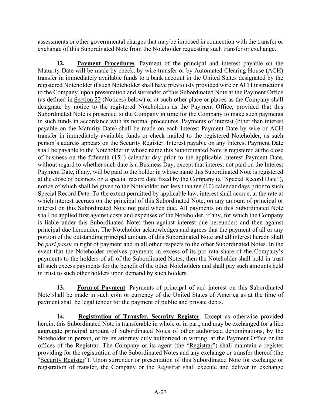 A-23 assessments or other governmental charges that may be imposed in connection with the transfer or exchange of this Subordinated Note from the Noteholder requesting such transfer or exchange. 12.          Payment Procedures. Payment of the principal and interest payable on the Maturity Date will be made by check, by wire transfer or by Automated Clearing House (ACH) transfer in immediately available funds to a bank account in the United States designated by the registered Noteholder if such Noteholder shall have previously provided wire or ACH instructions to the Company, upon presentation and surrender of this Subordinated Note at the Payment Office (as defined in Section 22 (Notices) below) or at such other place or places as the Company shall designate by notice to the registered Noteholders as the Payment Office, provided that this Subordinated Note is presented to the Company in time for the Company to make such payments in such funds in accordance with its normal procedures. Payments of interest (other than interest payable on the Maturity Date) shall be made on each Interest Payment Date by wire or ACH transfer in immediately available funds or check mailed to the registered Noteholder, as such person’s address appears on the Security Register. Interest payable on any Interest Payment Date shall be payable to the Noteholder in whose name this Subordinated Note is registered at the close of business on the fifteenth (15th) calendar day prior to the applicable Interest Payment Date, without regard to whether such date is a Business Day, except that interest not paid on the Interest Payment Date, if any, will be paid to the holder in whose name this Subordinated Note is registered at the close of business on a special record date fixed by the Company (a “Special Record Date”), notice of which shall be given to the Noteholder not less than ten (10) calendar days prior to such Special Record Date. To the extent permitted by applicable law, interest shall accrue, at the rate at which interest accrues on the principal of this Subordinated Note, on any amount of principal or interest on this Subordinated Note not paid when due. All payments on this Subordinated Note shall be applied first against costs and expenses of the Noteholder, if any, for which the Company is liable under this Subordinated Note; then against interest due hereunder; and then against principal due hereunder. The Noteholder acknowledges and agrees that the payment of all or any portion of the outstanding principal amount of this Subordinated Note and all interest hereon shall be pari passu in right of payment and in all other respects to the other Subordinated Notes. In the event that the Noteholder receives payments in excess of its pro rata share of the Company’s payments to the holders of all of the Subordinated Notes, then the Noteholder shall hold in trust all such excess payments for the benefit of the other Noteholders and shall pay such amounts held in trust to such other holders upon demand by such holders. 13.          Form of Payment. Payments of principal of and interest on this Subordinated Note shall be made in such coin or currency of the United States of America as at the time of payment shall be legal tender for the payment of public and private debts. 14.           Registration of Transfer, Security Register. Except as otherwise provided herein, this Subordinated Note is transferable in whole or in part, and may be exchanged for a like aggregate principal amount of Subordinated Notes of other authorized denominations, by the Noteholder in person, or by its attorney duly authorized in writing, at the Payment Office or the offices of the Registrar. The Company or its agent (the “Registrar”) shall maintain a register providing for the registration of the Subordinated Notes and any exchange or transfer thereof (the “Security Register”). Upon surrender or presentation of this Subordinated Note for exchange or registration of transfer, the Company or the Registrar shall execute and deliver in exchange