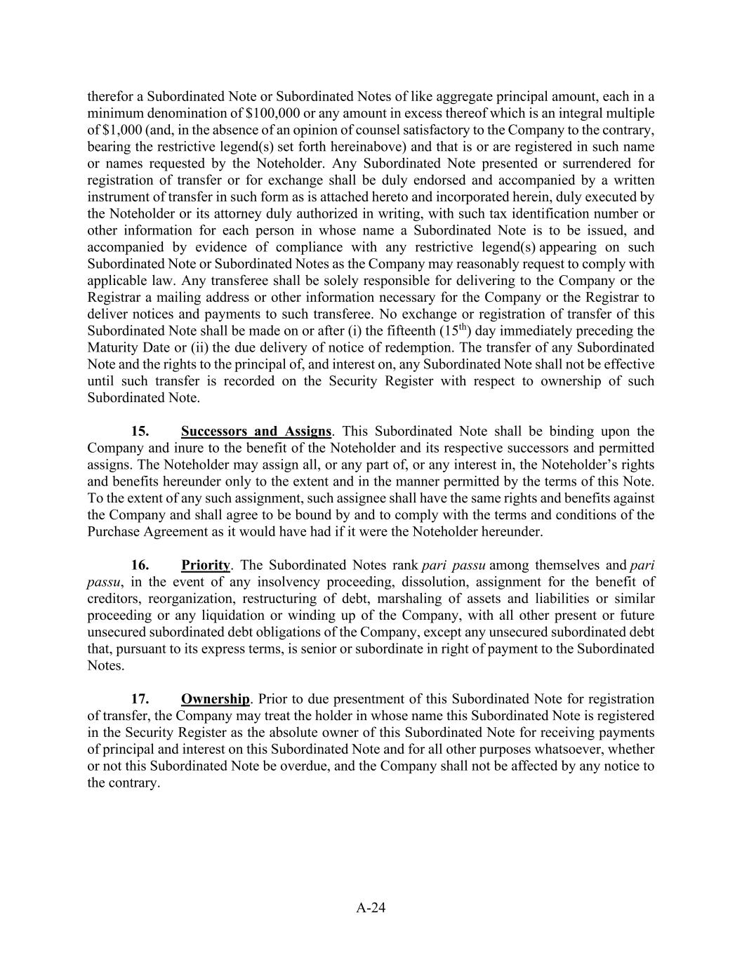 A-24 therefor a Subordinated Note or Subordinated Notes of like aggregate principal amount, each in a minimum denomination of $100,000 or any amount in excess thereof which is an integral multiple of $1,000 (and, in the absence of an opinion of counsel satisfactory to the Company to the contrary, bearing the restrictive legend(s) set forth hereinabove) and that is or are registered in such name or names requested by the Noteholder. Any Subordinated Note presented or surrendered for registration of transfer or for exchange shall be duly endorsed and accompanied by a written instrument of transfer in such form as is attached hereto and incorporated herein, duly executed by the Noteholder or its attorney duly authorized in writing, with such tax identification number or other information for each person in whose name a Subordinated Note is to be issued, and accompanied by evidence of compliance with any restrictive legend(s) appearing on such Subordinated Note or Subordinated Notes as the Company may reasonably request to comply with applicable law. Any transferee shall be solely responsible for delivering to the Company or the Registrar a mailing address or other information necessary for the Company or the Registrar to deliver notices and payments to such transferee. No exchange or registration of transfer of this Subordinated Note shall be made on or after (i) the fifteenth (15th) day immediately preceding the Maturity Date or (ii) the due delivery of notice of redemption. The transfer of any Subordinated Note and the rights to the principal of, and interest on, any Subordinated Note shall not be effective until such transfer is recorded on the Security Register with respect to ownership of such Subordinated Note. 15.           Successors and Assigns. This Subordinated Note shall be binding upon the Company and inure to the benefit of the Noteholder and its respective successors and permitted assigns. The Noteholder may assign all, or any part of, or any interest in, the Noteholder’s rights and benefits hereunder only to the extent and in the manner permitted by the terms of this Note. To the extent of any such assignment, such assignee shall have the same rights and benefits against the Company and shall agree to be bound by and to comply with the terms and conditions of the Purchase Agreement as it would have had if it were the Noteholder hereunder. 16.           Priority. The Subordinated Notes rank pari passu among themselves and pari passu, in the event of any insolvency proceeding, dissolution, assignment for the benefit of creditors, reorganization, restructuring of debt, marshaling of assets and liabilities or similar proceeding or any liquidation or winding up of the Company, with all other present or future unsecured subordinated debt obligations of the Company, except any unsecured subordinated debt that, pursuant to its express terms, is senior or subordinate in right of payment to the Subordinated Notes. 17.           Ownership. Prior to due presentment of this Subordinated Note for registration of transfer, the Company may treat the holder in whose name this Subordinated Note is registered in the Security Register as the absolute owner of this Subordinated Note for receiving payments of principal and interest on this Subordinated Note and for all other purposes whatsoever, whether or not this Subordinated Note be overdue, and the Company shall not be affected by any notice to the contrary.
