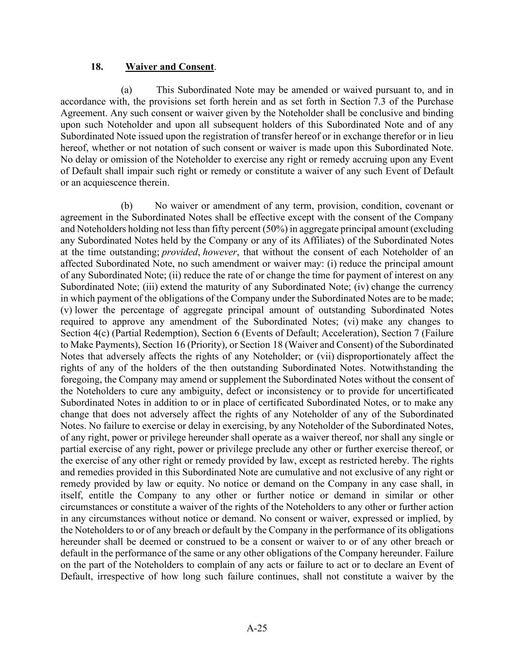 A-25 18.           Waiver and Consent. (a)            This Subordinated Note may be amended or waived pursuant to, and in accordance with, the provisions set forth herein and as set forth in Section 7.3 of the Purchase Agreement. Any such consent or waiver given by the Noteholder shall be conclusive and binding upon such Noteholder and upon all subsequent holders of this Subordinated Note and of any Subordinated Note issued upon the registration of transfer hereof or in exchange therefor or in lieu hereof, whether or not notation of such consent or waiver is made upon this Subordinated Note. No delay or omission of the Noteholder to exercise any right or remedy accruing upon any Event of Default shall impair such right or remedy or constitute a waiver of any such Event of Default or an acquiescence therein. (b)           No waiver or amendment of any term, provision, condition, covenant or agreement in the Subordinated Notes shall be effective except with the consent of the Company and Noteholders holding not less than fifty percent (50%) in aggregate principal amount (excluding any Subordinated Notes held by the Company or any of its Affiliates) of the Subordinated Notes at the time outstanding; provided, however, that without the consent of each Noteholder of an affected Subordinated Note, no such amendment or waiver may: (i) reduce the principal amount of any Subordinated Note; (ii) reduce the rate of or change the time for payment of interest on any Subordinated Note; (iii) extend the maturity of any Subordinated Note; (iv) change the currency in which payment of the obligations of the Company under the Subordinated Notes are to be made; (v) lower the percentage of aggregate principal amount of outstanding Subordinated Notes required to approve any amendment of the Subordinated Notes; (vi) make any changes to Section 4(c) (Partial Redemption), Section 6 (Events of Default; Acceleration), Section 7 (Failure to Make Payments), Section 16 (Priority), or Section 18 (Waiver and Consent) of the Subordinated Notes that adversely affects the rights of any Noteholder; or (vii) disproportionately affect the rights of any of the holders of the then outstanding Subordinated Notes. Notwithstanding the foregoing, the Company may amend or supplement the Subordinated Notes without the consent of the Noteholders to cure any ambiguity, defect or inconsistency or to provide for uncertificated Subordinated Notes in addition to or in place of certificated Subordinated Notes, or to make any change that does not adversely affect the rights of any Noteholder of any of the Subordinated Notes. No failure to exercise or delay in exercising, by any Noteholder of the Subordinated Notes, of any right, power or privilege hereunder shall operate as a waiver thereof, nor shall any single or partial exercise of any right, power or privilege preclude any other or further exercise thereof, or the exercise of any other right or remedy provided by law, except as restricted hereby. The rights and remedies provided in this Subordinated Note are cumulative and not exclusive of any right or remedy provided by law or equity. No notice or demand on the Company in any case shall, in itself, entitle the Company to any other or further notice or demand in similar or other circumstances or constitute a waiver of the rights of the Noteholders to any other or further action in any circumstances without notice or demand. No consent or waiver, expressed or implied, by the Noteholders to or of any breach or default by the Company in the performance of its obligations hereunder shall be deemed or construed to be a consent or waiver to or of any other breach or default in the performance of the same or any other obligations of the Company hereunder. Failure on the part of the Noteholders to complain of any acts or failure to act or to declare an Event of Default, irrespective of how long such failure continues, shall not constitute a waiver by the