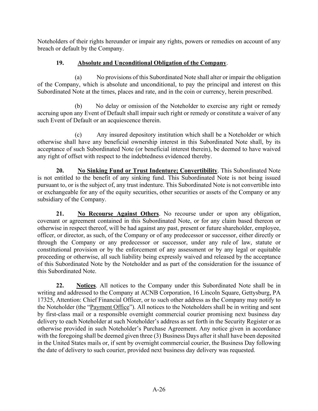 A-26 Noteholders of their rights hereunder or impair any rights, powers or remedies on account of any breach or default by the Company. 19.           Absolute and Unconditional Obligation of the Company. (a)            No provisions of this Subordinated Note shall alter or impair the obligation of the Company, which is absolute and unconditional, to pay the principal and interest on this Subordinated Note at the times, places and rate, and in the coin or currency, herein prescribed. (b)           No delay or omission of the Noteholder to exercise any right or remedy accruing upon any Event of Default shall impair such right or remedy or constitute a waiver of any such Event of Default or an acquiescence therein. (c)            Any insured depository institution which shall be a Noteholder or which otherwise shall have any beneficial ownership interest in this Subordinated Note shall, by its acceptance of such Subordinated Note (or beneficial interest therein), be deemed to have waived any right of offset with respect to the indebtedness evidenced thereby. 20.           No Sinking Fund or Trust Indenture; Convertibility. This Subordinated Note is not entitled to the benefit of any sinking fund. This Subordinated Note is not being issued pursuant to, or is the subject of, any trust indenture. This Subordinated Note is not convertible into or exchangeable for any of the equity securities, other securities or assets of the Company or any subsidiary of the Company. 21.           No Recourse Against Others. No recourse under or upon any obligation, covenant or agreement contained in this Subordinated Note, or for any claim based thereon or otherwise in respect thereof, will be had against any past, present or future shareholder, employee, officer, or director, as such, of the Company or of any predecessor or successor, either directly or through the Company or any predecessor or successor, under any rule of law, statute or constitutional provision or by the enforcement of any assessment or by any legal or equitable proceeding or otherwise, all such liability being expressly waived and released by the acceptance of this Subordinated Note by the Noteholder and as part of the consideration for the issuance of this Subordinated Note. 22.          Notices. All notices to the Company under this Subordinated Note shall be in writing and addressed to the Company at ACNB Corporation, 16 Lincoln Square, Gettysburg, PA 17325, Attention: Chief Financial Officer, or to such other address as the Company may notify to the Noteholder (the “Payment Office”). All notices to the Noteholders shall be in writing and sent by first-class mail or a responsible overnight commercial courier promising next business day delivery to each Noteholder at such Noteholder’s address as set forth in the Security Register or as otherwise provided in such Noteholder’s Purchase Agreement. Any notice given in accordance with the foregoing shall be deemed given three (3) Business Days after it shall have been deposited in the United States mails or, if sent by overnight commercial courier, the Business Day following the date of delivery to such courier, provided next business day delivery was requested.