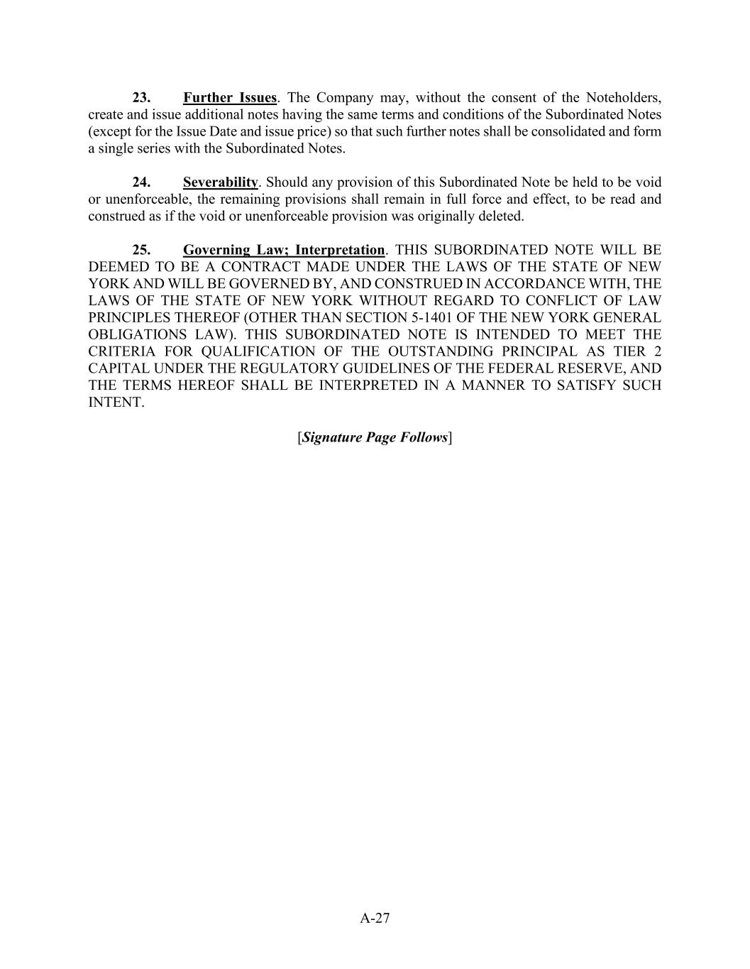 A-27 23.           Further Issues. The Company may, without the consent of the Noteholders, create and issue additional notes having the same terms and conditions of the Subordinated Notes (except for the Issue Date and issue price) so that such further notes shall be consolidated and form a single series with the Subordinated Notes. 24.           Severability. Should any provision of this Subordinated Note be held to be void or unenforceable, the remaining provisions shall remain in full force and effect, to be read and construed as if the void or unenforceable provision was originally deleted. 25.           Governing Law; Interpretation. THIS SUBORDINATED NOTE WILL BE DEEMED TO BE A CONTRACT MADE UNDER THE LAWS OF THE STATE OF NEW YORK AND WILL BE GOVERNED BY, AND CONSTRUED IN ACCORDANCE WITH, THE LAWS OF THE STATE OF NEW YORK WITHOUT REGARD TO CONFLICT OF LAW PRINCIPLES THEREOF (OTHER THAN SECTION 5-1401 OF THE NEW YORK GENERAL OBLIGATIONS LAW). THIS SUBORDINATED NOTE IS INTENDED TO MEET THE CRITERIA FOR QUALIFICATION OF THE OUTSTANDING PRINCIPAL AS TIER 2 CAPITAL UNDER THE REGULATORY GUIDELINES OF THE FEDERAL RESERVE, AND THE TERMS HEREOF SHALL BE INTERPRETED IN A MANNER TO SATISFY SUCH INTENT. [Signature Page Follows]