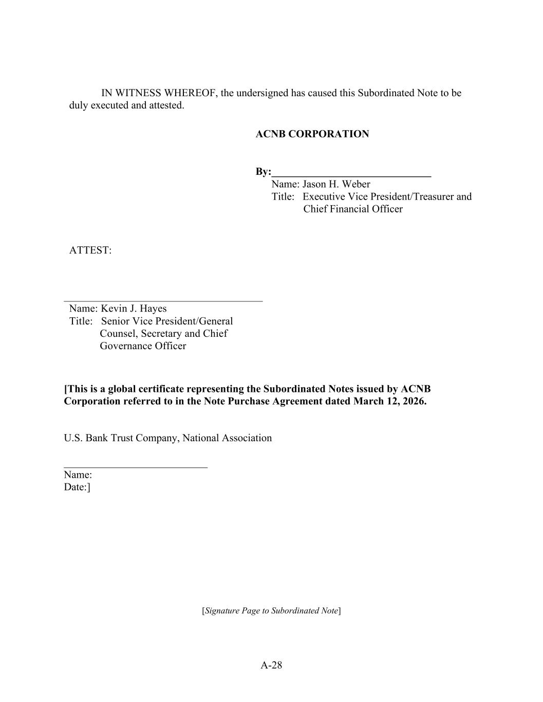 A-28 IN WITNESS WHEREOF, the undersigned has caused this Subordinated Note to be duly executed and attested. ACNB CORPORATION By:______________________________ Name: Jason H. Weber Title: Executive Vice President/Treasurer and Chief Financial Officer ATTEST: Name: Kevin J. Hayes Title: Senior Vice President/General Counsel, Secretary and Chief Governance Officer [This is a global certificate representing the Subordinated Notes issued by ACNB Corporation referred to in the Note Purchase Agreement dated March 12, 2026. U.S. Bank Trust Company, National Association ___________________________ Name: Date:] [Signature Page to Subordinated Note]
