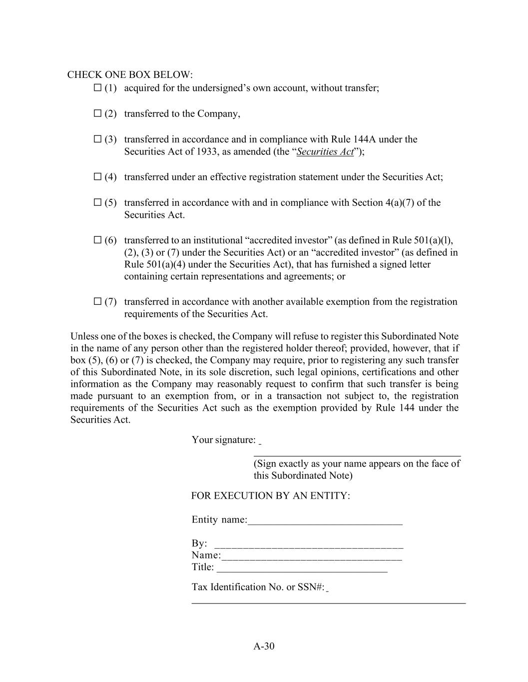 A-30 CHECK ONE BOX BELOW: ☐ (1) acquired for the undersigned’s own account, without transfer; ☐ (2) transferred to the Company, ☐ (3) transferred in accordance and in compliance with Rule 144A under the Securities Act of 1933, as amended (the “Securities Act”); ☐ (4) transferred under an effective registration statement under the Securities Act; ☐ (5) transferred in accordance with and in compliance with Section 4(a)(7) of the Securities Act. ☐ (6) transferred to an institutional “accredited investor” (as defined in Rule 501(a)(l), (2), (3) or (7) under the Securities Act) or an “accredited investor” (as defined in Rule 501(a)(4) under the Securities Act), that has furnished a signed letter containing certain representations and agreements; or ☐ (7) transferred in accordance with another available exemption from the registration requirements of the Securities Act. Unless one of the boxes is checked, the Company will refuse to register this Subordinated Note in the name of any person other than the registered holder thereof; provided, however, that if box (5), (6) or (7) is checked, the Company may require, prior to registering any such transfer of this Subordinated Note, in its sole discretion, such legal opinions, certifications and other information as the Company may reasonably request to confirm that such transfer is being made pursuant to an exemption from, or in a transaction not subject to, the registration requirements of the Securities Act such as the exemption provided by Rule 144 under the Securities Act. Your signature: (Sign exactly as your name appears on the face of this Subordinated Note) FOR EXECUTION BY AN ENTITY: Entity name:_____________________________ By: _________________________________ Name:________________________________ Title: _________________________________ Tax Identification No. or SSN#: