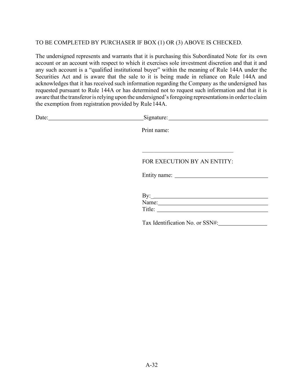 A-32 TO BE COMPLETED BY PURCHASER IF BOX (1) OR (3) ABOVE IS CHECKED. The undersigned represents and warrants that it is purchasing this Subordinated Note for its own account or an account with respect to which it exercises sole investment discretion and that it and any such account is a “qualified institutional buyer” within the meaning of Rule 144A under the Securities Act and is aware that the sale to it is being made in reliance on Rule 144A and acknowledges that it has received such information regarding the Company as the undersigned has requested pursuant to Rule 144A or has determined not to request such information and that it is aware that the transferor is relying upon the undersigned’s foregoing representations in order to claim the exemption from registration provided by Rule 144A. Date: Signature: Print name: FOR EXECUTION BY AN ENTITY: Entity name: By:_ Name: Title: Tax Identification No. or SSN#: