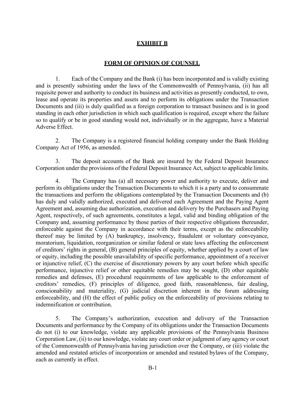 B-1 EXHIBIT B FORM OF OPINION OF COUNSEL 1. Each of the Company and the Bank (i) has been incorporated and is validly existing and is presently subsisting under the laws of the Commonwealth of Pennsylvania, (ii) has all requisite power and authority to conduct its business and activities as presently conducted, to own, lease and operate its properties and assets and to perform its obligations under the Transaction Documents and (iii) is duly qualified as a foreign corporation to transact business and is in good standing in each other jurisdiction in which such qualification is required, except where the failure so to qualify or be in good standing would not, individually or in the aggregate, have a Material Adverse Effect. 2. The Company is a registered financial holding company under the Bank Holding Company Act of 1956, as amended. 3. The deposit accounts of the Bank are insured by the Federal Deposit Insurance Corporation under the provisions of the Federal Deposit Insurance Act, subject to applicable limits. 4. The Company has (a) all necessary power and authority to execute, deliver and perform its obligations under the Transaction Documents to which it is a party and to consummate the transactions and perform the obligations contemplated by the Transaction Documents and (b) has duly and validly authorized, executed and delivered each Agreement and the Paying Agent Agreement and, assuming due authorization, execution and delivery by the Purchasers and Paying Agent, respectively, of such agreements, constitutes a legal, valid and binding obligation of the Company and, assuming performance by those parties of their respective obligations thereunder, enforceable against the Company in accordance with their terms, except as the enforceability thereof may be limited by (A) bankruptcy, insolvency, fraudulent or voluntary conveyance, moratorium, liquidation, reorganization or similar federal or state laws affecting the enforcement of creditors’ rights in general, (B) general principles of equity, whether applied by a court of law or equity, including the possible unavailability of specific performance, appointment of a receiver or injunctive relief, (C) the exercise of discretionary powers by any court before which specific performance, injunctive relief or other equitable remedies may be sought, (D) other equitable remedies and defenses, (E) procedural requirements of law applicable to the enforcement of creditors’ remedies, (F) principles of diligence, good faith, reasonableness, fair dealing, conscionability and materiality, (G) judicial discretion inherent in the forum addressing enforceability, and (H) the effect of public policy on the enforceability of provisions relating to indemnification or contribution. 5. The Company’s authorization, execution and delivery of the Transaction Documents and performance by the Company of its obligations under the Transaction Documents do not (i) to our knowledge, violate any applicable provisions of the Pennsylvania Business Corporation Law, (ii) to our knowledge, violate any court order or judgment of any agency or court of the Commonwealth of Pennsylvania having jurisdiction over the Company, or (iii) violate the amended and restated articles of incorporation or amended and restated bylaws of the Company, each as currently in effect.