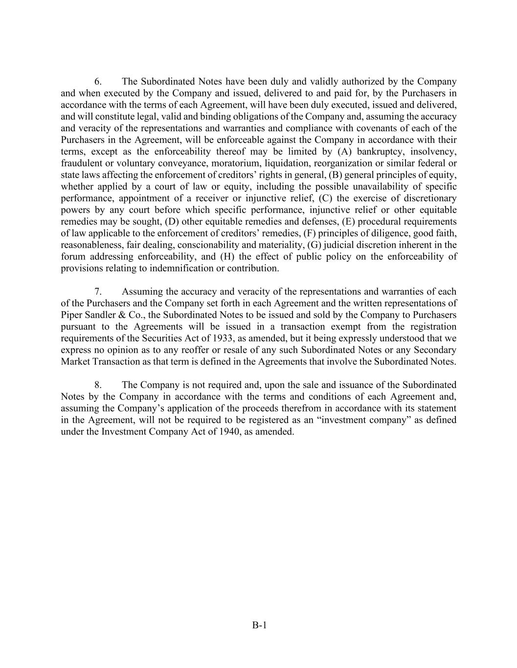 B-1 6. The Subordinated Notes have been duly and validly authorized by the Company and when executed by the Company and issued, delivered to and paid for, by the Purchasers in accordance with the terms of each Agreement, will have been duly executed, issued and delivered, and will constitute legal, valid and binding obligations of the Company and, assuming the accuracy and veracity of the representations and warranties and compliance with covenants of each of the Purchasers in the Agreement, will be enforceable against the Company in accordance with their terms, except as the enforceability thereof may be limited by (A) bankruptcy, insolvency, fraudulent or voluntary conveyance, moratorium, liquidation, reorganization or similar federal or state laws affecting the enforcement of creditors’ rights in general, (B) general principles of equity, whether applied by a court of law or equity, including the possible unavailability of specific performance, appointment of a receiver or injunctive relief, (C) the exercise of discretionary powers by any court before which specific performance, injunctive relief or other equitable remedies may be sought, (D) other equitable remedies and defenses, (E) procedural requirements of law applicable to the enforcement of creditors’ remedies, (F) principles of diligence, good faith, reasonableness, fair dealing, conscionability and materiality, (G) judicial discretion inherent in the forum addressing enforceability, and (H) the effect of public policy on the enforceability of provisions relating to indemnification or contribution. 7. Assuming the accuracy and veracity of the representations and warranties of each of the Purchasers and the Company set forth in each Agreement and the written representations of Piper Sandler & Co., the Subordinated Notes to be issued and sold by the Company to Purchasers pursuant to the Agreements will be issued in a transaction exempt from the registration requirements of the Securities Act of 1933, as amended, but it being expressly understood that we express no opinion as to any reoffer or resale of any such Subordinated Notes or any Secondary Market Transaction as that term is defined in the Agreements that involve the Subordinated Notes. 8. The Company is not required and, upon the sale and issuance of the Subordinated Notes by the Company in accordance with the terms and conditions of each Agreement and, assuming the Company’s application of the proceeds therefrom in accordance with its statement in the Agreement, will not be required to be registered as an “investment company” as defined under the Investment Company Act of 1940, as amended.
