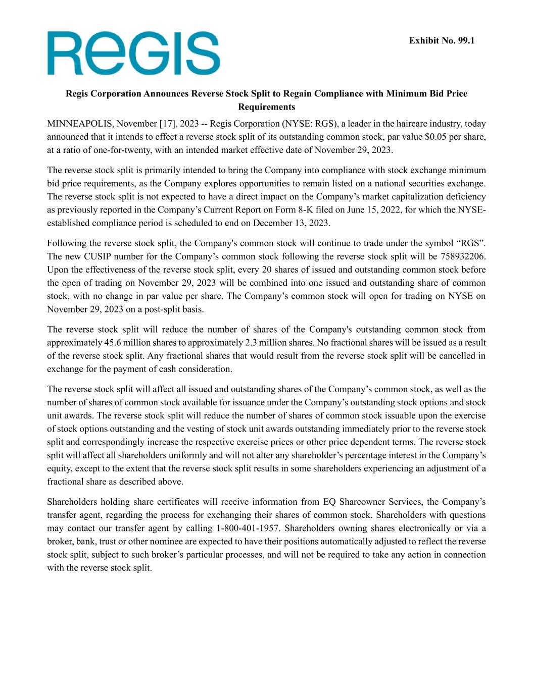 Exhibit No. 99.1 Regis Corporation Announces Reverse Stock Split to Regain Compliance with Minimum Bid Price Requirements MINNEAPOLIS, November [17], 2023 -- Regis Corporation (NYSE: RGS), a leader in the haircare industry, today announced that it intends to effect a reverse stock split of its outstanding common stock, par value $0.05 per share, at a ratio of one-for-twenty, with an intended market effective date of November 29, 2023. The reverse stock split is primarily intended to bring the Company into compliance with stock exchange minimum bid price requirements, as the Company explores opportunities to remain listed on a national securities exchange. The reverse stock split is not expected to have a direct impact on the Company’s market capitalization deficiency as previously reported in the Company’s Current Report on Form 8-K filed on June 15, 2022, for which the NYSE- established compliance period is scheduled to end on December 13, 2023. Following the reverse stock split, the Company's common stock will continue to trade under the symbol “RGS”. The new CUSIP number for the Company’s common stock following the reverse stock split will be 758932206. Upon the effectiveness of the reverse stock split, every 20 shares of issued and outstanding common stock before the open of trading on November 29, 2023 will be combined into one issued and outstanding share of common stock, with no change in par value per share. The Company’s common stock will open for trading on NYSE on November 29, 2023 on a post-split basis. The reverse stock split will reduce the number of shares of the Company's outstanding common stock from approximately 45.6 million shares to approximately 2.3 million shares. No fractional shares will be issued as a result of the reverse stock split. Any fractional shares that would result from the reverse stock split will be cancelled in exchange for the payment of cash consideration. The reverse stock split will affect all issued and outstanding shares of the Company’s common stock, as well as the number of shares of common stock available for issuance under the Company’s outstanding stock options and stock unit awards. The reverse stock split will reduce the number of shares of common stock issuable upon the exercise of stock options outstanding and the vesting of stock unit awards outstanding immediately prior to the reverse stock split and correspondingly increase the respective exercise prices or other price dependent terms. The reverse stock split will affect all shareholders uniformly and will not alter any shareholder’s percentage interest in the Company’s equity, except to the extent that the reverse stock split results in some shareholders experiencing an adjustment of a fractional share as described above. Shareholders holding share certificates will receive information from EQ Shareowner Services, the Company’s transfer agent, regarding the process for exchanging their shares of common stock. Shareholders with questions may contact our transfer agent by calling 1-800-401-1957. Shareholders owning shares electronically or via a broker, bank, trust or other nominee are expected to have their positions automatically adjusted to reflect the reverse stock split, subject to such broker’s particular processes, and will not be required to take any action in connection with the reverse stock split.