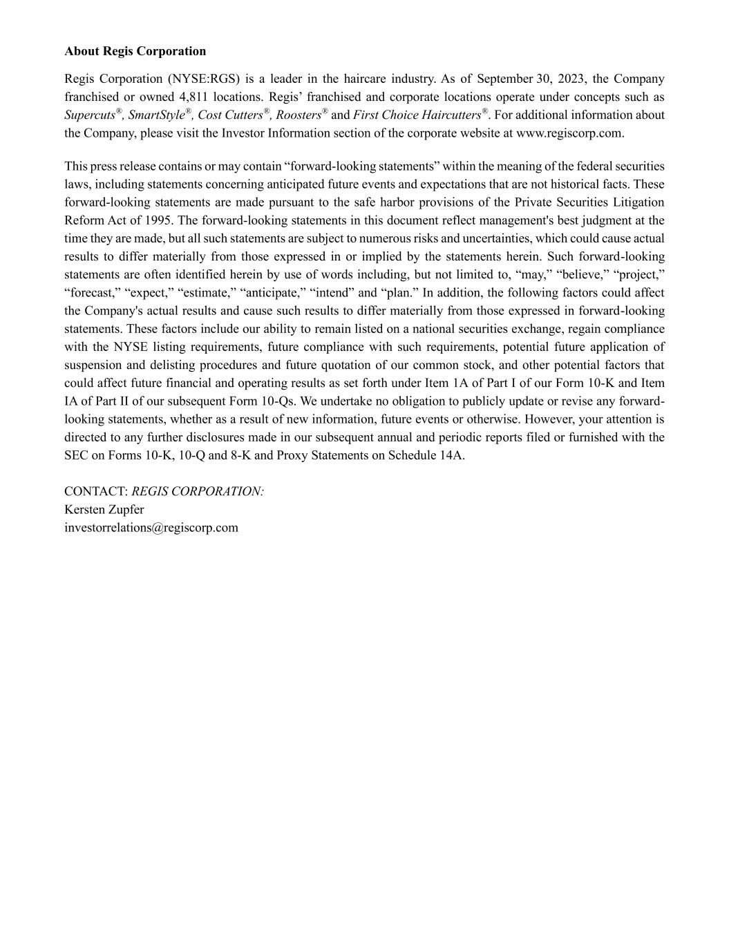 About Regis Corporation Regis Corporation (NYSE:RGS) is a leader in the haircare industry. As of September 30, 2023, the Company franchised or owned 4,811 locations. Regis’ franchised and corporate locations operate under concepts such as Supercuts®, SmartStyle®, Cost Cutters®, Roosters® and First Choice Haircutters®. For additional information about the Company, please visit the Investor Information section of the corporate website at www.regiscorp.com. This press release contains or may contain “forward-looking statements” within the meaning of the federal securities laws, including statements concerning anticipated future events and expectations that are not historical facts. These forward-looking statements are made pursuant to the safe harbor provisions of the Private Securities Litigation Reform Act of 1995. The forward-looking statements in this document reflect management's best judgment at the time they are made, but all such statements are subject to numerous risks and uncertainties, which could cause actual results to differ materially from those expressed in or implied by the statements herein. Such forward-looking statements are often identified herein by use of words including, but not limited to, “may,” “believe,” “project,” “forecast,” “expect,” “estimate,” “anticipate,” “intend” and “plan.” In addition, the following factors could affect the Company's actual results and cause such results to differ materially from those expressed in forward-looking statements. These factors include our ability to remain listed on a national securities exchange, regain compliance with the NYSE listing requirements, future compliance with such requirements, potential future application of suspension and delisting procedures and future quotation of our common stock, and other potential factors that could affect future financial and operating results as set forth under Item 1A of Part I of our Form 10-K and Item IA of Part II of our subsequent Form 10-Qs. We undertake no obligation to publicly update or revise any forward- looking statements, whether as a result of new information, future events or otherwise. However, your attention is directed to any further disclosures made in our subsequent annual and periodic reports filed or furnished with the SEC on Forms 10-K, 10-Q and 8-K and Proxy Statements on Schedule 14A. CONTACT: REGIS CORPORATION: Kersten Zupfer investorrelations@regiscorp.com