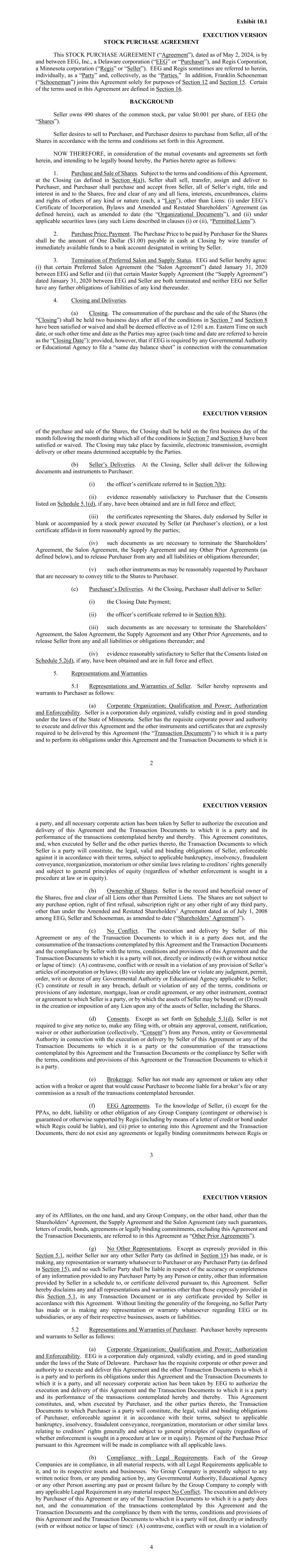 Exhibit 10.1 EXECUTION VERSION STOCK PURCHASE AGREEMENT This STOCK PURCHASE AGREEMENT (“Agreement”), dated as of May 2, 2024, is by and between EEG, Inc., a Delaware corporation (“EEG” or “Purchaser”), and Regis Corporation, a Minnesota corporation (“Regis” or “Seller”). EEG and Regis sometimes are referred to herein, individually, as a “Party” and, collectively, as the “Parties.” In addition, Franklin Schoeneman (“Schoeneman”) joins this Agreement solely for purposes of Section 12 and Section 15. Certain of the terms used in this Agreement are defined in Section 16. BACKGROUND Seller owns 490 shares of the common stock, par value $0.001 per share, of EEG (the “Shares”). Seller desires to sell to Purchaser, and Purchaser desires to purchase from Seller, all of the Shares in accordance with the terms and conditions set forth in this Agreement. NOW THEREFORE, in consideration of the mutual covenants and agreements set forth herein, and intending to be legally bound hereby, the Parties hereto agree as follows: 1. Purchase and Sale of Shares. Subject to the terms and conditions of this Agreement, at the Closing (as defined in Section 4(a)), Seller shall sell, transfer, assign and deliver to Purchaser, and Purchaser shall purchase and accept from Seller, all of Seller’s right, title and interest in and to the Shares, free and clear of any and all liens, interests, encumbrances, claims and rights of others of any kind or nature (each, a “Lien”), other than Liens: (i) under EEG’s Certificate of Incorporation, Bylaws and Amended and Restated Shareholders’ Agreement (as defined herein), each as amended to date (the “Organizational Documents”), and (ii) under applicable securities laws (any such Liens described in clauses (i) or (ii), “Permitted Liens”). 2. Purchase Price; Payment. The Purchase Price to be paid by Purchaser for the Shares shall be the amount of One Dollar ($1.00) payable in cash at Closing by wire transfer of immediately available funds to a bank account designated in writing by Seller. 3. Termination of Preferred Salon and Supply Status. EEG and Seller hereby agree: (i) that certain Preferred Salon Agreement (the “Salon Agreement”) dated January 31, 2020 between EEG and Seller and (ii) that certain Master Supply Agreement (the “Supply Agreement”) dated January 31, 2020 between EEG and Seller are both terminated and neither EEG nor Seller have any further obligations of liabilities of any kind thereunder. 4. Closing and Deliveries. (a) Closing. The consummation of the purchase and the sale of the Shares (the “Closing”) shall be held two business days after all of the conditions in Section 7 and Section 8 have been satisfied or waived and shall be deemed effective as of 12:01 a.m. Eastern Time on such date, or such other time and date as the Parties may agree (such time and date are referred to herein as the “Closing Date”); provided, however, that if EEG is required by any Governmental Authority or Educational Agency to file a “same day balance sheet” in connection with the consummation EXECUTION VERSION 2 of the purchase and sale of the Shares, the Closing shall be held on the first business day of the month following the month during which all of the conditions in Section 7 and Section 8 have been satisfied or waived. The Closing may take place by facsimile, electronic transmission, overnight delivery or other means determined acceptable by the Parties. (b) Seller’s Deliveries. At the Closing, Seller shall deliver the following documents and instruments to Purchaser: (i) the officer’s certificate referred to in Section 7(b); (ii) evidence reasonably satisfactory to Purchaser that the Consents listed on Schedule 5.1(d), if any, have been obtained and are in full force and effect; (iii) the certificates representing the Shares, duly endorsed by Seller in blank or accompanied by a stock power executed by Seller (at Purchaser’s election), or a lost certificate affidavit in form reasonably agreed by the parties; (iv) such documents as are necessary to terminate the Shareholders’ Agreement, the Salon Agreement, the Supply Agreement and any Other Prior Agreements (as defined below), and to release Purchaser from any and all liabilities or obligations thereunder; (v) such other instruments as may be reasonably requested by Purchaser that are necessary to convey title to the Shares to Purchaser. (c) Purchaser’s Deliveries. At the Closing, Purchaser shall deliver to Seller: (i) the Closing Date Payment; (ii) the officer’s certificate referred to in Section 8(b); (iii) such documents as are necessary to terminate the Shareholders’ Agreement, the Salon Agreement, the Supply Agreement and any Other Prior Agreements, and to release Seller from any and all liabilities or obligations thereunder; and (iv) evidence reasonably satisfactory to Seller that the Consents listed on Schedule 5.2(d), if any, have been obtained and are in full force and effect. 5. Representations and Warranties. 5.1 Representations and Warranties of Seller. Seller hereby represents and warrants to Purchaser as follows: (a) Corporate Organization; Qualification and Power; Authorization and Enforceability. Seller is a corporation duly organized, validly existing and in good standing under the laws of the State of Minnesota. Seller has the requisite corporate power and authority to execute and deliver this Agreement and the other instruments and certificates that are expressly required to be delivered by this Agreement (the “Transaction Documents”) to which it is a party and to perform its obligations under this Agreement and the Transaction Documents to which it is EXECUTION VERSION 3 a party, and all necessary corporate action has been taken by Seller to authorize the execution and delivery of this Agreement and the Transaction Documents to which it is a party and its performance of the transactions contemplated hereby and thereby. 