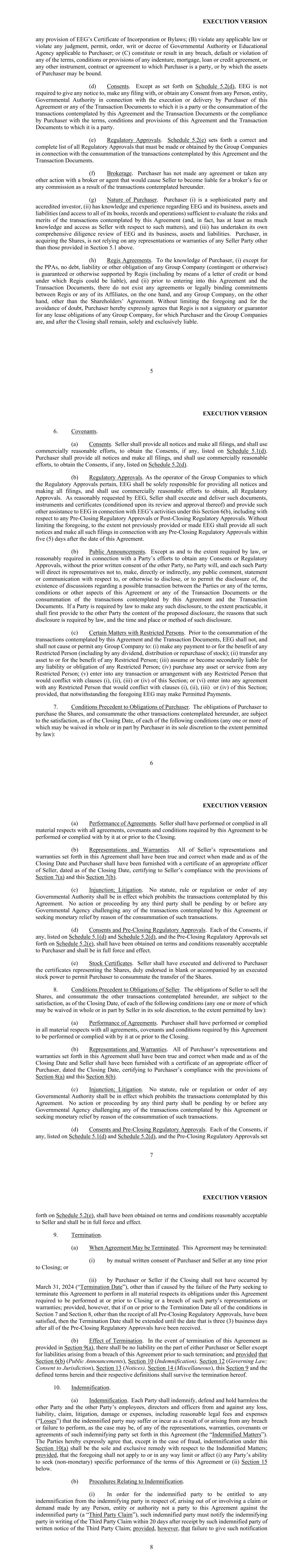 EXECUTION VERSION 5 any provision of EEG’s Certificate of Incorporation or Bylaws; (B) violate any applicable law or violate any judgment, permit, order, writ or decree of Governmental Authority or Educational Agency applicable to Purchaser; or (C) constitute or result in any breach, default or violation of any of the terms, conditions or provisions of any indenture, mortgage, loan or credit agreement, or any other instrument, contract or agreement to which Purchaser is a party, or by which the assets of Purchaser may be bound. (d) Consents. Except as set forth on Schedule 5.2(d), EEG is not required to give any notice to, make any filing with, or obtain any Consent from any Person, entity, Governmental Authority in connection with the execution or delivery by Purchaser of this Agreement or any of the Transaction Documents to which it is a party or the consummation of the transactions contemplated by this Agreement and the Transaction Documents or the compliance by Purchaser with the terms, conditions and provisions of this Agreement and the Transaction Documents to which it is a party. (e) Regulatory Approvals. Schedule 5.2(e) sets forth a correct and complete list of all Regulatory Approvals that must be made or obtained by the Group Companies in connection with the consummation of the transactions contemplated by this Agreement and the Transaction Documents. (f) Brokerage. Purchaser has not made any agreement or taken any other action with a broker or agent that would cause Seller to become liable for a broker’s fee or any commission as a result of the transactions contemplated hereunder. (g) Nature of Purchaser. Purchaser (i) is a sophisticated party and accredited investor, (ii) has knowledge and experience regarding EEG and its business, assets and liabilities (and access to all of its books, records and operations) sufficient to evaluate the risks and merits of the transactions contemplated by this Agreement (and, in fact, has at least as much knowledge and access as Seller with respect to such matters), and (iii) has undertaken its own comprehensive diligence review of EEG and its business, assets and liabilities. Purchaser, in acquiring the Shares, is not relying on any representations or warranties of any Seller Party other than those provided in Section 5.1 above. (h) Regis Agreements. To the knowledge of Purchaser, (i) except for the PPAs, no debt, liability or other obligation of any Group Company (contingent or otherwise) is guaranteed or otherwise supported by Regis (including by means of a letter of credit or bond under which Regis could be liable), and (ii) prior to entering into this Agreement and the Transaction Documents, there do not exist any agreements or legally binding commitments between Regis or any of its Affiliates, on the one hand, and any Group Company, on the other hand, other than the Shareholders’ Agreement. Without limiting the foregoing and for the avoidance of doubt, Purchaser hereby expressly agrees that Regis is not a signatory or guarantor for any lease obligations of any Group Company, for which Purchaser and the Group Companies are, and after the Closing shall remain, solely and exclusively liable. EXECUTION VERSION 6 6. Covenants. (a) Consents. Seller shall provide all notices and make all filings, and shall use commercially reasonable efforts, to obtain the Consents, if any, listed on Schedule 5.1(d). Purchaser shall provide all notices and make all filings, and shall use commercially reasonable efforts, to obtain the Consents, if any, listed on Schedule 5.2(d). (b) Regulatory Approvals. As the operator of the Group Companies to which the Regulatory Approvals pertain, EEG shall be solely responsible for providing all notices and making all filings, and shall use commercially reasonable efforts to obtain, all Regulatory Approvals. As reasonably requested by EEG, Seller shall execute and deliver such documents, instruments and certificates (conditioned upon its review and approval thereof) and provide such other assistance to EEG in connection with EEG’s activities under this Section 6(b), including with respect to any Pre-Closing Regulatory Approvals or Post-Closing Regulatory Approvals. Without limiting the foregoing, to the extent not previously provided or made EEG shall provide all such notices and make all such filings in connection with any Pre-Closing Regulatory Approvals within five (5) days after the date of this Agreement. (b) Public Announcements. Except as and to the extent required by law, or reasonably required in connection with a Party’s efforts to obtain any Consents or Regulatory Approvals, without the prior written consent of the other Party, no Party will, and each such Party will direct its representatives not to, make, directly or indirectly, any public comment, statement or communication with respect to, or otherwise to disclose, or to permit the disclosure of, the existence of discussions regarding a possible transaction between the Parties or any of the terms, conditions or other aspects of this Agreement or any of the Transaction Documents or the consummation of the transactions contemplated by this Agreement and the Transaction Documents. If a Party is required by law to make any such disclosure, to the extent practicable, it shall first provide to the other Party the content of the proposed disclosure, the reasons that such disclosure is required by law, and the time and place or method of such disclosure. (c) Certain Matters with Restricted Persons. Prior to the consummation of the transactions contemplated by this Agreement and the Transaction Documents, EEG shall not, and shall not cause or permit any Group Company to: (i) make any payment to or for the benefit of any Restricted Person (including by any dividend, distribution or repurchase of stock); (ii) transfer any asset to or for the benefit of any Restricted Person; (iii) assume or become secondarily liable for any liability or obligation of any Rest