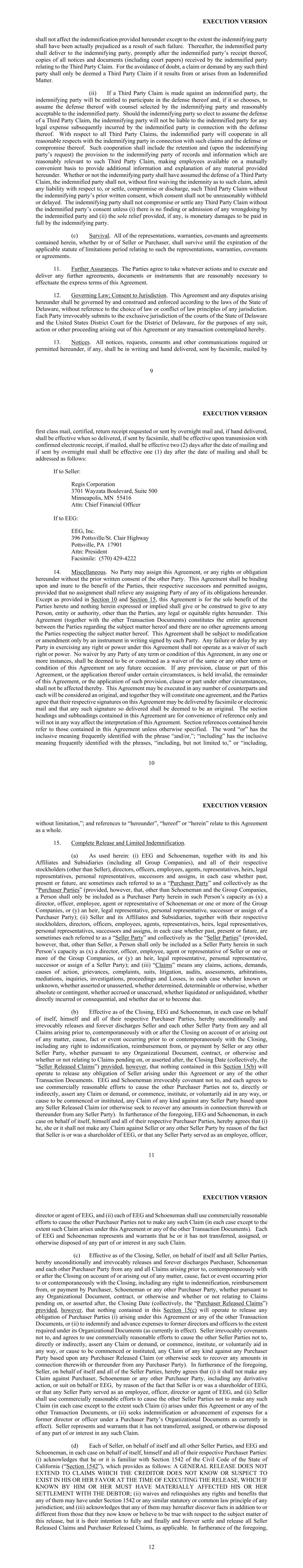 EXECUTION VERSION 9 shall not affect the indemnification provided hereunder except to the extent the indemnifying party shall have been actually prejudiced as a result of such failure. Thereafter, the indemnified party shall deliver to the indemnifying party, promptly after the indemnified party’s receipt thereof, copies of all notices and documents (including court papers) received by the indemnified party relating to the Third Party Claim. For the avoidance of doubt, a claim or demand by any such third party shall only be deemed a Third Party Claim if it results from or arises from an Indemnified Matter. (ii) If a Third Party Claim is made against an indemnified party, the indemnifying party will be entitled to participate in the defense thereof and, if it so chooses, to assume the defense thereof with counsel selected by the indemnifying party and reasonably acceptable to the indemnified party. Should the indemnifying party so elect to assume the defense of a Third Party Claim, the indemnifying party will not be liable to the indemnified party for any legal expense subsequently incurred by the indemnified party in connection with the defense thereof. With respect to all Third Party Claims, the indemnified party will cooperate in all reasonable respects with the indemnifying party in connection with such claims and the defense or compromise thereof. Such cooperation shall include the retention and (upon the indemnifying party’s request) the provision to the indemnifying party of records and information which are reasonably relevant to such Third Party Claim, making employees available on a mutually convenient basis to provide additional information and explanation of any material provided hereunder. Whether or not the indemnifying party shall have assumed the defense of a Third Party Claim, the indemnified party shall not, without first waiving the indemnity as to such claim, admit any liability with respect to, or settle, compromise or discharge, such Third Party Claim without the indemnifying party’s prior written consent, which consent shall not be unreasonably withheld or delayed. The indemnifying party shall not compromise or settle any Third Party Claim without the indemnified party’s consent unless (i) there is no finding or admission of any wrongdoing by the indemnified party and (ii) the sole relief provided, if any, is monetary damages to be paid in full by the indemnifying party. (c) Survival. All of the representations, warranties, covenants and agreements contained herein, whether by or of Seller or Purchaser, shall survive until the expiration of the applicable statute of limitations period relating to such the representations, warranties, covenants or agreements. 11. Further Assurances. The Parties agree to take whatever actions and to execute and deliver any further agreements, documents or instruments that are reasonably necessary to effectuate the express terms of this Agreement. 12. Governing Law; Consent to Jurisdiction. This Agreement and any disputes arising hereunder shall be governed by and construed and enforced according to the laws of the State of Delaware, without reference to the choice of law or conflict of law principles of any jurisdiction. Each Party irrevocably submits to the exclusive jurisdiction of the courts of the State of Delaware and the United States District Court for the District of Delaware, for the purposes of any suit, action or other proceeding arising out of this Agreement or any transaction contemplated hereby. 13. Notices. All notices, requests, consents and other communications required or permitted hereunder, if any, shall be in writing and hand delivered, sent by facsimile, mailed by EXECUTION VERSION 10 first class mail, certified, return receipt requested or sent by overnight mail and, if hand delivered, shall be effective when so delivered, if sent by facsimile, shall be effective upon transmission with confirmed electronic receipt, if mailed, shall be effective two (2) days after the date of mailing and if sent by overnight mail shall be effective one (1) day after the date of mailing and shall be addressed as follows: If to Seller: Regis Corporation 3701 Wayzata Boulevard, Suite 500 Minneapolis, MN 55416 Attn: Chief Financial Officer If to EEG: EEG, Inc. 396 Pottsville/St. Clair Highway Pottsville, PA 17901 Attn: President Facsimile: (570) 429-4222 14. Miscellaneous. No Party may assign this Agreement, or any rights or obligation hereunder without the prior written consent of the other Party. This Agreement shall be binding upon and inure to the benefit of the Parties, their respective successors and permitted assigns, provided that no assignment shall relieve any assigning Party of any of its obligations hereunder. Except as provided in Section 10 and Section 15, this Agreement is for the sole benefit of the Parties hereto and nothing herein expressed or implied shall give or be construed to give to any Person, entity or authority, other than the Parties, any legal or equitable rights hereunder. This Agreement (together with the other Transaction Documents) constitutes the entire agreement between the Parties regarding the subject matter hereof and there are no other agreements among the Parties respecting the subject matter hereof. This Agreement shall be subject to modification or amendment only by an instrument in writing signed by each Party. Any failure or delay by any Party in exercising any right or power under this Agreement shall not operate as a waiver of such right or power. No waiver by any Party of any term or condition of this Agreement, in any one or more instances, shall be deemed to be or construed as a waiver of the same or any other term or condition of this Agreement on any future occasion. If any provision, clause or part of this Agreement, or the application thereof under certain circumstances, is held invalid, the remainder of this Agreement, or the application of such provision, clause or part u