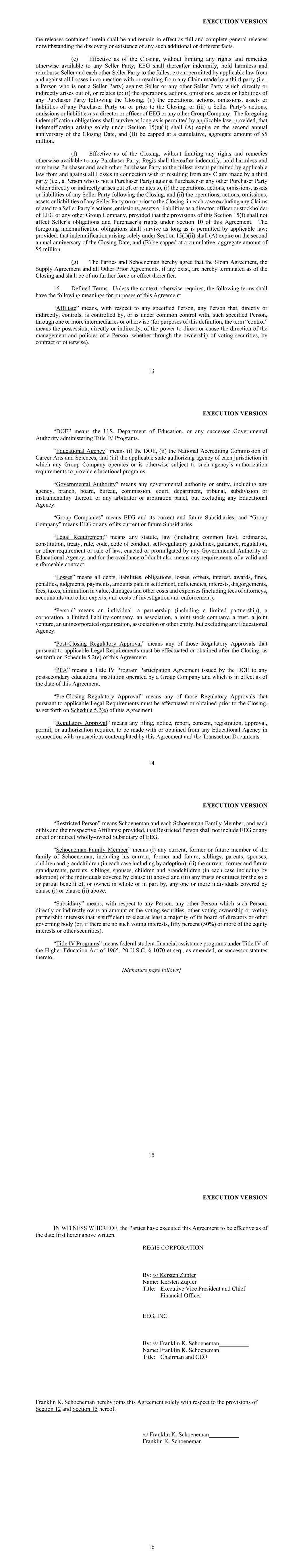 EXECUTION VERSION 13 the releases contained herein shall be and remain in effect as full and complete general releases notwithstanding the discovery or existence of any such additional or different facts. (e) Effective as of the Closing, without limiting any rights and remedies otherwise available to any Seller Party, EEG shall thereafter indemnify, hold harmless and reimburse Seller and each other Seller Party to the fullest extent permitted by applicable law from and against all Losses in connection with or resulting from any Claim made by a third party (i.e., a Person who is not a Seller Party) against Seller or any other Seller Party which directly or indirectly arises out of, or relates to: (i) the operations, actions, omissions, assets or liabilities of any Purchaser Party following the Closing; (ii) the operations, actions, omissions, assets or liabilities of any Purchaser Party on or prior to the Closing; or (iii) a Seller Party’s actions, omissions or liabilities as a director or officer of EEG or any other Group Company. The foregoing indemnification obligations shall survive as long as is permitted by applicable law; provided, that indemnification arising solely under Section 15(e)(ii) shall (A) expire on the second annual anniversary of the Closing Date, and (B) be capped at a cumulative, aggregate amount of $5 million. (f) Effective as of the Closing, without limiting any rights and remedies otherwise available to any Purchaser Party, Regis shall thereafter indemnify, hold harmless and reimburse Purchaser and each other Purchaser Party to the fullest extent permitted by applicable law from and against all Losses in connection with or resulting from any Claim made by a third party (i.e., a Person who is not a Purchaser Party) against Purchaser or any other Purchaser Party which directly or indirectly arises out of, or relates to, (i) the operations, actions, omissions, assets or liabilities of any Seller Party following the Closing, and (ii) the operations, actions, omissions, assets or liabilities of any Seller Party on or prior to the Closing, in each case excluding any Claims related to a Seller Party’s actions, omissions, assets or liabilities as a director, officer or stockholder of EEG or any other Group Company, provided that the provisions of this Section 15(f) shall not affect Seller’s obligations and Purchaser’s rights under Section 10 of this Agreement. The foregoing indemnification obligations shall survive as long as is permitted by applicable law; provided, that indemnification arising solely under Section 15(f)(ii) shall (A) expire on the second annual anniversary of the Closing Date, and (B) be capped at a cumulative, aggregate amount of $5 million. (g) The Parties and Schoeneman hereby agree that the Sloan Agreement, the Supply Agreement and all Other Prior Agreements, if any exist, are hereby terminated as of the Closing and shall be of no further force or effect thereafter. 16. Defined Terms. Unless the context otherwise requires, the following terms shall have the following meanings for purposes of this Agreement: “Affiliate” means, with respect to any specified Person, any Person that, directly or indirectly, controls, is controlled by, or is under common control with, such specified Person, through one or more intermediaries or otherwise (for purposes of this definition, the term “control” means the possession, directly or indirectly, of the power to direct or cause the direction of the management and policies of a Person, whether through the ownership of voting securities, by contract or otherwise). EXECUTION VERSION 14 “DOE” means the U.S. Department of Education, or any successor Governmental Authority administering Title IV Programs. “Educational Agency” means (i) the DOE, (ii) the National Accrediting Commission of Career Arts and Sciences, and (iii) the applicable state authorizing agency of each jurisdiction in which any Group Company operates or is otherwise subject to such agency’s authorization requirements to provide educational programs. “Governmental Authority” means any governmental authority or entity, including any agency, branch, board, bureau, commission, court, department, tribunal, subdivision or instrumentality thereof, or any arbitrator or arbitration panel, but excluding any Educational Agency. “Group Companies” means EEG and its current and future Subsidiaries; and “Group Company” means EEG or any of its current or future Subsidiaries. “Legal Requirement” means any statute, law (including common law), ordinance, constitution, treaty, rule, code, code of conduct, self-regulatory guidelines, guidance, regulation, or other requirement or rule of law, enacted or promulgated by any Governmental Authority or Educational Agency, and for the avoidance of doubt also means any requirements of a valid and enforceable contract. “Losses” means all debts, liabilities, obligations, losses, offsets, interest, awards, fines, penalties, judgments, payments, amounts paid in settlement, deficiencies, interests, disgorgements, fees, taxes, diminution in value, damages and other costs and expenses (including fees of attorneys, accountants and other experts, and costs of investigation and enforcement). “Person” means an individual, a partnership (including a limited partnership), a corporation, a limited liability company, an association, a joint stock company, a trust, a joint venture, an unincorporated organization, association or other entity, but excluding any Educational Agency. “Post-Closing Regulatory Approval” means any of those Regulatory Approvals that pursuant to applicable Legal Requirements must be effectuated or obtained after the Closing, as set forth on Schedule 5.2(e) of this Agreement. “PPA” means a Title IV Program Participation Agreement issued by the DOE to any postsecondary educational institution operated by a Group Company and which is in effect as of the date of this Agre