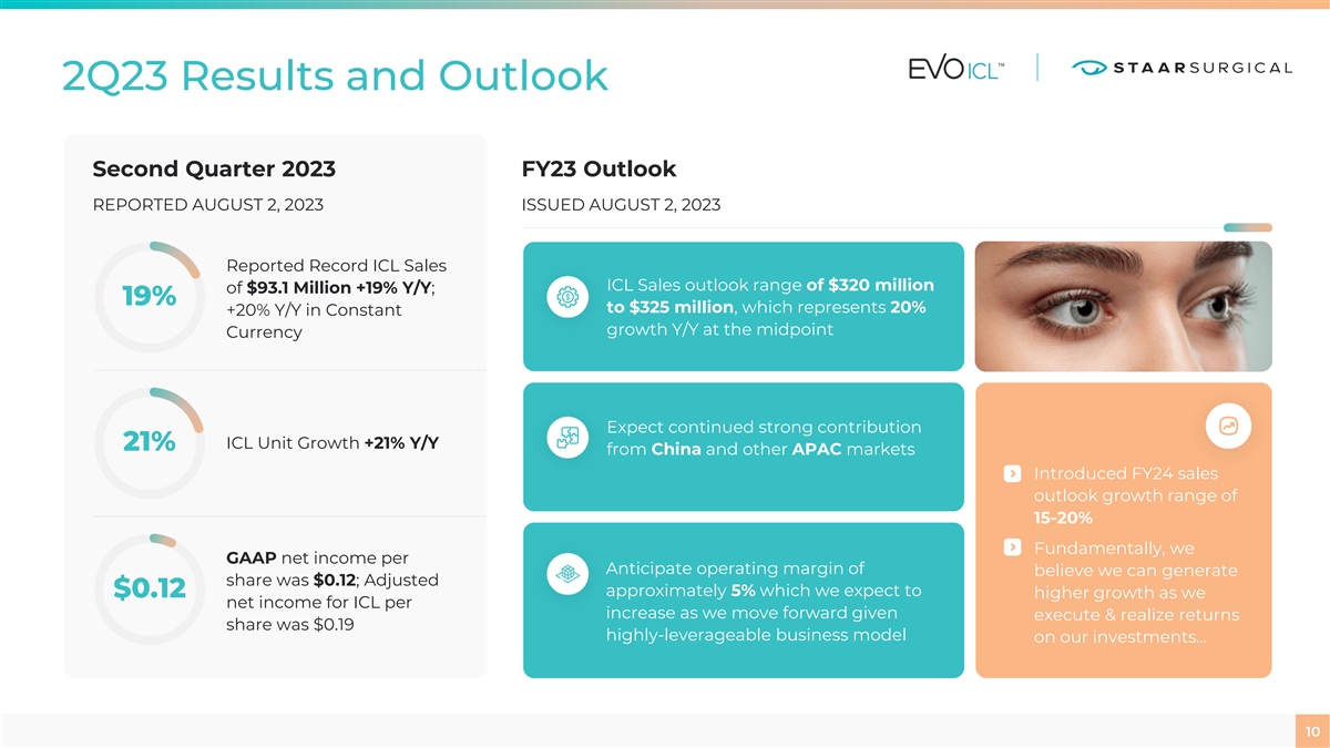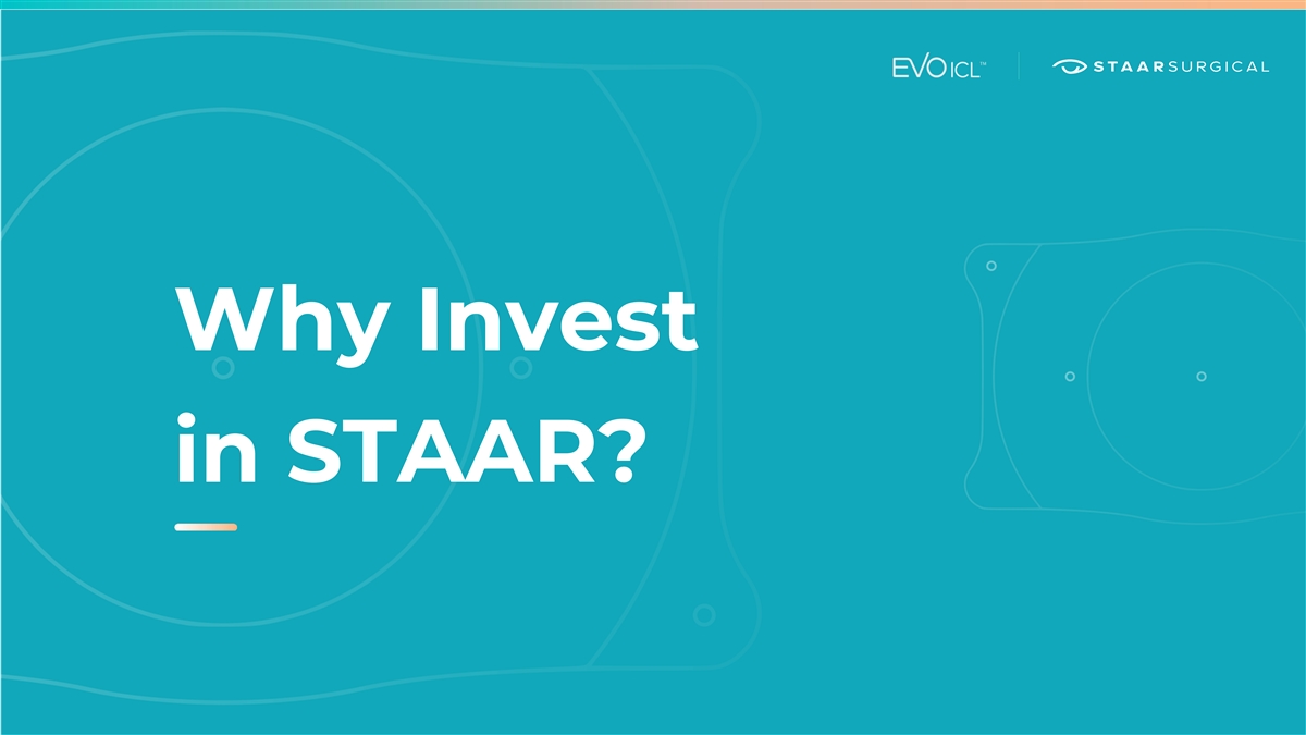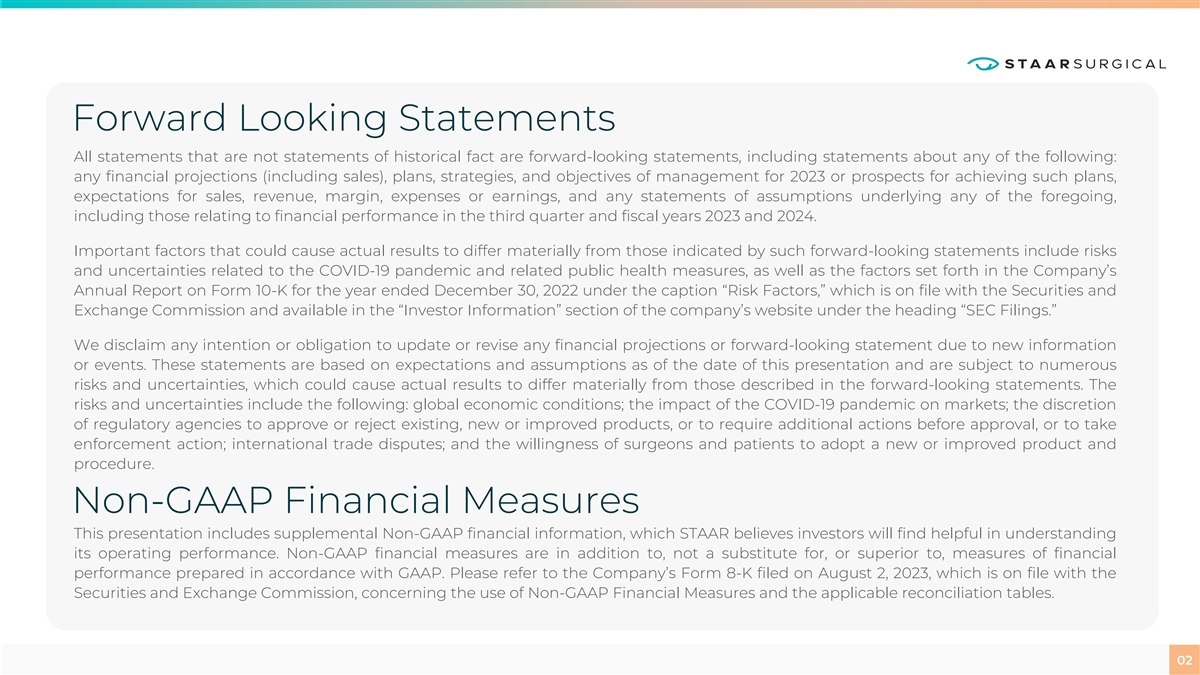 Forward Looking Statements All statements that are not statements of historical fact are forward-looking statements, including statements about any of the following: any financial projections (including sales), plans, strategies, and objectives of management for 2023 or prospects for achieving such plans, expectations for sales, revenue, margin, expenses or earnings, and any statements of assumptions underlying any of the foregoing, including those relating to financial performance in the third quarter and fiscal years 2023 and 2024. Important factors that could cause actual results to differ materially from those indicated by such forward-looking statements include risks and uncertainties related to the COVID-19 pandemic and related public health measures, as well as the factors set forth in the Company’s Annual Report on Form 10-K for the year ended December 30, 2022 under the caption “Risk Factors,” which is on file with the Securities and Exchange Commission and available in the “Investor Information” section of the company’s website under the heading “SEC Filings.” We disclaim any intention or obligation to update or revise any financial projections or forward-looking statement due to new information or events. These statements are based on expectations and assumptions as of the date of this presentation and are subject to numerous risks and uncertainties, which could cause actual results to differ materially from those described in the forward-looking statements. The risks and uncertainties include the following: global economic conditions; the impact of the COVID-19 pandemic on markets; the discretion of regulatory agencies to approve or reject existing, new or improved products, or to require additional actions before approval, or to take enforcement action; international trade disputes; and the willingness of surgeons and patients to adopt a new or improved product and procedure. Non-GAAP Financial Measures This presentation includes supplemental Non-GAAP financial information, which STAAR believes investors will find helpful in understanding its operating performance. Non-GAAP financial measures are in addition to, not a substitute for, or superior to, measures of financial performance prepared in accordance with GAAP. Please refer to the Company’s Form 8-K filed on August 2, 2023, which is on file with the Securities and Exchange Commission, concerning the use of Non-GAAP Financial Measures and the applicable reconciliation tables. 02