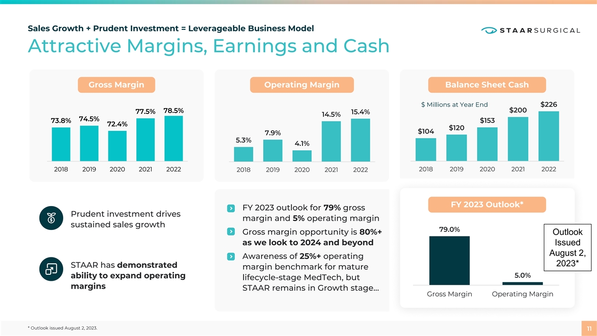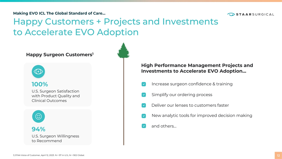 Sales Growth + Prudent Investment = Leverageable Business Model Attractive Margins, Earnings and Cash Gross Margin Operating Margin Balance Sheet Cash $ Millions at Year End $226 $200 78.5% 77.5% 15.4% 14.5% 74.5% 73.8% $153 72.4% $120 $104 7.9% 5.3% 4.1% 2018 2019 2020 2021 2022 2018 2019 2020 2021 2022 2018 2019 2020 2021 2022 FY 2023 Outlook* FY 2023 outlook for 79% gross Prudent investment drives margin and 5% operating margin sustained sales growth 79.0% Gross margin opportunity is 80%+ Outlook as we look to 2024 and beyond Issued August 2, Awareness of 25%+ operating 2023* STAAR has demonstrated margin benchmark for mature 5.0% ability to expand operating lifecycle-stage MedTech, but margins STAAR remains in Growth stage… Gross Margin Operating Margin * Outlook issued August 2, 2023. 11