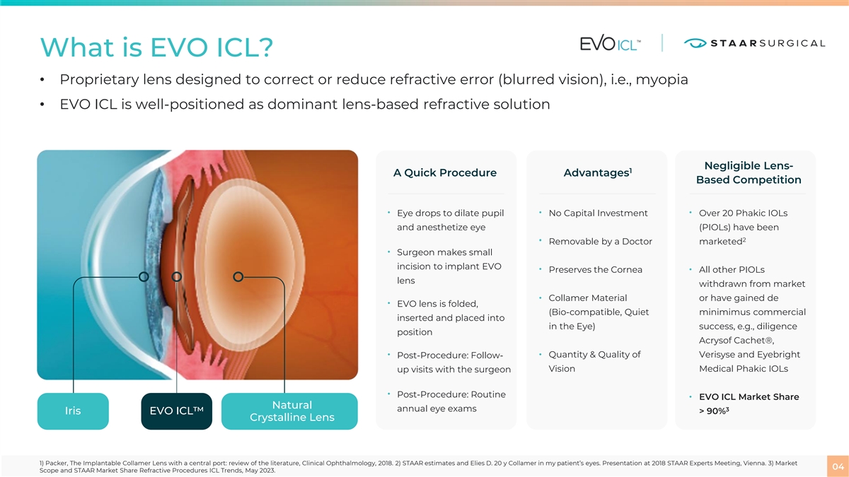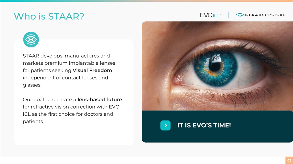 Who is STAAR? STAAR develops, manufactures and markets premium implantable lenses for patients seeking Visual Freedom independent of contact lenses and glasses. Our goal is to create a lens-based future for refractive vision correction with EVO ICL as the first choice for doctors and patients IT IS EVO’S TIME! 03