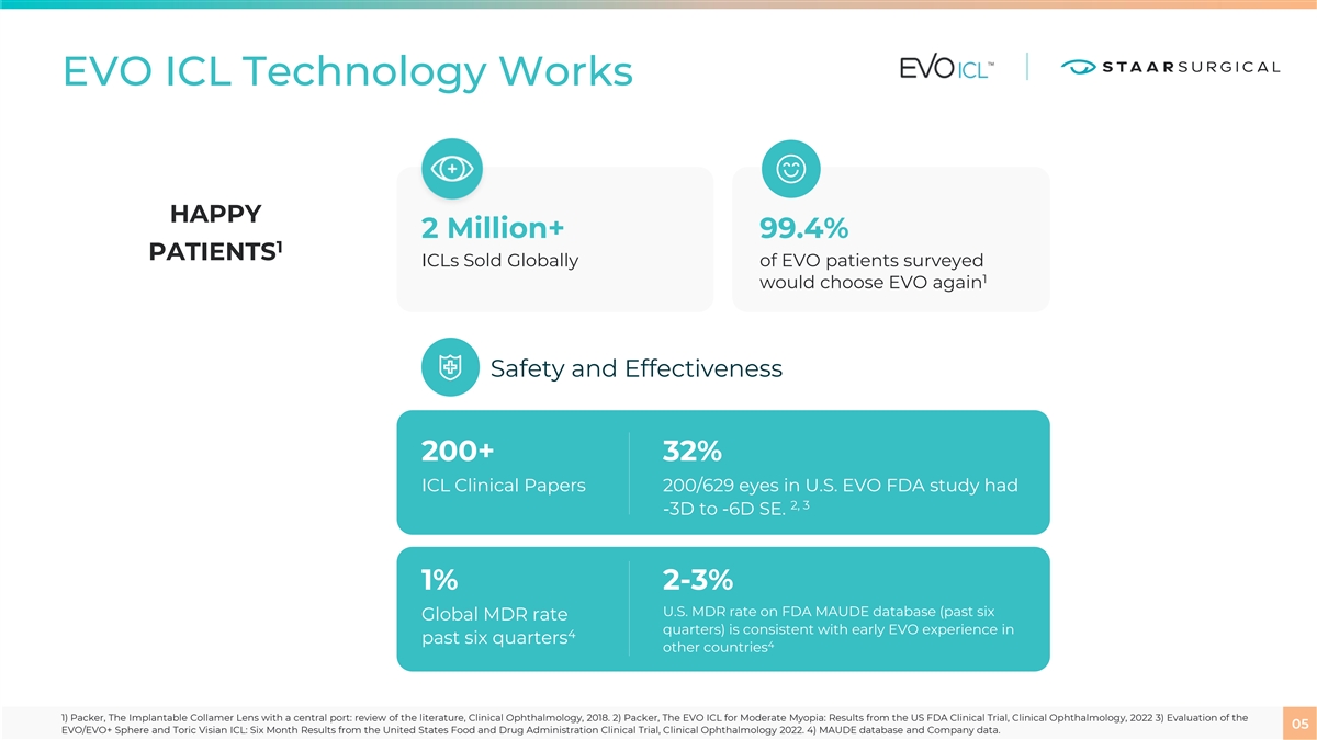 EVO ICL Technology Works HAPPY 2 Million+ 99.4% 1 PATIENTS ICLs Sold Globally of EVO patients surveyed 1 would choose EVO again Safety and Effectiveness 200+ 32% ICL Clinical Papers 200/629 eyes in U.S. EVO FDA study had 2, 3 -3D to -6D SE. 1% 2-3% U.S. MDR rate on FDA MAUDE database (past six Global MDR rate quarters) is consistent with early EVO experience in 4 past six quarters 4 other countries 1) Packer, The Implantable Collamer Lens with a central port: review of the literature, Clinical Ophthalmology, 2018. 2) Packer, The EVO ICL for Moderate Myopia: Results from the US FDA Clinical Trial, Clinical Ophthalmology, 2022 3) Evaluation of the 05 EVO/EVO+ Sphere and Toric Visian ICL: Six Month Results from the United States Food and Drug Administration Clinical Trial, Clinical Ophthalmology 2022. 4) MAUDE database and Company data.